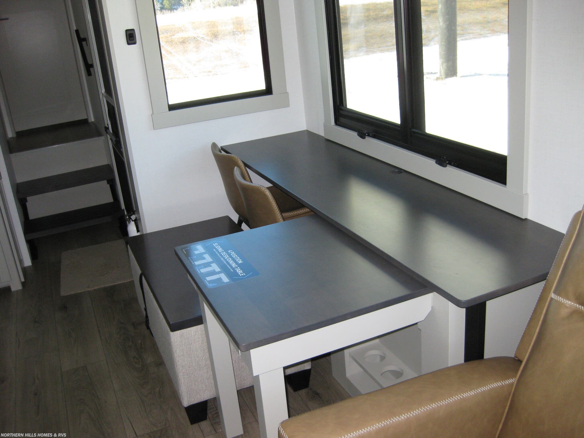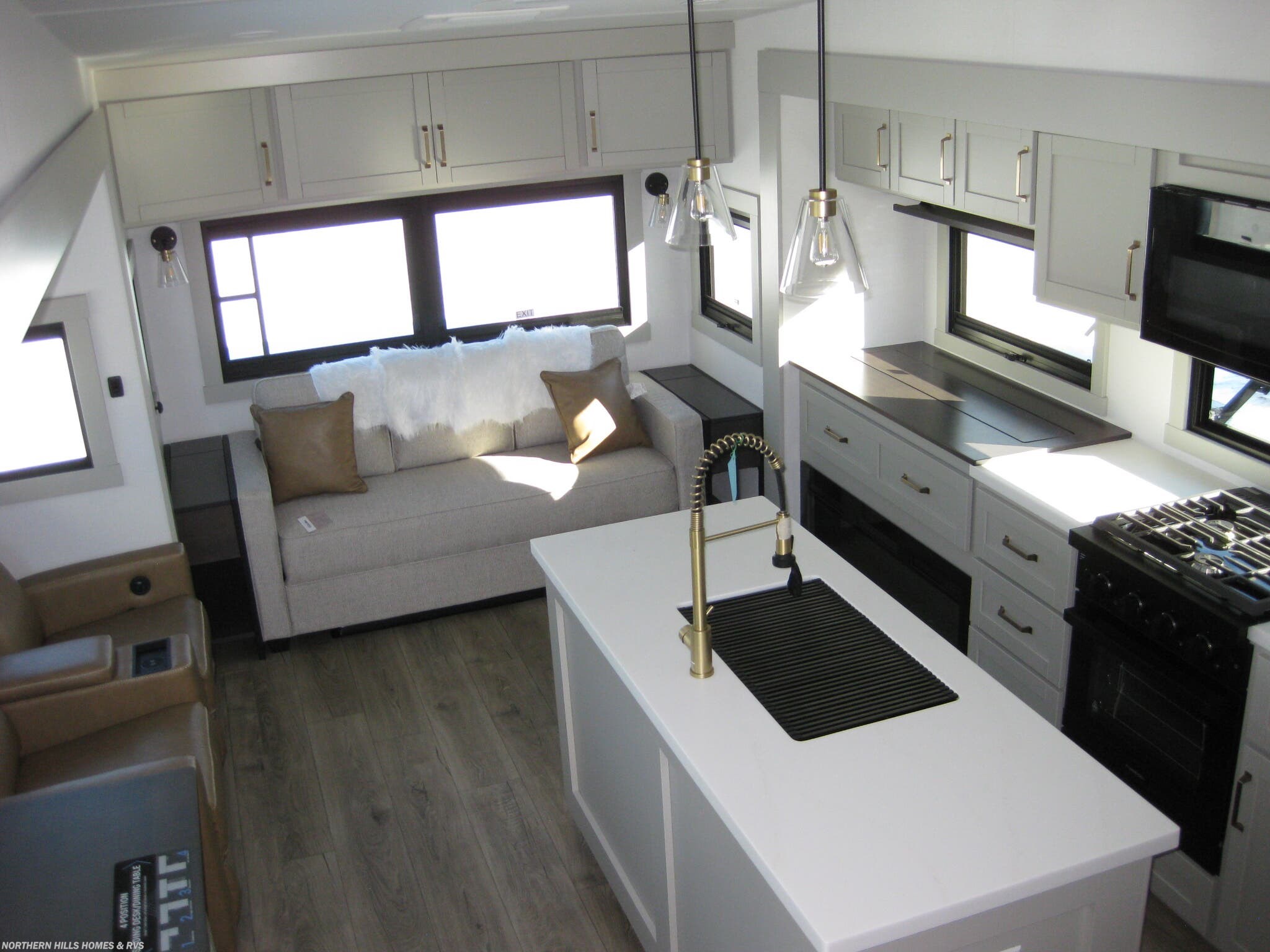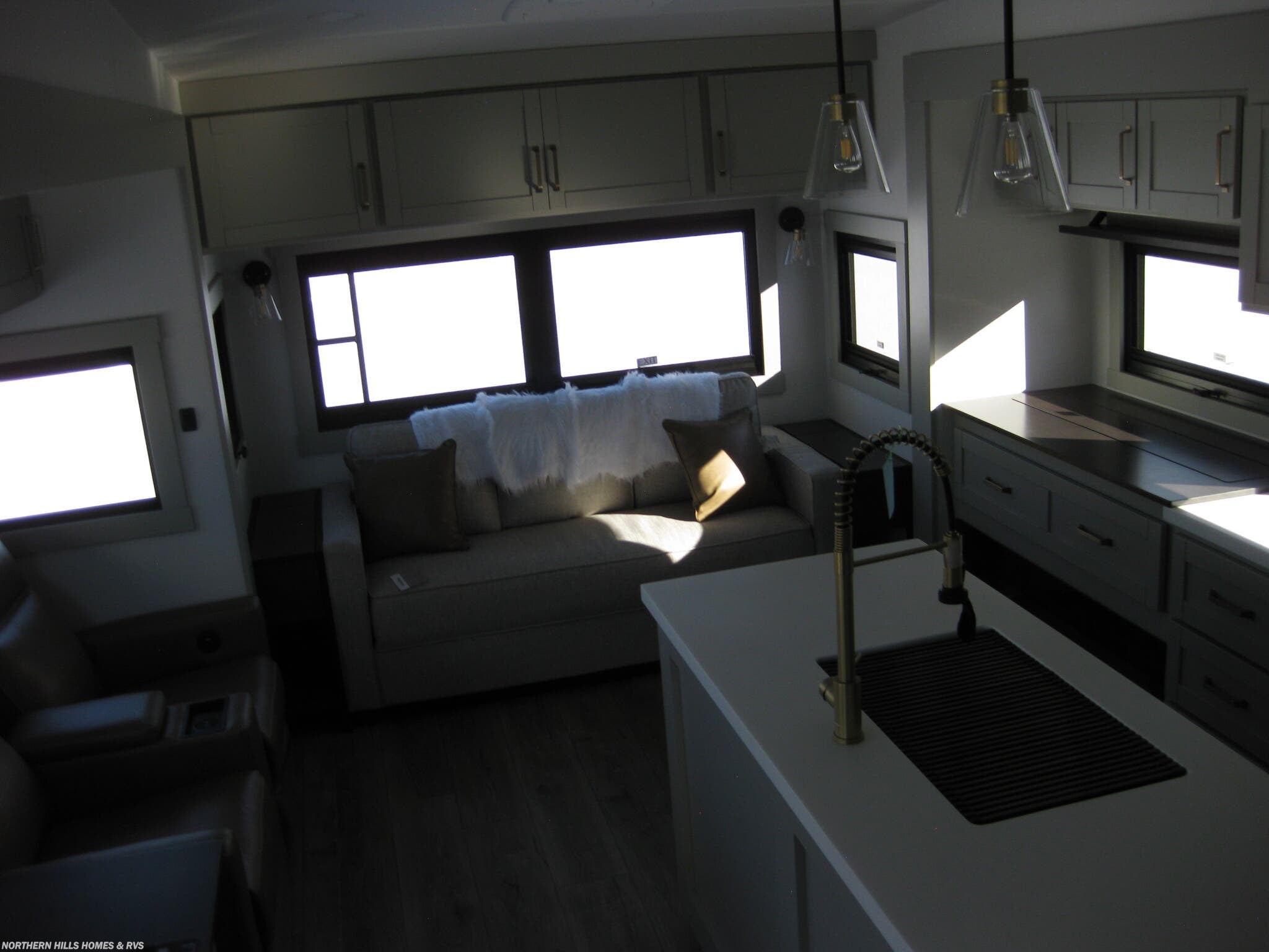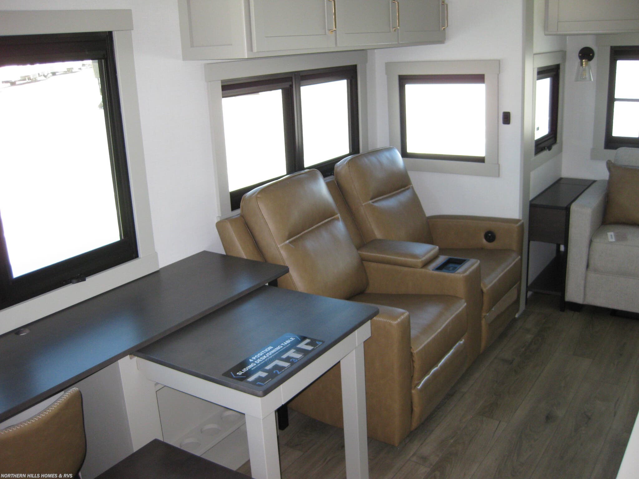 The Model Z is built for comfort with several high-end features commonly found in motorhomes, now available in a towable RV. Inside, you’ll find solid surface countertops, a dinette, a spacious pantry, and a medicine cabinet that keep daily life organized. The theater seating invites relaxing evenings, while the queen bed ensures restful nights after outdoor adventures. A washer and dryer are ready for prep, complemented by a full set of appliances including a microwave, dishwasher, refrigerator, and shower. The interior is designed to feel larger thanks to well-placed storage and the bright, residential ambiance that RV enthusiasts crave.