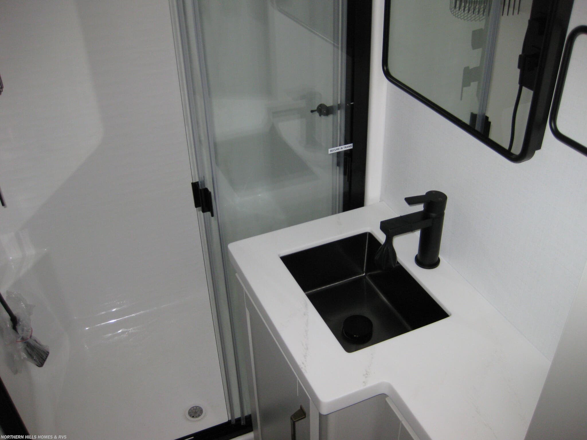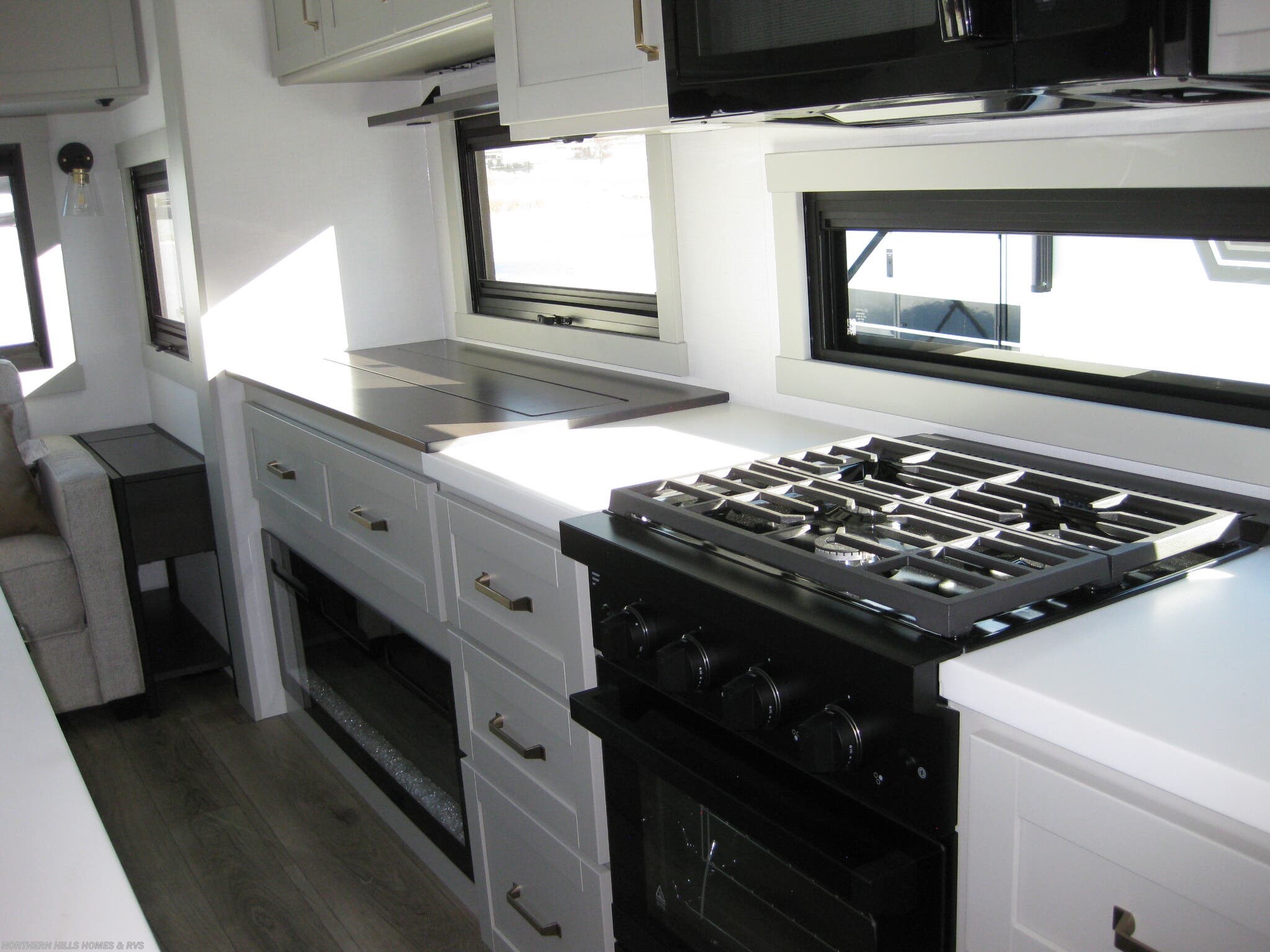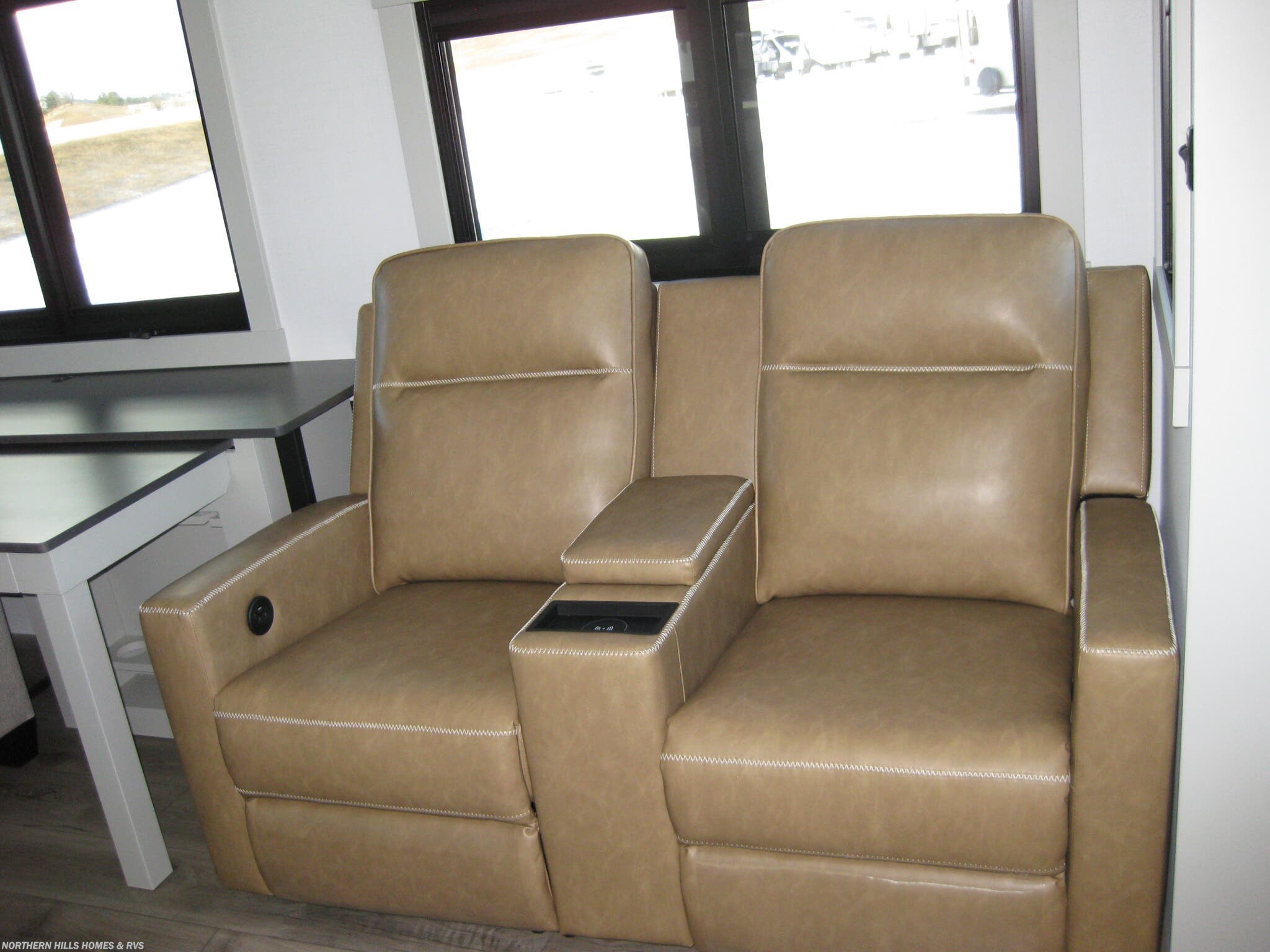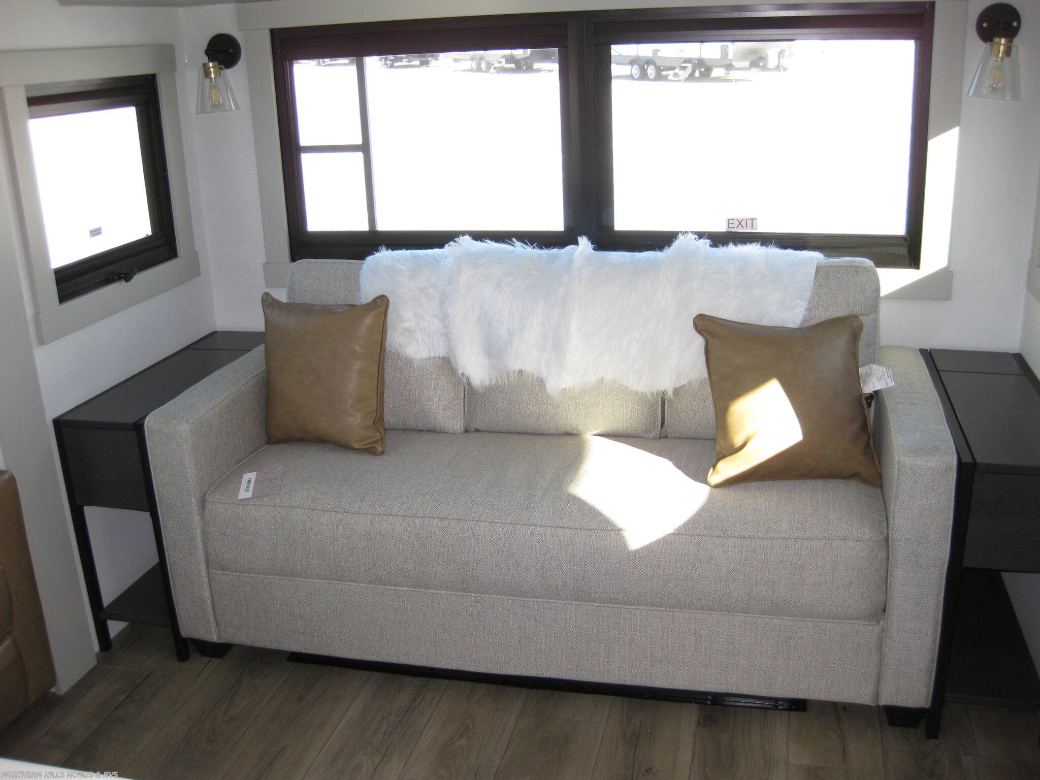 The Model Z is built for comfort with several high-end features commonly found in motorhomes, now available in a towable RV. Inside, you’ll find solid surface countertops, a dinette, a spacious pantry, and a medicine cabinet that keep daily life organized. The theater seating invites relaxing evenings, while the queen bed ensures restful nights after outdoor adventures. A washer and dryer are ready for prep, complemented by a full set of appliances including a microwave, dishwasher, refrigerator, and shower. The interior is designed to feel larger thanks to well-placed storage and the bright, residential ambiance that RV enthusiasts crave.
