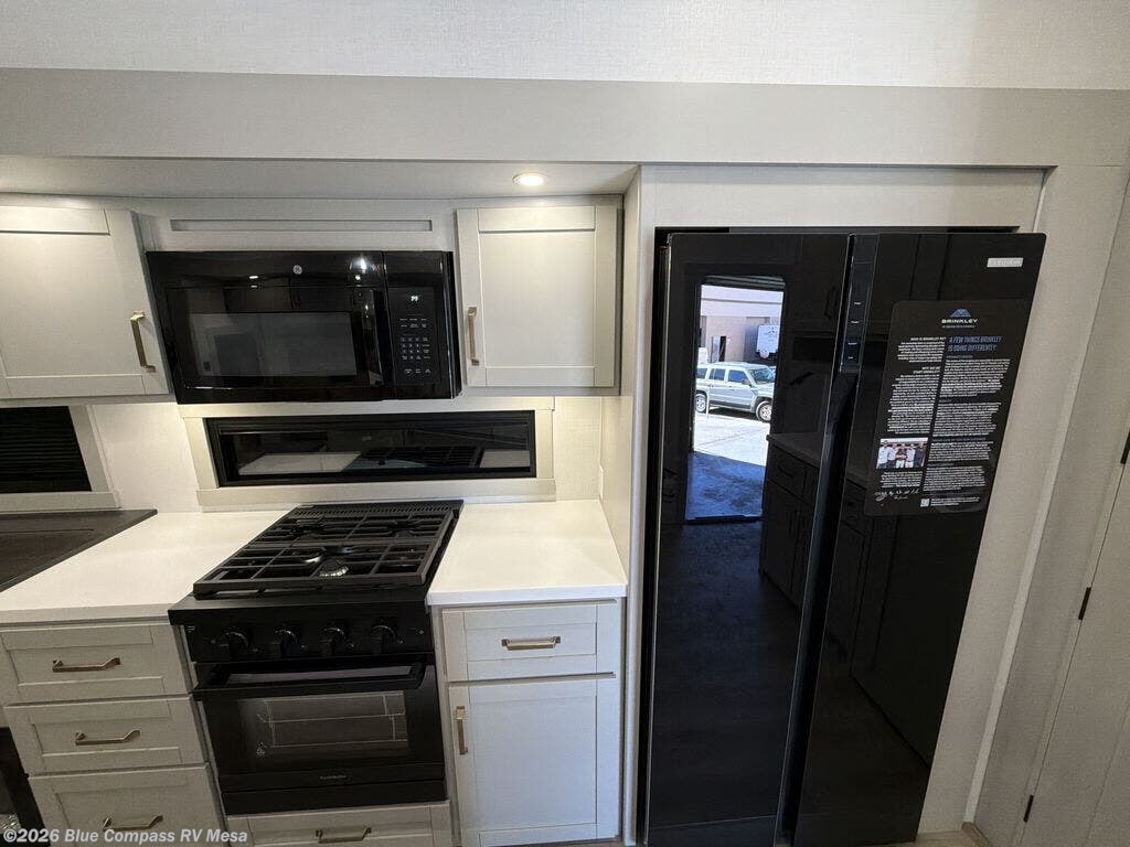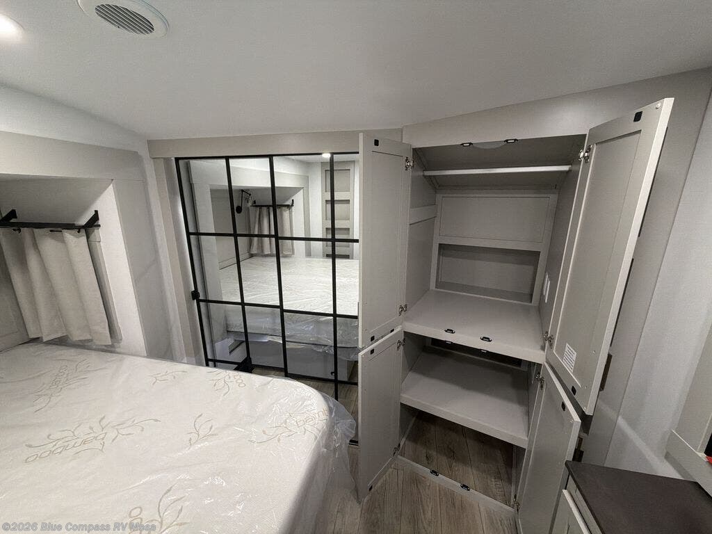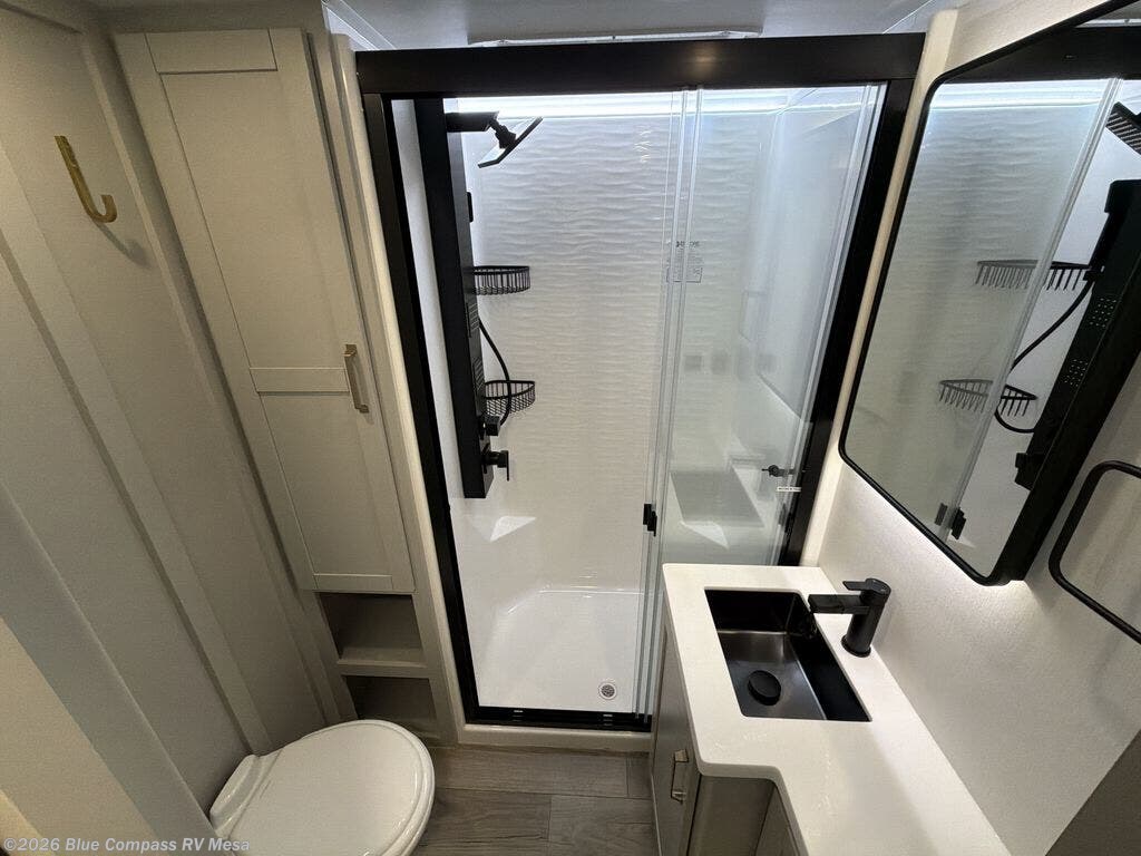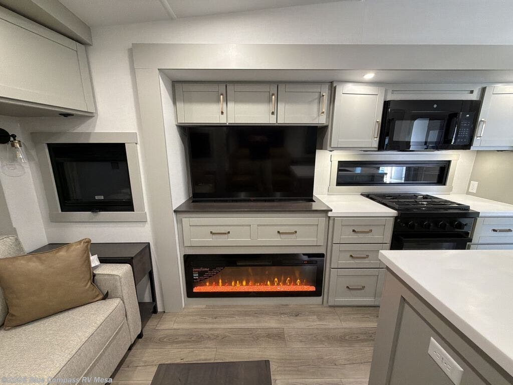 This Model Z luxury fifth wheel is bright and modern on the inside, with loads of amenities that will have you dreaming of your next trip! Enter and find a spacious combined living/kitchen space thanks to dual opposing slides. There is ample seating with a sliding desk/dining table, 62" theater seating, and a 72" tri-fold sofa along the rear wall. You can easily relax and enjoy the 50" Smart telescoping TV with a cozy fireplace below. The kitchen offers all that you need to prepare and cook meals just like home with a 16 cu. ft. refrigerator for your perishables, a 30" microwave oven, and three burner range top and oven. You will love the integrated spice rack, and the kitchen island all outfitted with dog bowls and double pull out trash bins with an integrated Stow 'N Go paper towel holder. There is also an 84" pantry with adjustable shelves for all of your canned and dry goods. Head up the steps to a private master suite with king bed slide. You can opt for the queen bed if you like. A sliding dresser top features hidden storage which is perfect for jewelry and other personal belongings. The front wardrobe features mirrored doors and the corner closet has been prepped for a stackable washer and dryer if you choose to add that option. Relax and enjoy a large bath featuring a linen cabinet, a 30" x 42" shower, and vanity with sink, plus medicine cabinet.