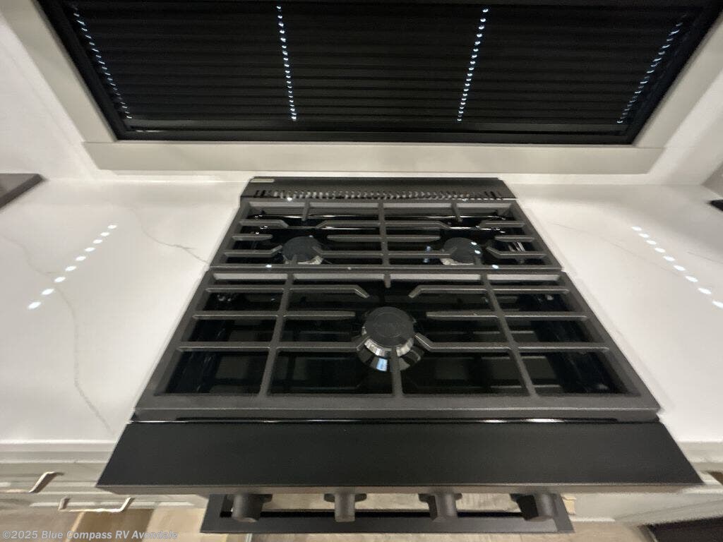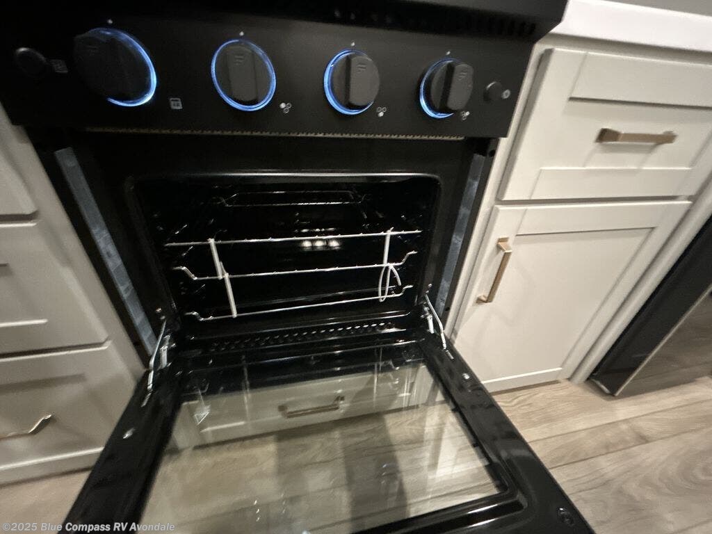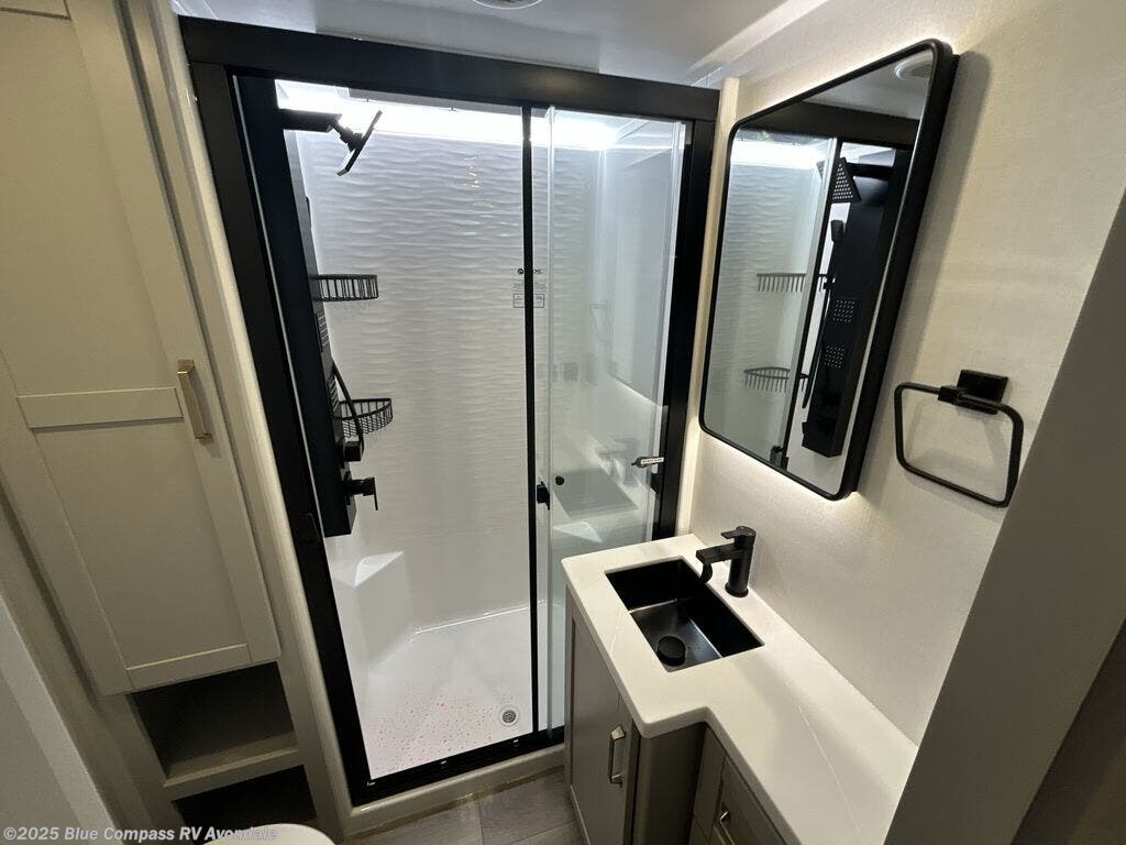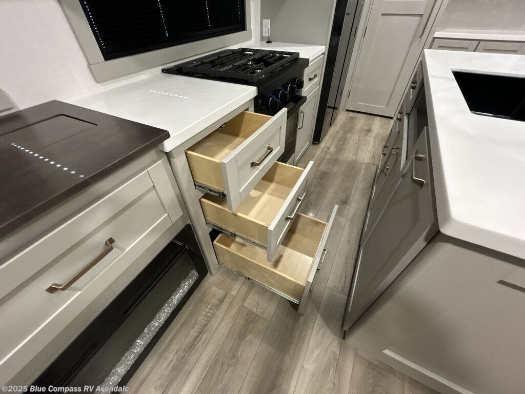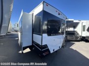 This Model Z luxury fifth wheel is bright and modern on the inside, with loads of amenities that will have you dreaming of your next trip! Enter and find a spacious combined living/kitchen space thanks to dual opposing slides. There is ample seating with a sliding desk/dining table, 62" theater seating, and a 72" tri-fold sofa along the rear wall. You can easily relax and enjoy the 50" Smart telescoping TV with a cozy fireplace below. The kitchen offers all that you need to prepare and cook meals just like home with a 16 cu. ft. refrigerator for your perishables, a 30" microwave oven, and three burner range top and oven. You will love the integrated spice rack, and the kitchen island all outfitted with dog bowls and double pull out trash bins with an integrated Stow 'N Go paper towel holder. There is also an 84" pantry with adjustable shelves for all of your canned and dry goods. Head up the steps to a private master suite with king bed slide. You can opt for the queen bed if you like. A sliding dresser top features hidden storage which is perfect for jewelry and other personal belongings. The front wardrobe features mirrored doors and the corner closet has been prepped for a stackable washer and dryer if you choose to add that option. Relax and enjoy a large bath featuring a linen cabinet, a 30" x 42" shower, and vanity with sink, plus medicine cabinet.