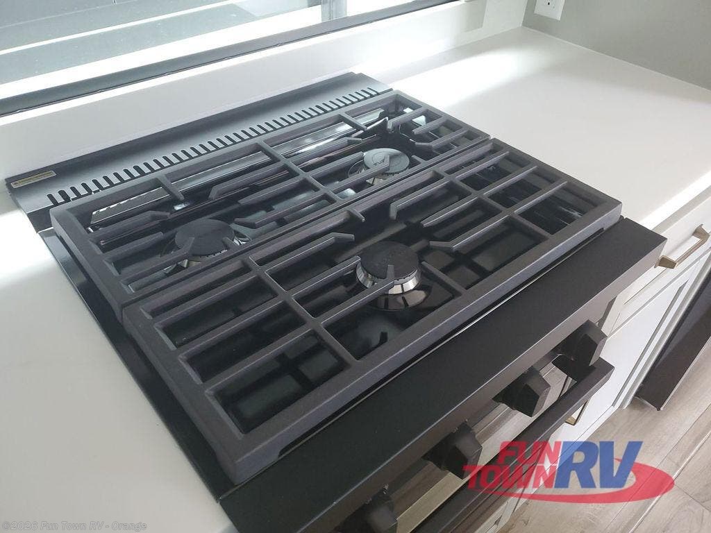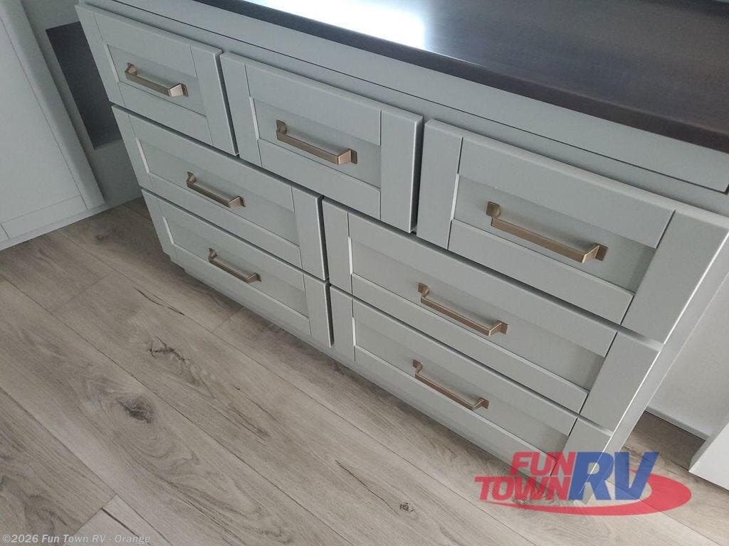 This Model Z luxury fifth wheel is bright and modern on the inside, with loads of amenities that will have you dreaming of your next trip! Enter and find a spacious combined living/kitchen space thanks to dual opposing slides. There is ample seating with a sliding desk/dining table, 62" theater seating, and a 72" tri-fold sofa along the rear wall. You can easily relax and enjoy the 50" Smart telescoping TV with a cozy fireplace below. The kitchen offers all that you need to prepare and cook meals just like home with a 16 cu. ft. refrigerator for your perishables, a 30" microwave oven, and three burner range top and oven. You will love the integrated spice rack, and the kitchen island all outfitted with dog bowls and double pull out trash bins with an integrated Stow 'N Go paper towel holder. There is also an 84" pantry with adjustable shelves for all of your canned and dry goods. Head up the steps to a private master suite with king bed slide. You can opt for the queen bed if you like. A sliding dresser top features hidden storage which is perfect for jewelry and other personal belongings. The front wardrobe features mirrored doors and the corner closet has been prepped for a stackable washer and dryer if you choose to add that option. Relax and enjoy a large bath featuring a linen cabinet, a 30" x 42" shower, and vanity with sink, plus medicine cabinet.