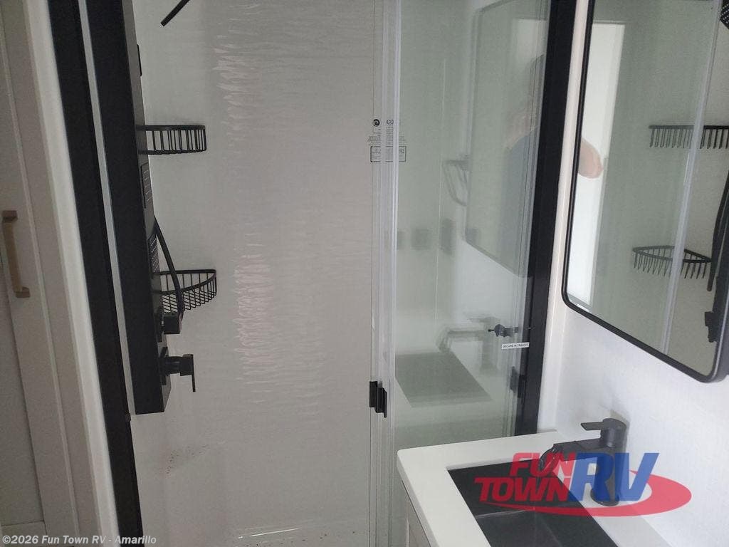 This Model Z luxury fifth wheel is bright and modern on the inside, with loads of amenities that will have you dreaming of your next trip! Enter and find a spacious combined living/kitchen space thanks to dual opposing slides. There is ample seating with a sliding desk/dining table, 62" theater seating, and a 72" tri-fold sofa along the rear wall. You can easily relax and enjoy the 50" Smart telescoping TV with a cozy fireplace below. The kitchen offers all that you need to prepare and cook meals just like home with a 16 cu. ft. refrigerator for your perishables, a 30" microwave oven, and three burner range top and oven. You will love the integrated spice rack, and the kitchen island all outfitted with dog bowls and double pull out trash bins with an integrated Stow 'N Go paper towel holder. There is also an 84" pantry with adjustable shelves for all of your canned and dry goods. Head up the steps to a private master suite with king bed slide. You can opt for the queen bed if you like. A sliding dresser top features hidden storage which is perfect for jewelry and other personal belongings. The front wardrobe features mirrored doors and the corner closet has been prepped for a stackable washer and dryer if you choose to add that option. Relax and enjoy a large bath featuring a linen cabinet, a 30" x 42" shower, and vanity with sink, plus medicine cabinet.