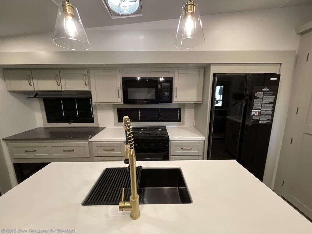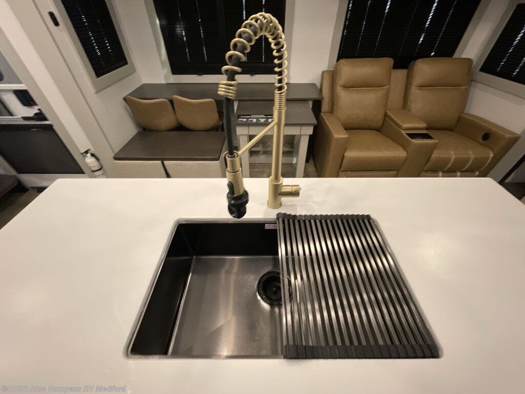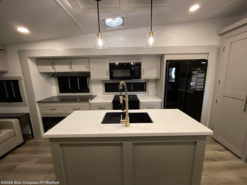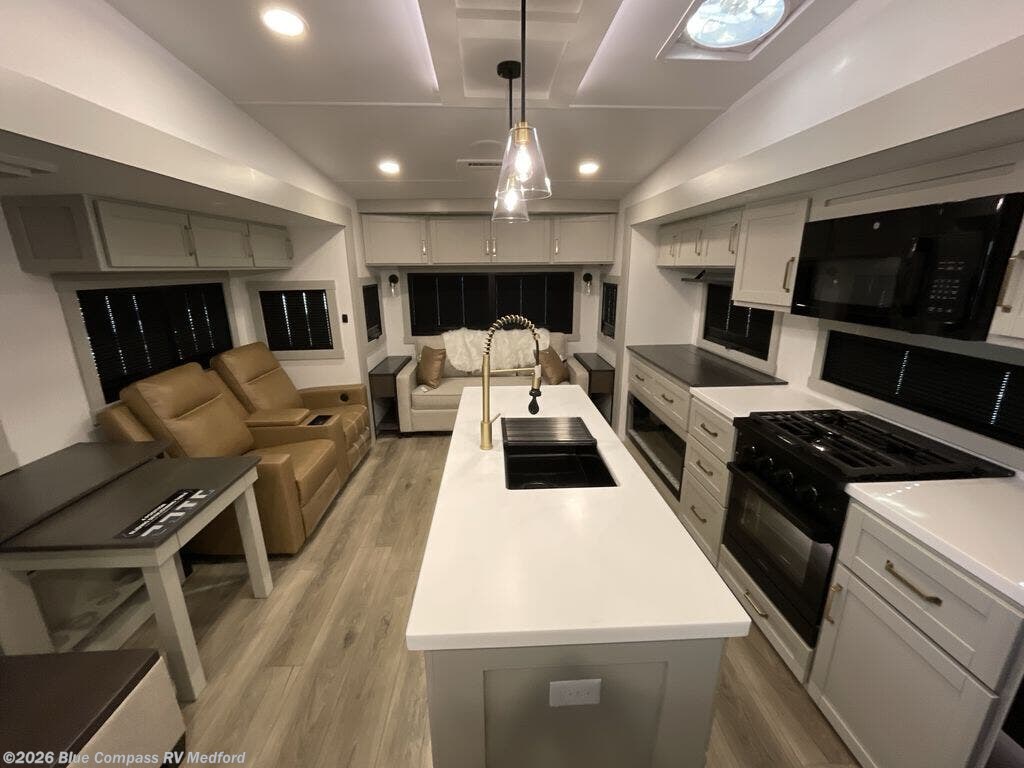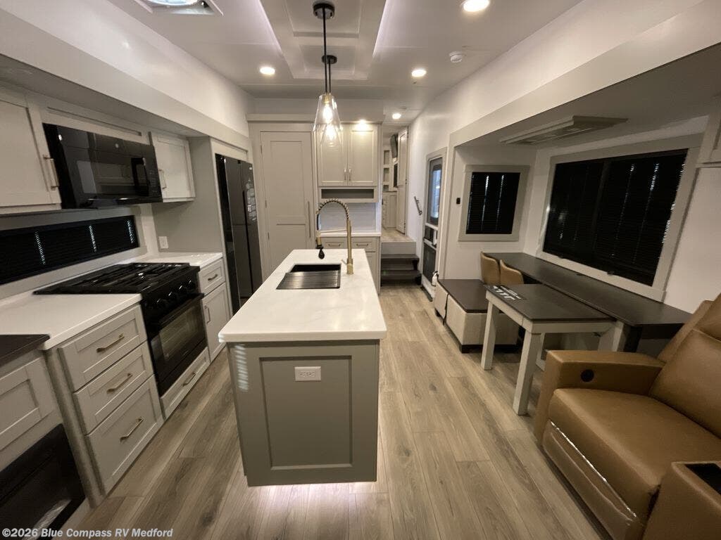 This Model Z luxury fifth wheel is bright and modern on the inside, with loads of amenities that will have you dreaming of your next trip! Enter and find a spacious combined living/kitchen space thanks to dual opposing slides. There is ample seating with a sliding desk/dining table, 62" theater seating, and a 72" tri-fold sofa along the rear wall. You can easily relax and enjoy the 50" Smart telescoping TV with a cozy fireplace below. The kitchen offers all that you need to prepare and cook meals just like home with a 16 cu. ft. refrigerator for your perishables, a 30" microwave oven, and three burner range top and oven. You will love the integrated spice rack, and the kitchen island all outfitted with dog bowls and double pull out trash bins with an integrated Stow 'N Go paper towel holder. There is also an 84" pantry with adjustable shelves for all of your canned and dry goods. Head up the steps to a private master suite with king bed slide. You can opt for the queen bed if you like. A sliding dresser top features hidden storage which is perfect for jewelry and other personal belongings. The front wardrobe features mirrored doors and the corner closet has been prepped for a stackable washer and dryer if you choose to add that option. Relax and enjoy a large bath featuring a linen cabinet, a 30" x 42" shower, and vanity with sink, plus medicine cabinet.