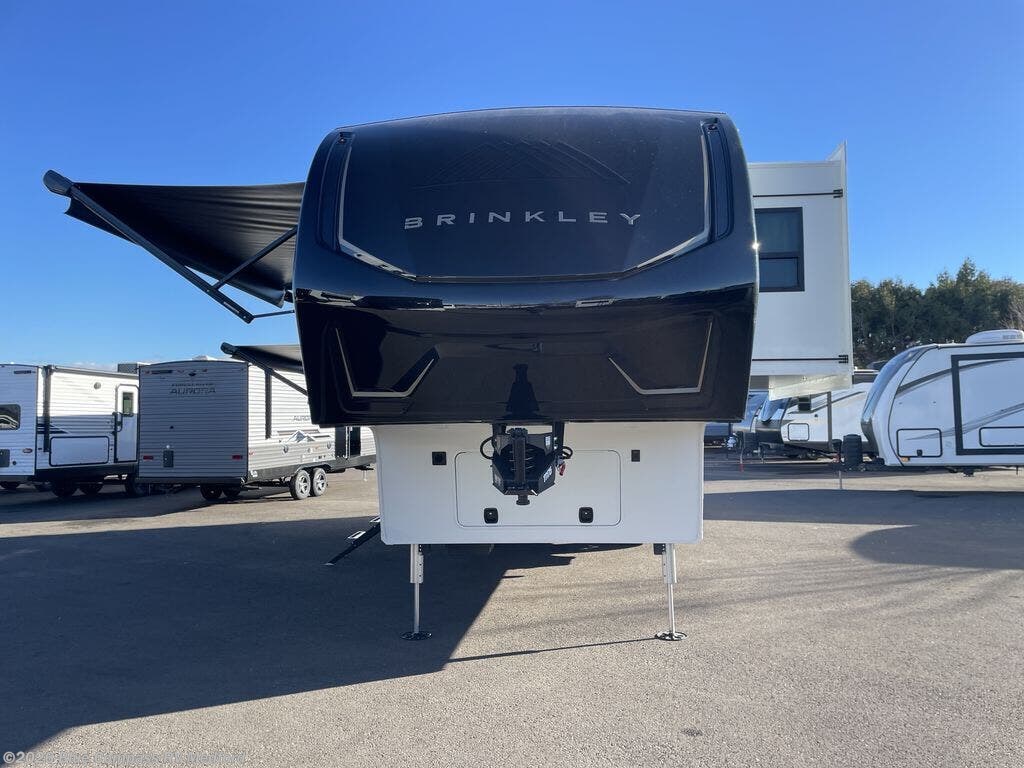 The Brinkley mid-profile Model Z fifth wheels bring you clean lines and an upscale look with plenty of style and exciting new features like the industry first brass plumbing connections. These units also feature an automotive grade front cap, plenty of exterior storage, dual exterior hot and cold showers, and wide stance leveling jacks for easy set up. Residential frameless windows provide a clean look and beautiful views, and ample electrical outlets and 6 USB/USB-C outlets allow all of your electronics and appliances to easily be used and charged.