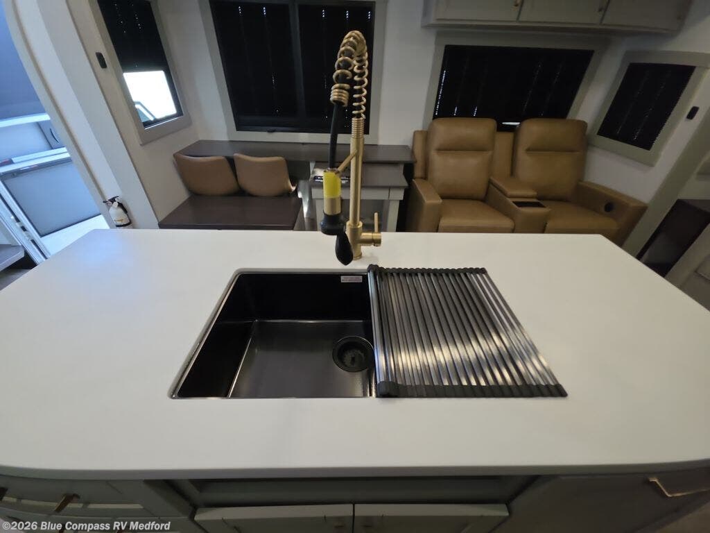 This Model Z luxury fifth wheel is bright and modern on the inside, with loads of amenities that will have you dreaming of your next trip! Enter and find a spacious combined living/kitchen space thanks to dual opposing slides. There is ample seating with a sliding desk/dining table, 62" theater seating, and a 72" tri-fold sofa along the rear wall. You can easily relax and enjoy the 50" Smart telescoping TV with a cozy fireplace below. The kitchen offers all that you need to prepare and cook meals just like home with a 16 cu. ft. refrigerator for your perishables, a 30" microwave oven, and three burner range top and oven. You will love the integrated spice rack, and the kitchen island all outfitted with dog bowls and double pull out trash bins with an integrated Stow 'N Go paper towel holder. There is also an 84" pantry with adjustable shelves for all of your canned and dry goods. Head up the steps to a private master suite with king bed slide. You can opt for the queen bed if you like. A sliding dresser top features hidden storage which is perfect for jewelry and other personal belongings. The front wardrobe features mirrored doors and the corner closet has been prepped for a stackable washer and dryer if you choose to add that option. Relax and enjoy a large bath featuring a linen cabinet, a 30" x 42" shower, and vanity with sink, plus medicine cabinet.