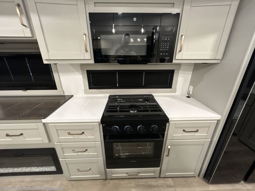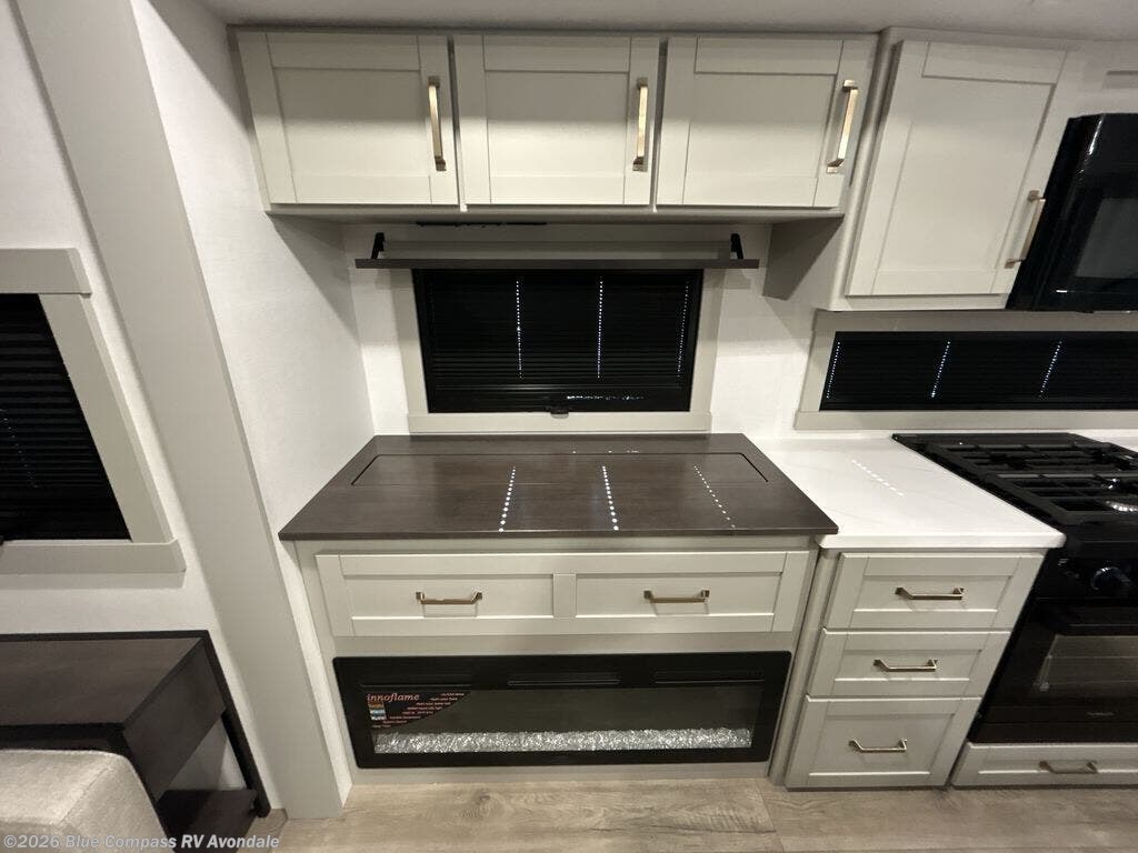 This Model Z luxury fifth wheel is bright and modern on the inside, with loads of amenities that will have you dreaming of your next trip! Enter and find a spacious combined living/kitchen space thanks to dual opposing slides. There is ample seating with a sliding desk/dining table, 62" theater seating, and a 72" tri-fold sofa along the rear wall. You can easily relax and enjoy the 50" Smart telescoping TV with a cozy fireplace below. The kitchen offers all that you need to prepare and cook meals just like home with a 16 cu. ft. refrigerator for your perishables, a 30" microwave oven, and three burner range top and oven. You will love the integrated spice rack, and the kitchen island all outfitted with dog bowls and double pull out trash bins with an integrated Stow 'N Go paper towel holder. There is also an 84" pantry with adjustable shelves for all of your canned and dry goods. Head up the steps to a private master suite with king bed slide. You can opt for the queen bed if you like. A sliding dresser top features hidden storage which is perfect for jewelry and other personal belongings. The front wardrobe features mirrored doors and the corner closet has been prepped for a stackable washer and dryer if you choose to add that option. Relax and enjoy a large bath featuring a linen cabinet, a 30" x 42" shower, and vanity with sink, plus medicine cabinet.