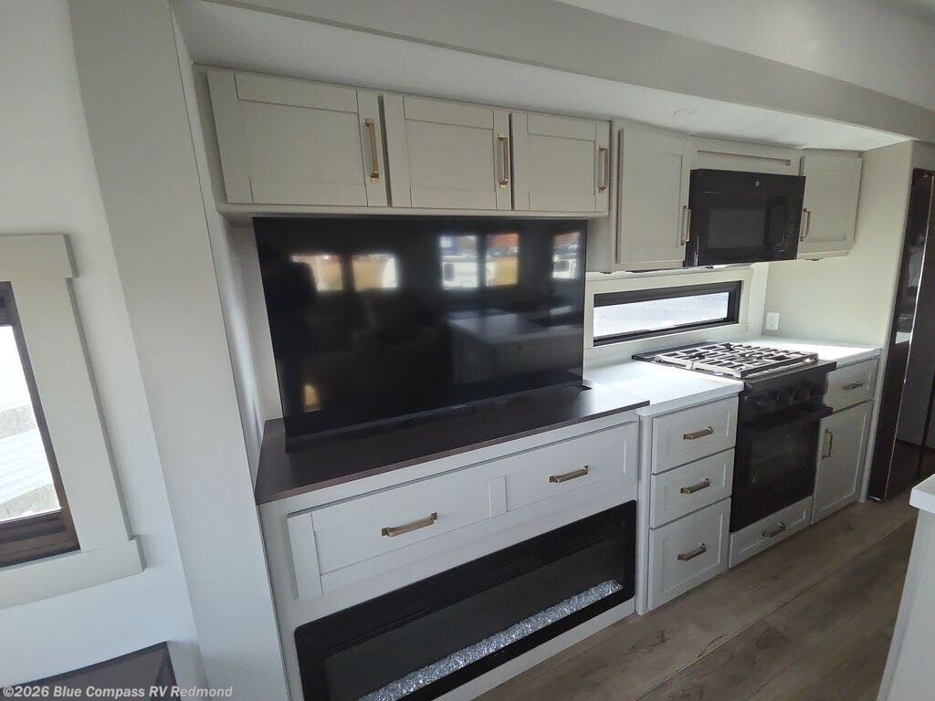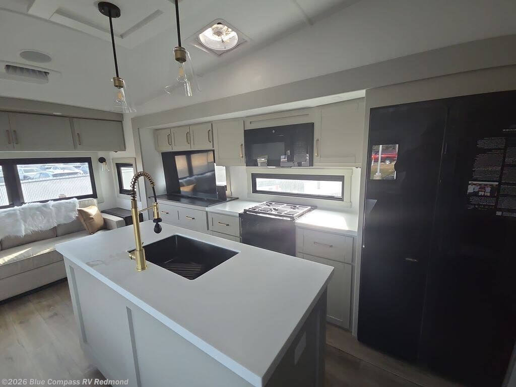 This Model Z luxury fifth wheel is bright and modern on the inside, with loads of amenities that will have you dreaming of your next trip! Enter and find a spacious combined living/kitchen space thanks to dual opposing slides. There is ample seating with a sliding desk/dining table, 62" theater seating, and a 72" tri-fold sofa along the rear wall. You can easily relax and enjoy the 50" Smart telescoping TV with a cozy fireplace below. The kitchen offers all that you need to prepare and cook meals just like home with a 16 cu. ft. refrigerator for your perishables, a 30" microwave oven, and three burner range top and oven. You will love the integrated spice rack, and the kitchen island all outfitted with dog bowls and double pull out trash bins with an integrated Stow 'N Go paper towel holder. There is also an 84" pantry with adjustable shelves for all of your canned and dry goods. Head up the steps to a private master suite with king bed slide. You can opt for the queen bed if you like. A sliding dresser top features hidden storage which is perfect for jewelry and other personal belongings. The front wardrobe features mirrored doors and the corner closet has been prepped for a stackable washer and dryer if you choose to add that option. Relax and enjoy a large bath featuring a linen cabinet, a 30" x 42" shower, and vanity with sink, plus medicine cabinet.