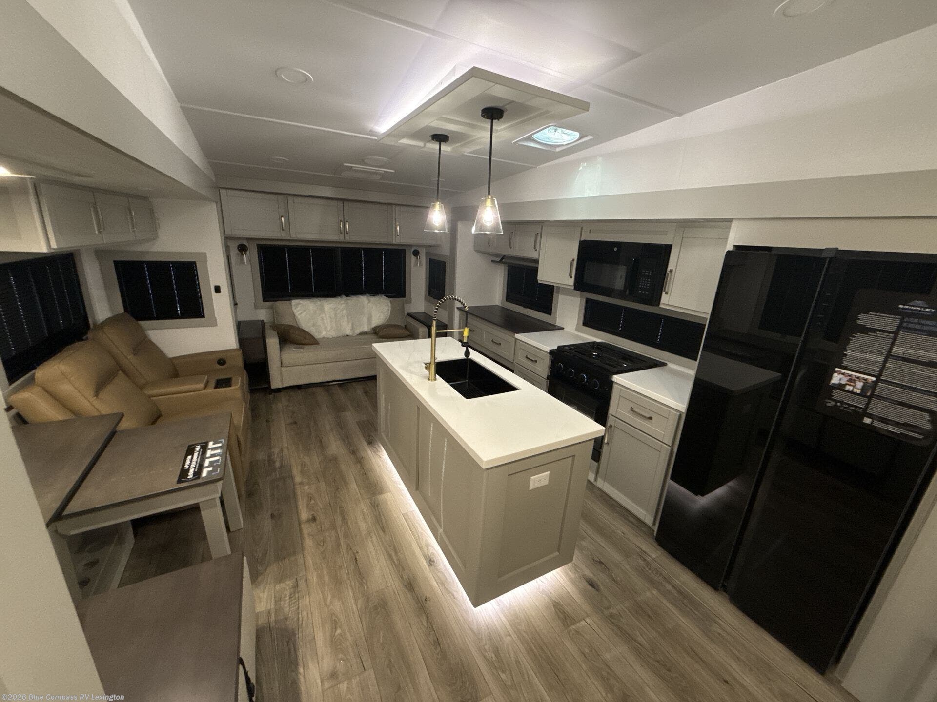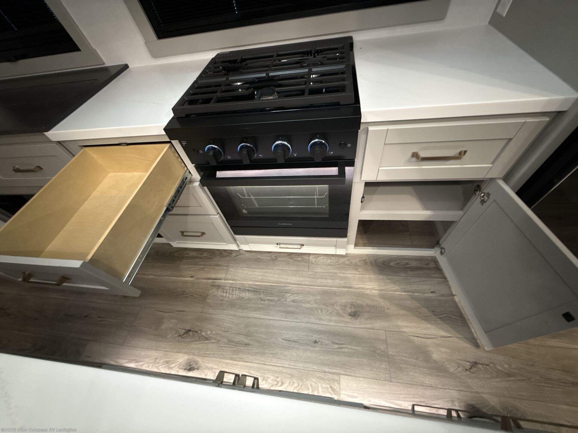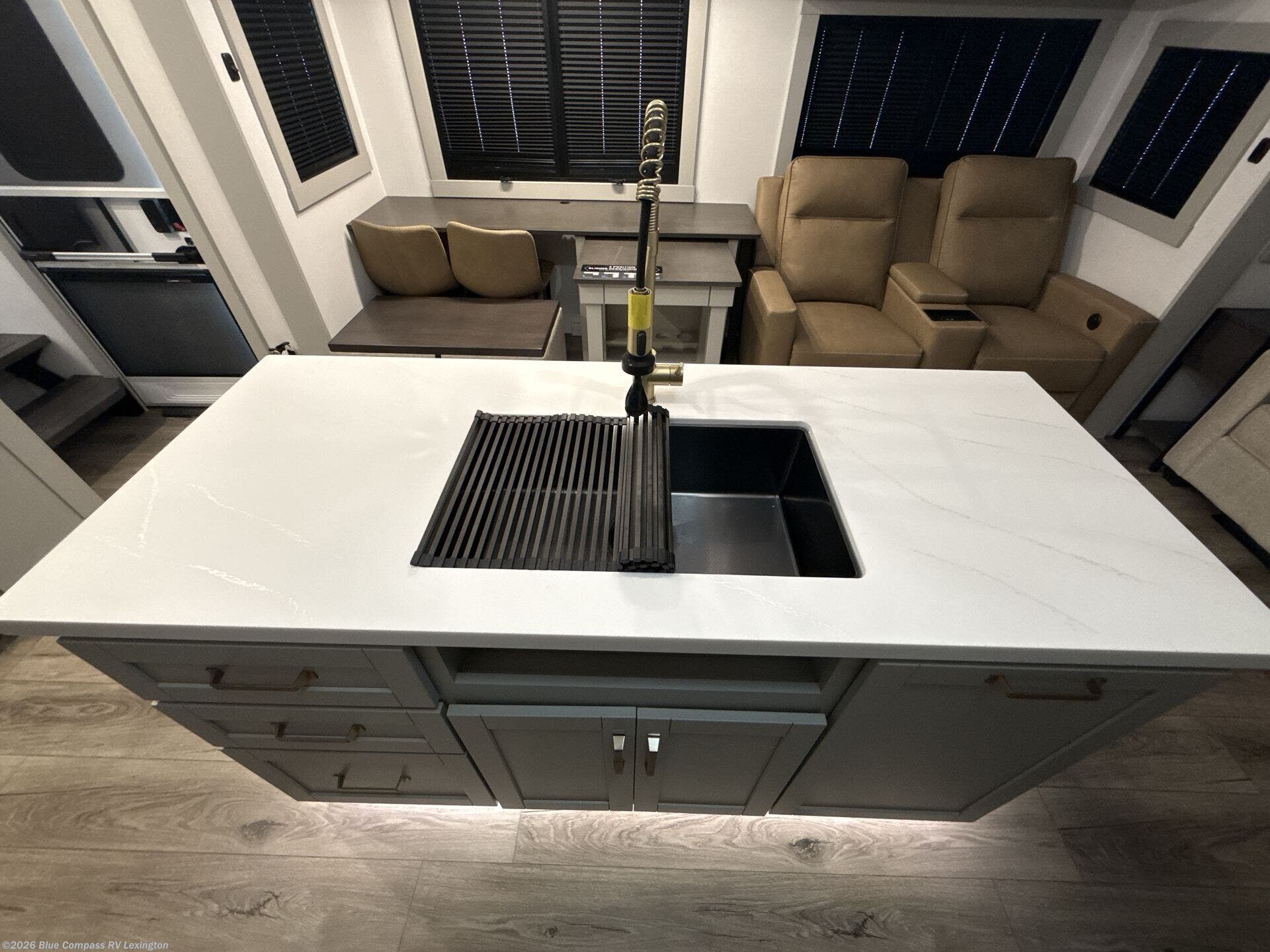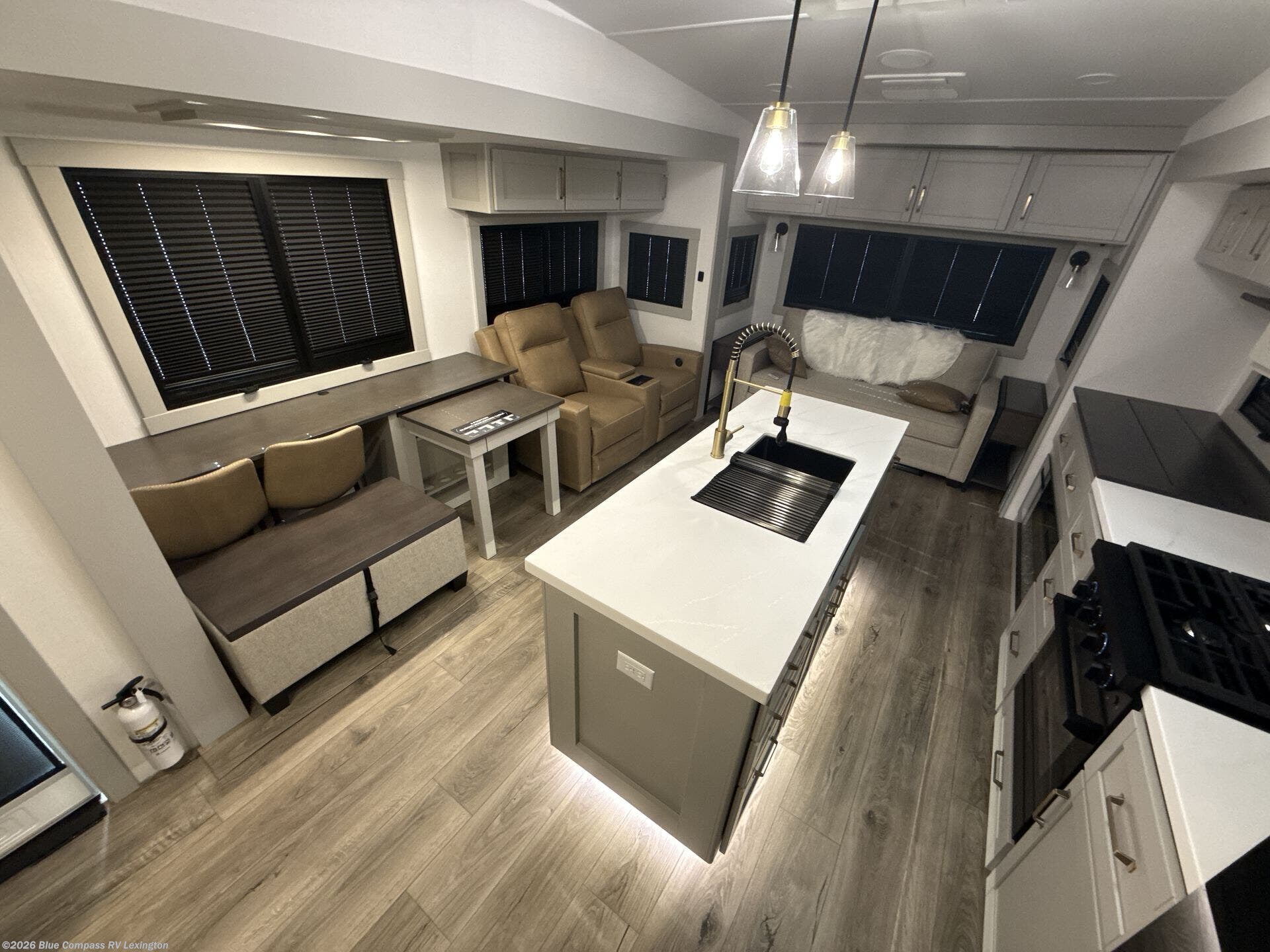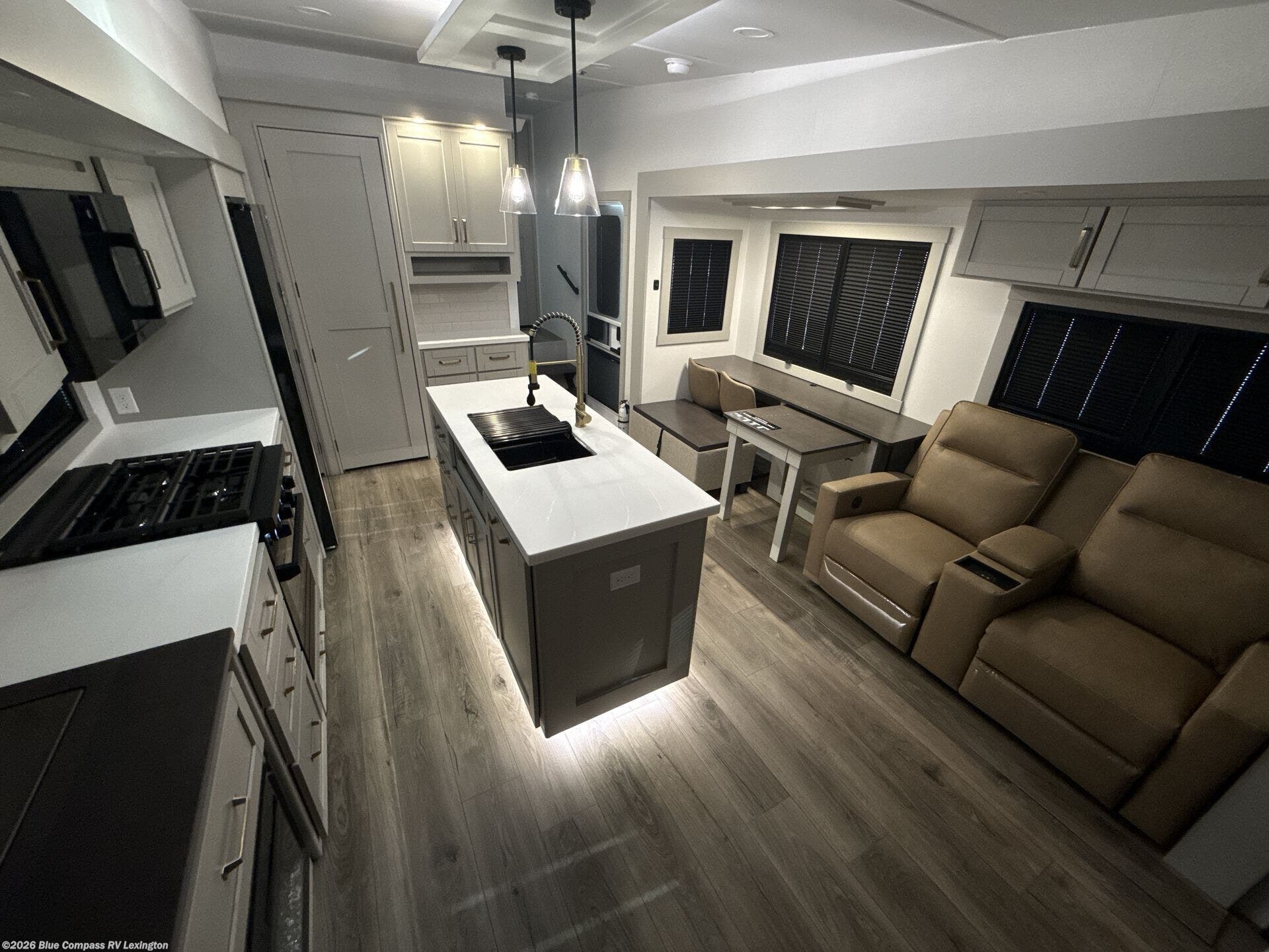 This Model Z luxury fifth wheel is bright and modern on the inside, with loads of amenities that will have you dreaming of your next trip! Enter and find a spacious combined living/kitchen space thanks to dual opposing slides. There is ample seating with a sliding desk/dining table, 62" theater seating, and a 72" tri-fold sofa along the rear wall. You can easily relax and enjoy the 50" Smart telescoping TV with a cozy fireplace below. The kitchen offers all that you need to prepare and cook meals just like home with a 16 cu. ft. refrigerator for your perishables, a 30" microwave oven, and three burner range top and oven. You will love the integrated spice rack, and the kitchen island all outfitted with dog bowls and double pull out trash bins with an integrated Stow 'N Go paper towel holder. There is also an 84" pantry with adjustable shelves for all of your canned and dry goods. Head up the steps to a private master suite with king bed slide. You can opt for the queen bed if you like. A sliding dresser top features hidden storage which is perfect for jewelry and other personal belongings. The front wardrobe features mirrored doors and the corner closet has been prepped for a stackable washer and dryer if you choose to add that option. Relax and enjoy a large bath featuring a linen cabinet, a 30" x 42" shower, and vanity with sink, plus medicine cabinet.