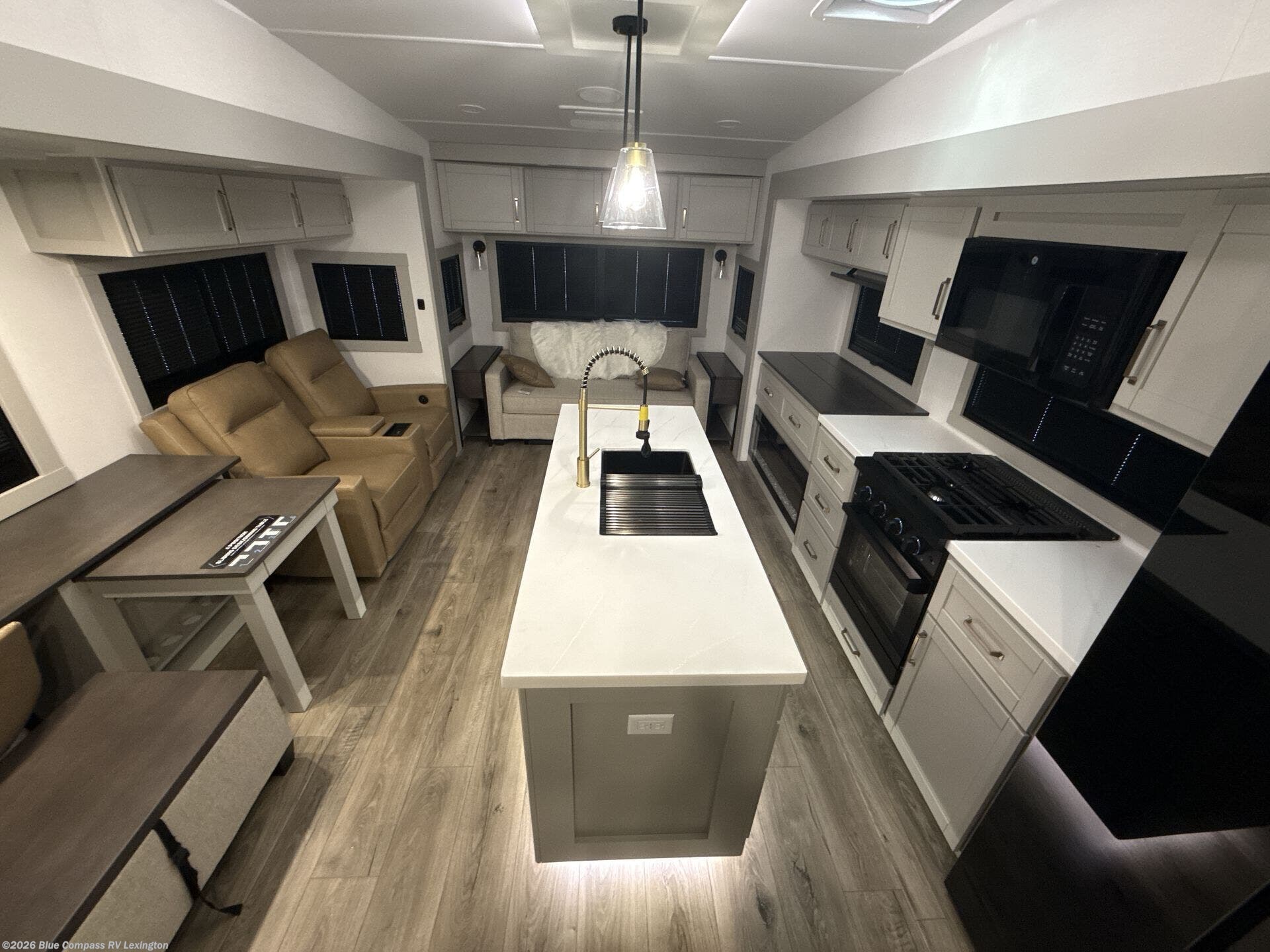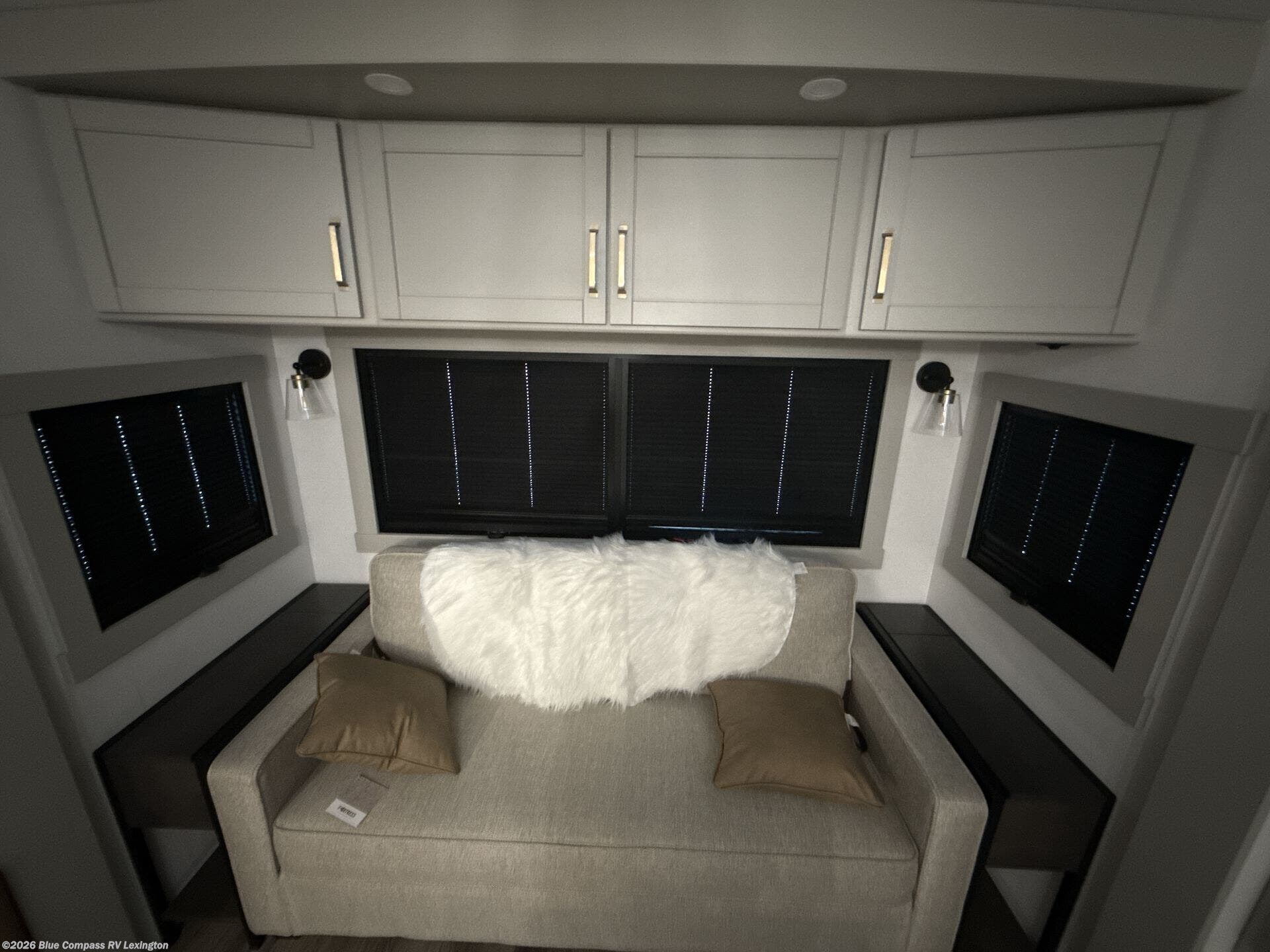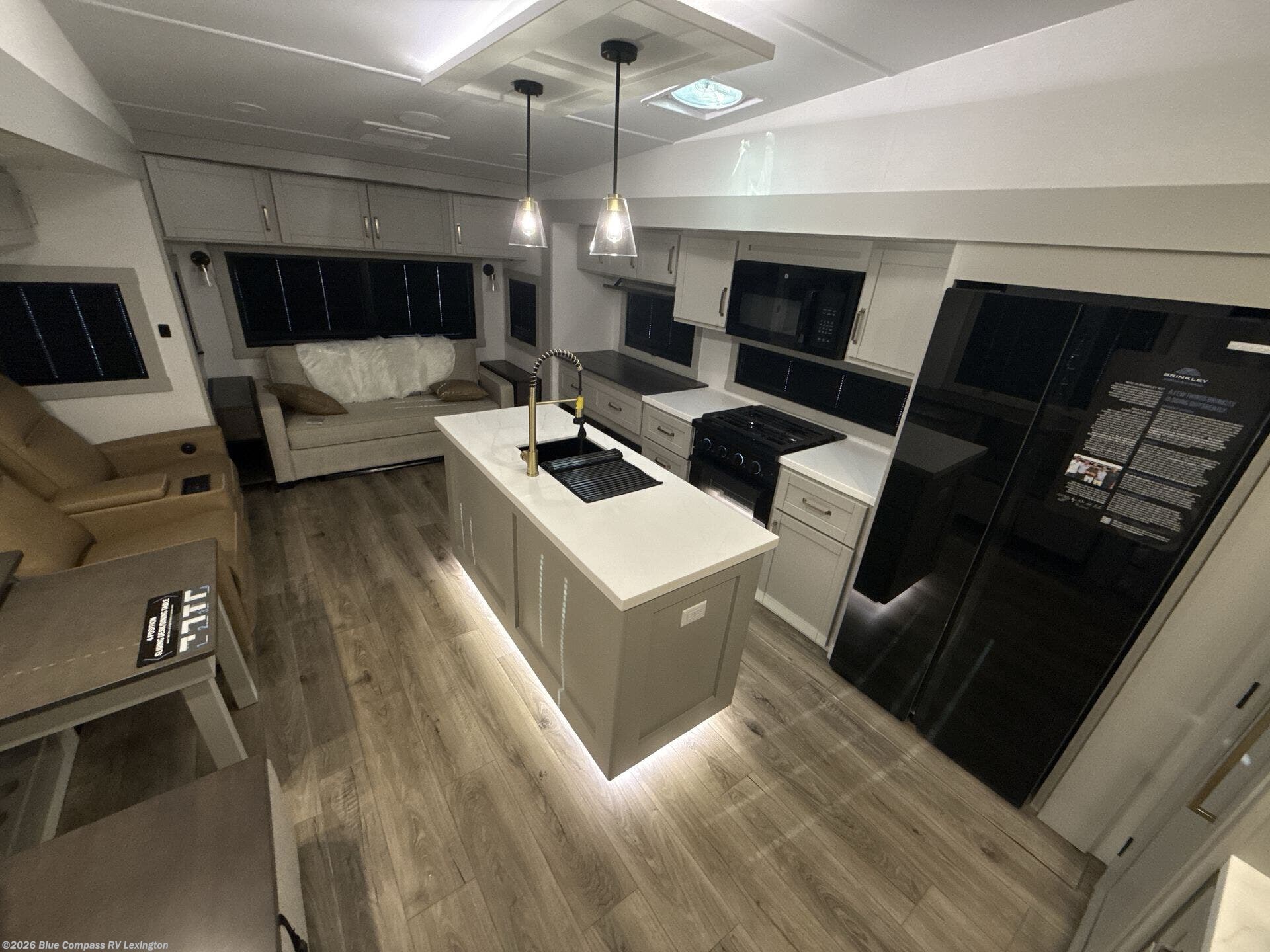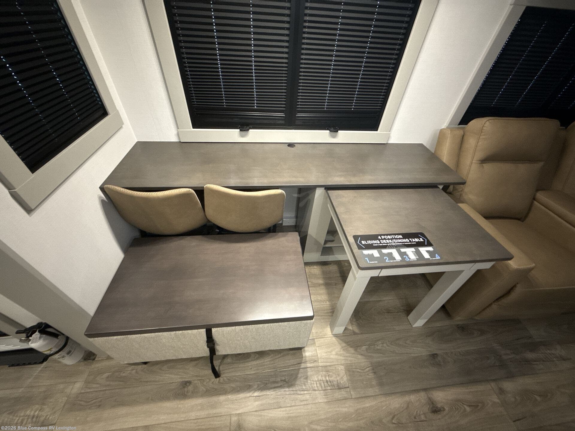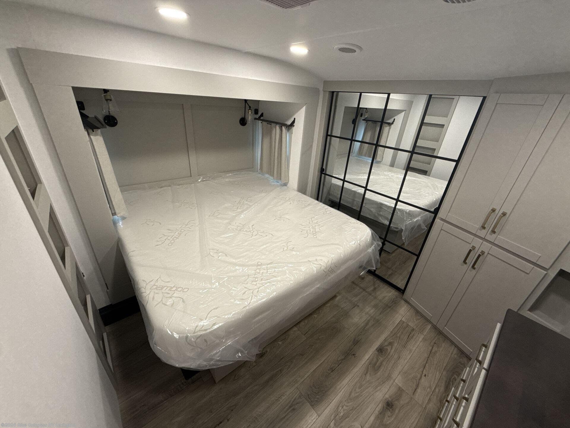 This Model Z luxury fifth wheel is bright and modern on the inside, with loads of amenities that will have you dreaming of your next trip! Enter and find a spacious combined living/kitchen space thanks to dual opposing slides. There is ample seating with a sliding desk/dining table, 62" theater seating, and a 72" tri-fold sofa along the rear wall. You can easily relax and enjoy the 50" Smart telescoping TV with a cozy fireplace below. The kitchen offers all that you need to prepare and cook meals just like home with a 16 cu. ft. refrigerator for your perishables, a 30" microwave oven, and three burner range top and oven. You will love the integrated spice rack, and the kitchen island all outfitted with dog bowls and double pull out trash bins with an integrated Stow 'N Go paper towel holder. There is also an 84" pantry with adjustable shelves for all of your canned and dry goods. Head up the steps to a private master suite with king bed slide. You can opt for the queen bed if you like. A sliding dresser top features hidden storage which is perfect for jewelry and other personal belongings. The front wardrobe features mirrored doors and the corner closet has been prepped for a stackable washer and dryer if you choose to add that option. Relax and enjoy a large bath featuring a linen cabinet, a 30" x 42" shower, and vanity with sink, plus medicine cabinet.
