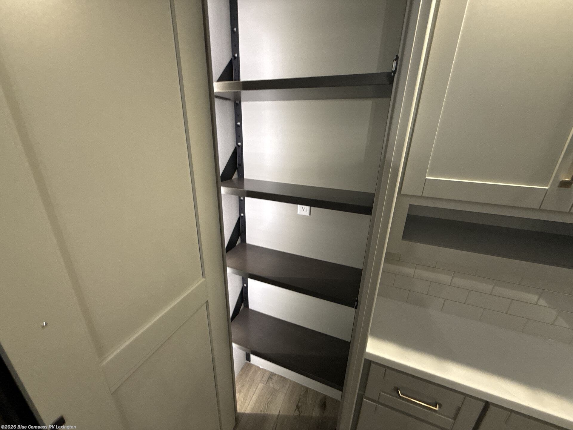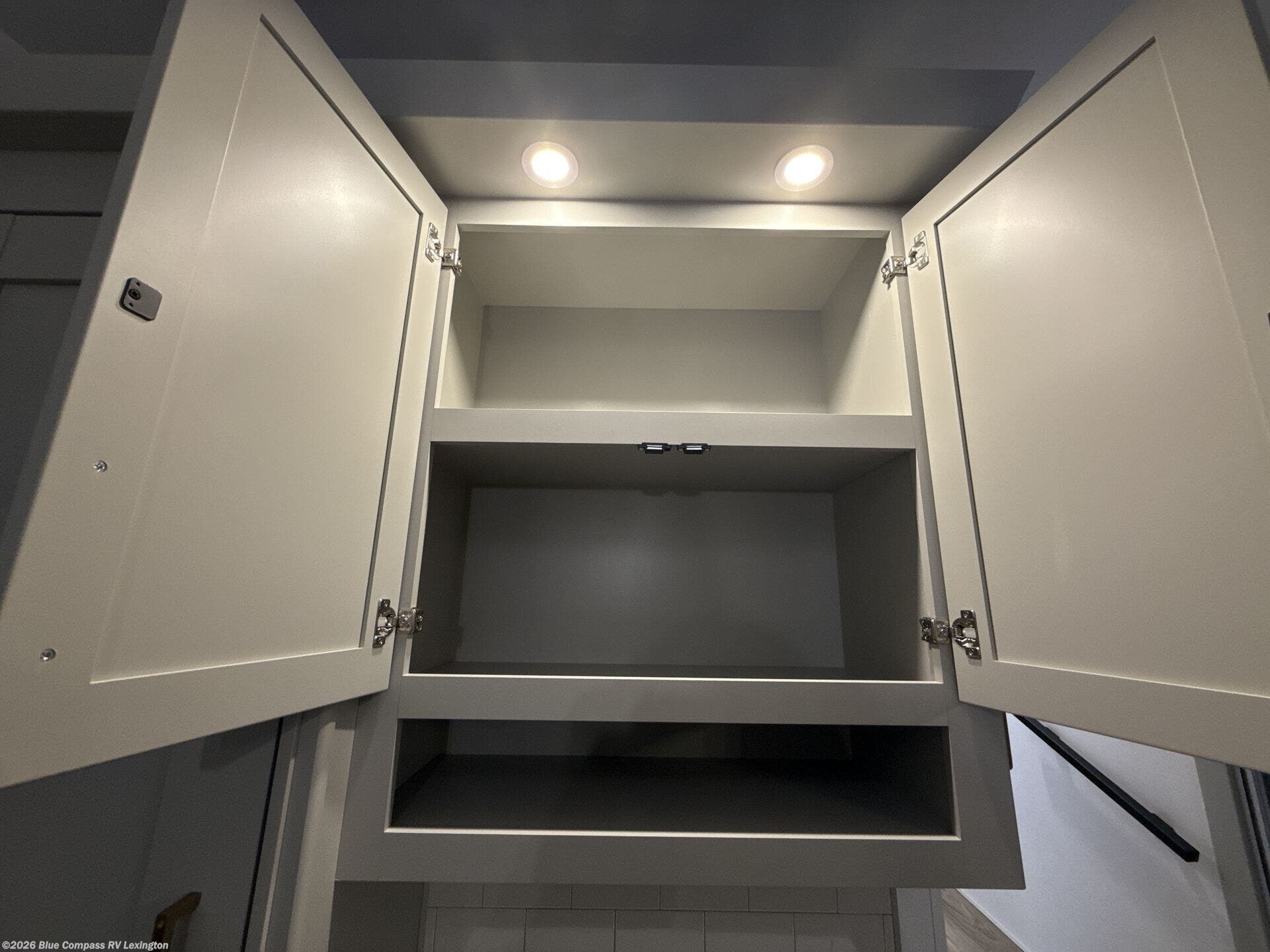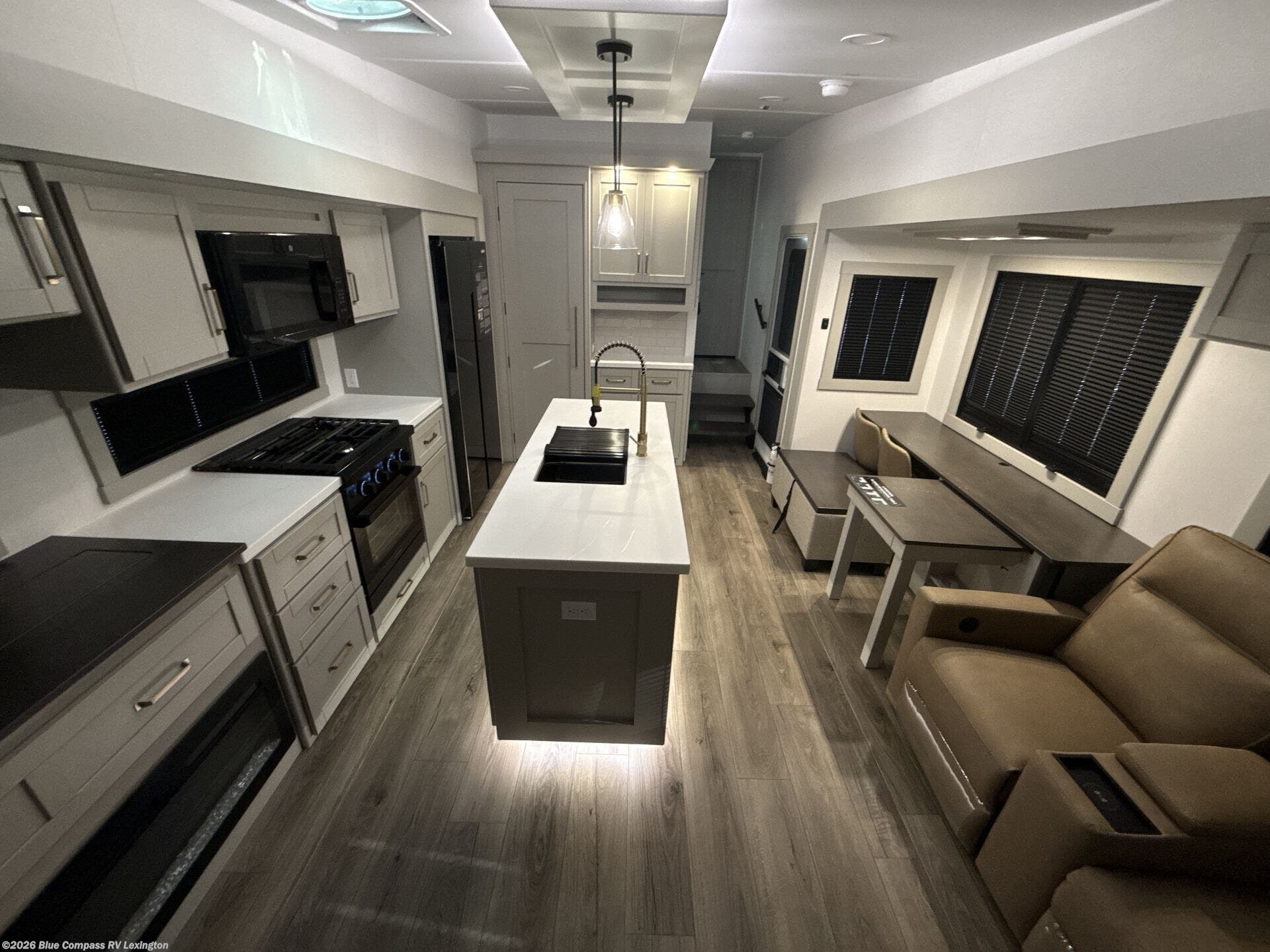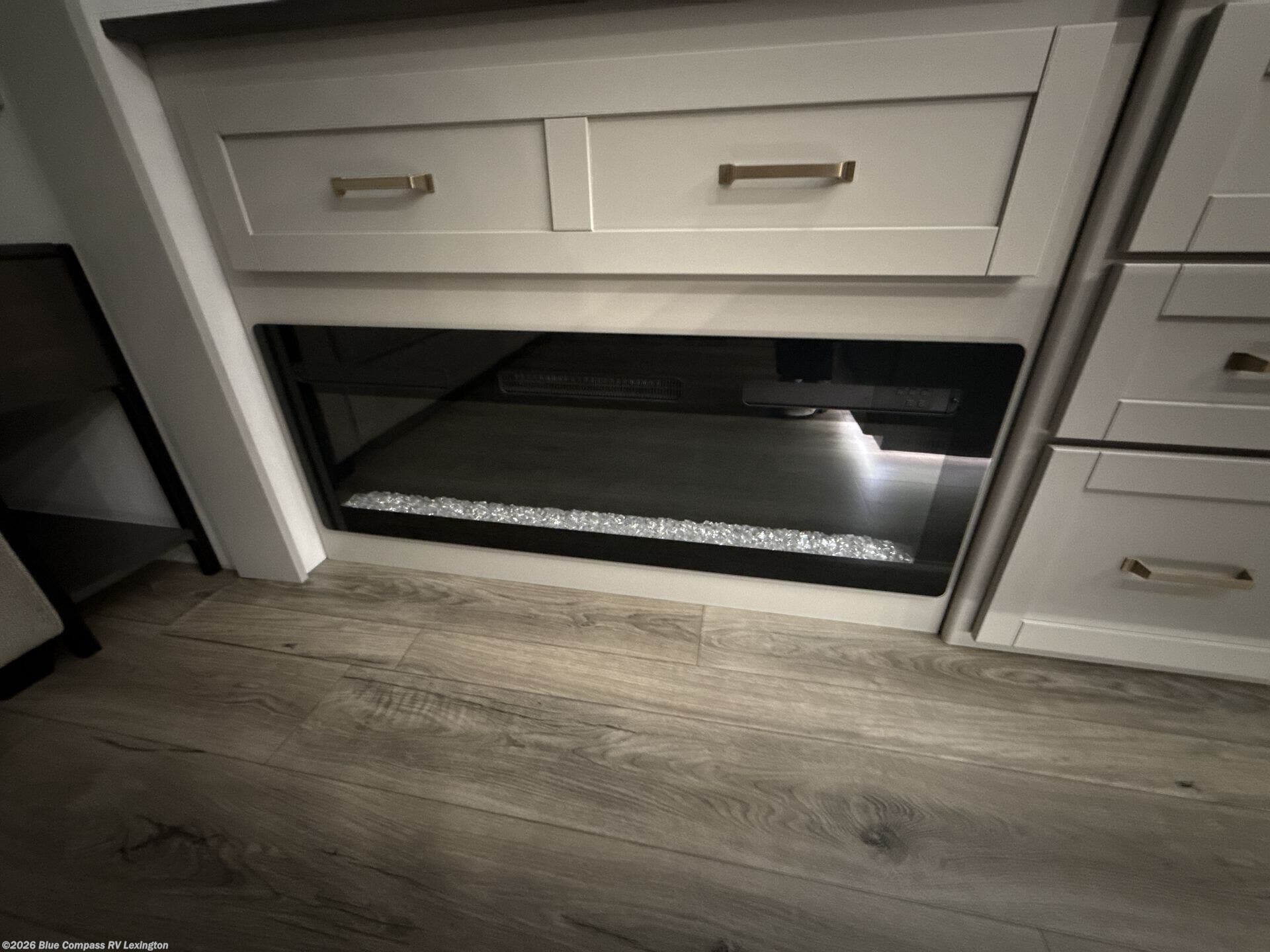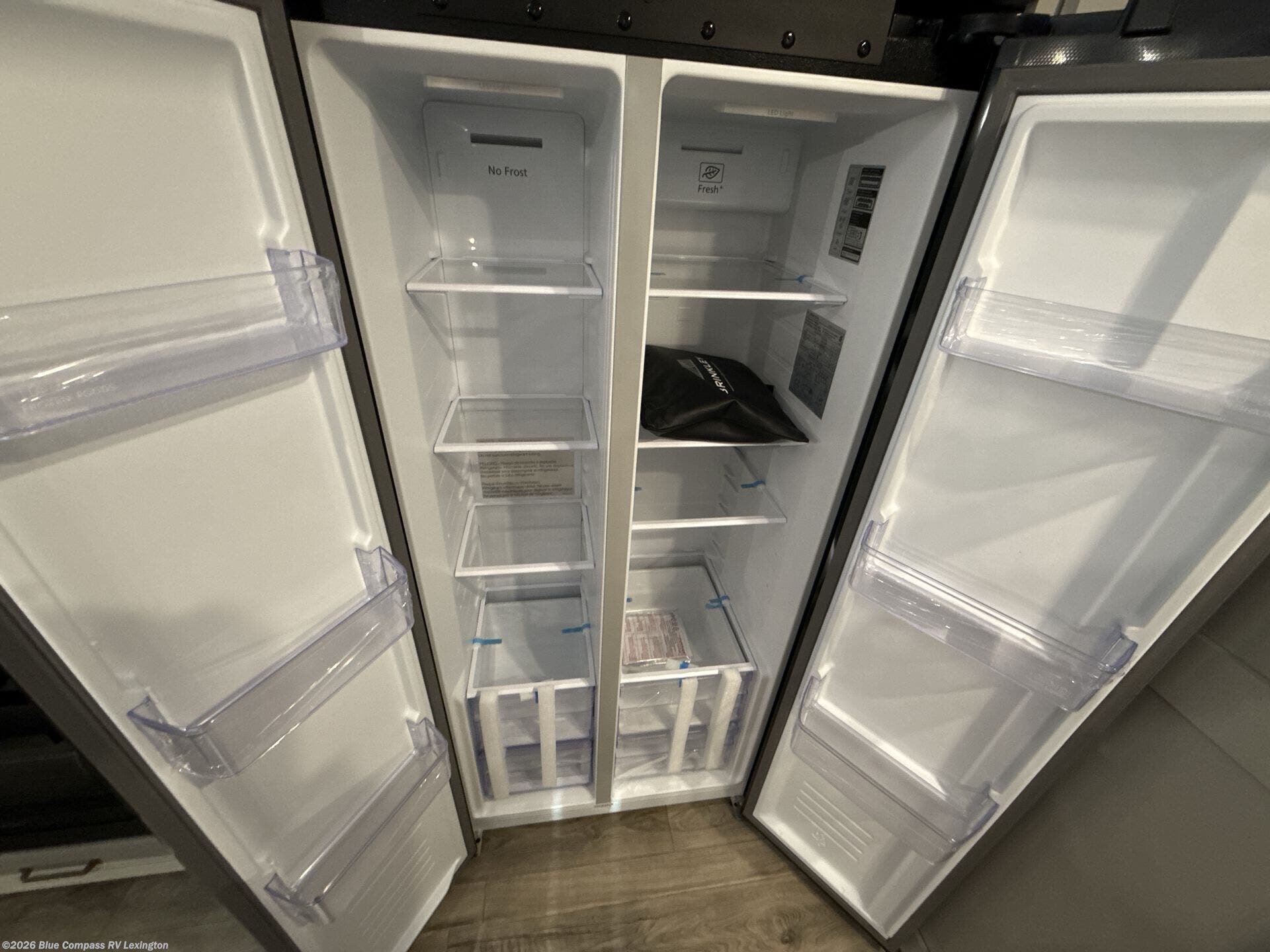 This Model Z luxury fifth wheel is bright and modern on the inside, with loads of amenities that will have you dreaming of your next trip! Enter and find a spacious combined living/kitchen space thanks to dual opposing slides. There is ample seating with a sliding desk/dining table, 62" theater seating, and a 72" tri-fold sofa along the rear wall. You can easily relax and enjoy the 50" Smart telescoping TV with a cozy fireplace below. The kitchen offers all that you need to prepare and cook meals just like home with a 16 cu. ft. refrigerator for your perishables, a 30" microwave oven, and three burner range top and oven. You will love the integrated spice rack, and the kitchen island all outfitted with dog bowls and double pull out trash bins with an integrated Stow 'N Go paper towel holder. There is also an 84" pantry with adjustable shelves for all of your canned and dry goods. Head up the steps to a private master suite with king bed slide. You can opt for the queen bed if you like. A sliding dresser top features hidden storage which is perfect for jewelry and other personal belongings. The front wardrobe features mirrored doors and the corner closet has been prepped for a stackable washer and dryer if you choose to add that option. Relax and enjoy a large bath featuring a linen cabinet, a 30" x 42" shower, and vanity with sink, plus medicine cabinet.
