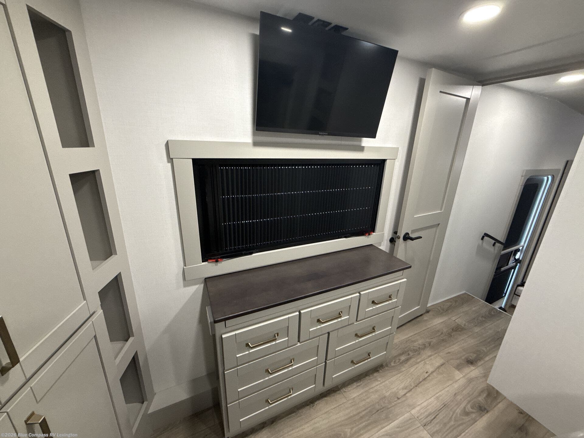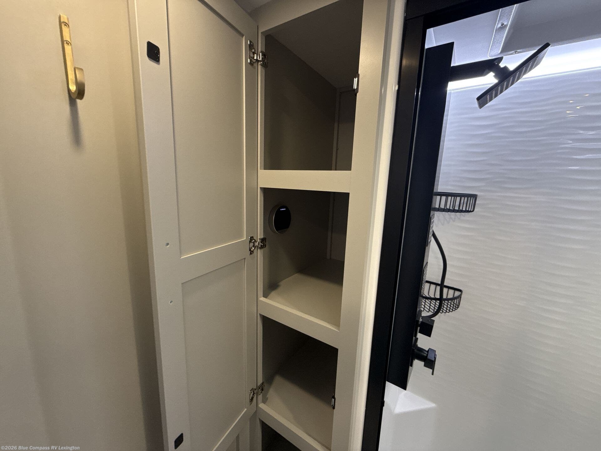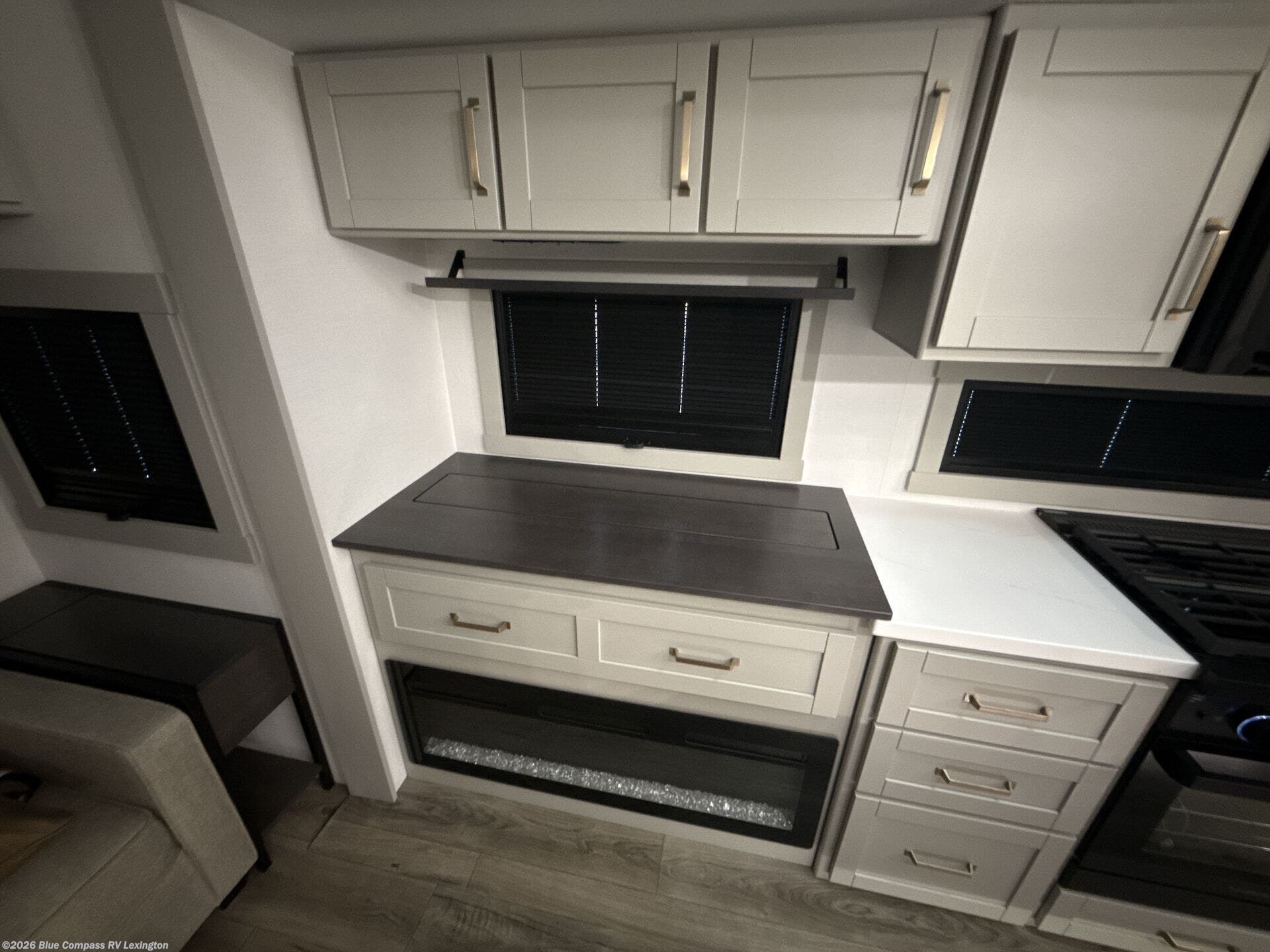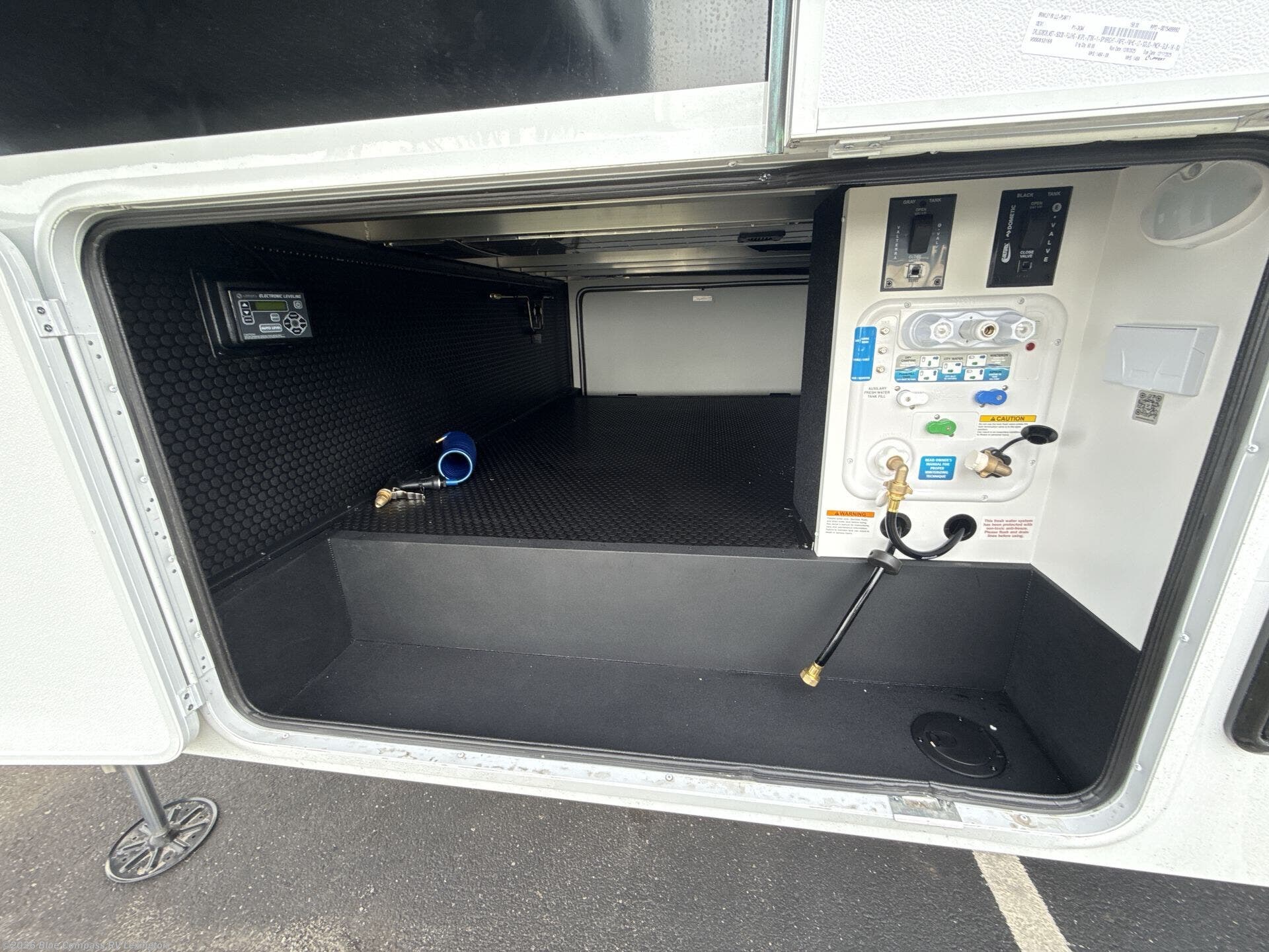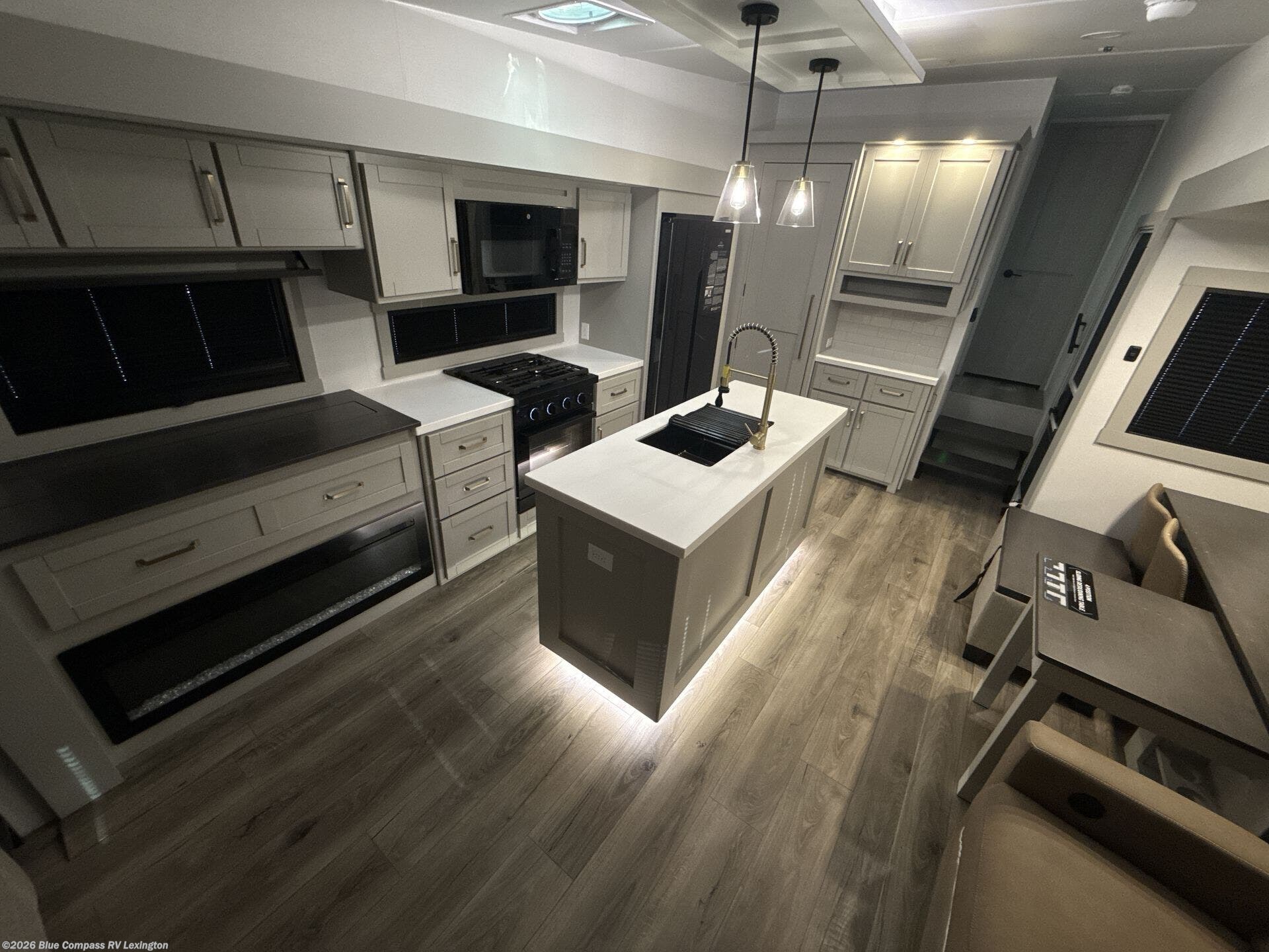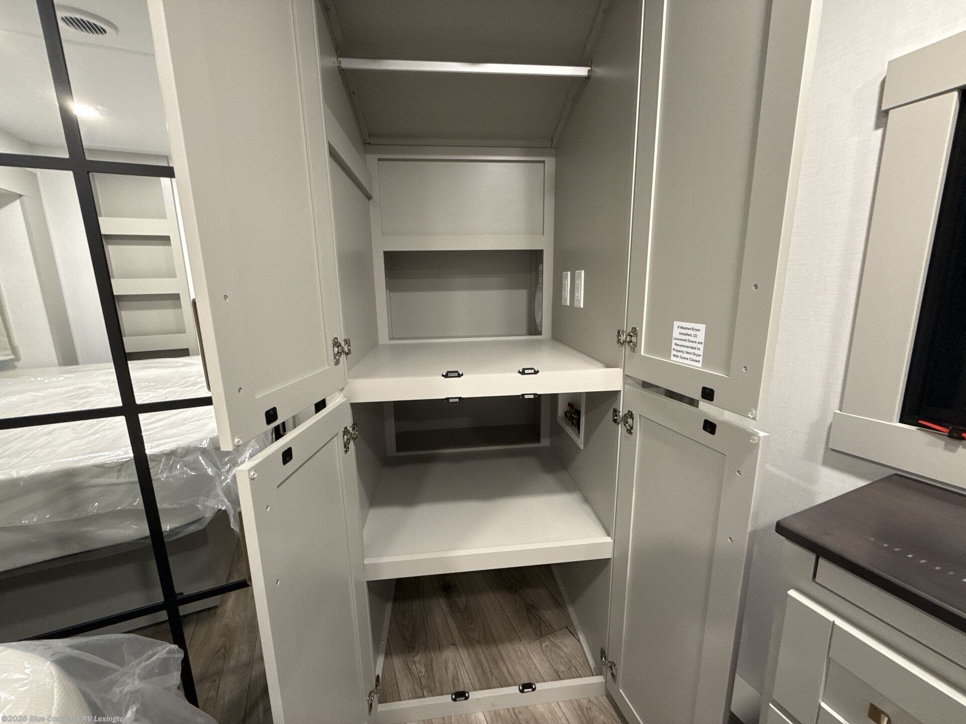 This Model Z luxury fifth wheel is bright and modern on the inside, with loads of amenities that will have you dreaming of your next trip! Enter and find a spacious combined living/kitchen space thanks to dual opposing slides. There is ample seating with a sliding desk/dining table, 62" theater seating, and a 72" tri-fold sofa along the rear wall. You can easily relax and enjoy the 50" Smart telescoping TV with a cozy fireplace below. The kitchen offers all that you need to prepare and cook meals just like home with a 16 cu. ft. refrigerator for your perishables, a 30" microwave oven, and three burner range top and oven. You will love the integrated spice rack, and the kitchen island all outfitted with dog bowls and double pull out trash bins with an integrated Stow 'N Go paper towel holder. There is also an 84" pantry with adjustable shelves for all of your canned and dry goods. Head up the steps to a private master suite with king bed slide. You can opt for the queen bed if you like. A sliding dresser top features hidden storage which is perfect for jewelry and other personal belongings. The front wardrobe features mirrored doors and the corner closet has been prepped for a stackable washer and dryer if you choose to add that option. Relax and enjoy a large bath featuring a linen cabinet, a 30" x 42" shower, and vanity with sink, plus medicine cabinet.