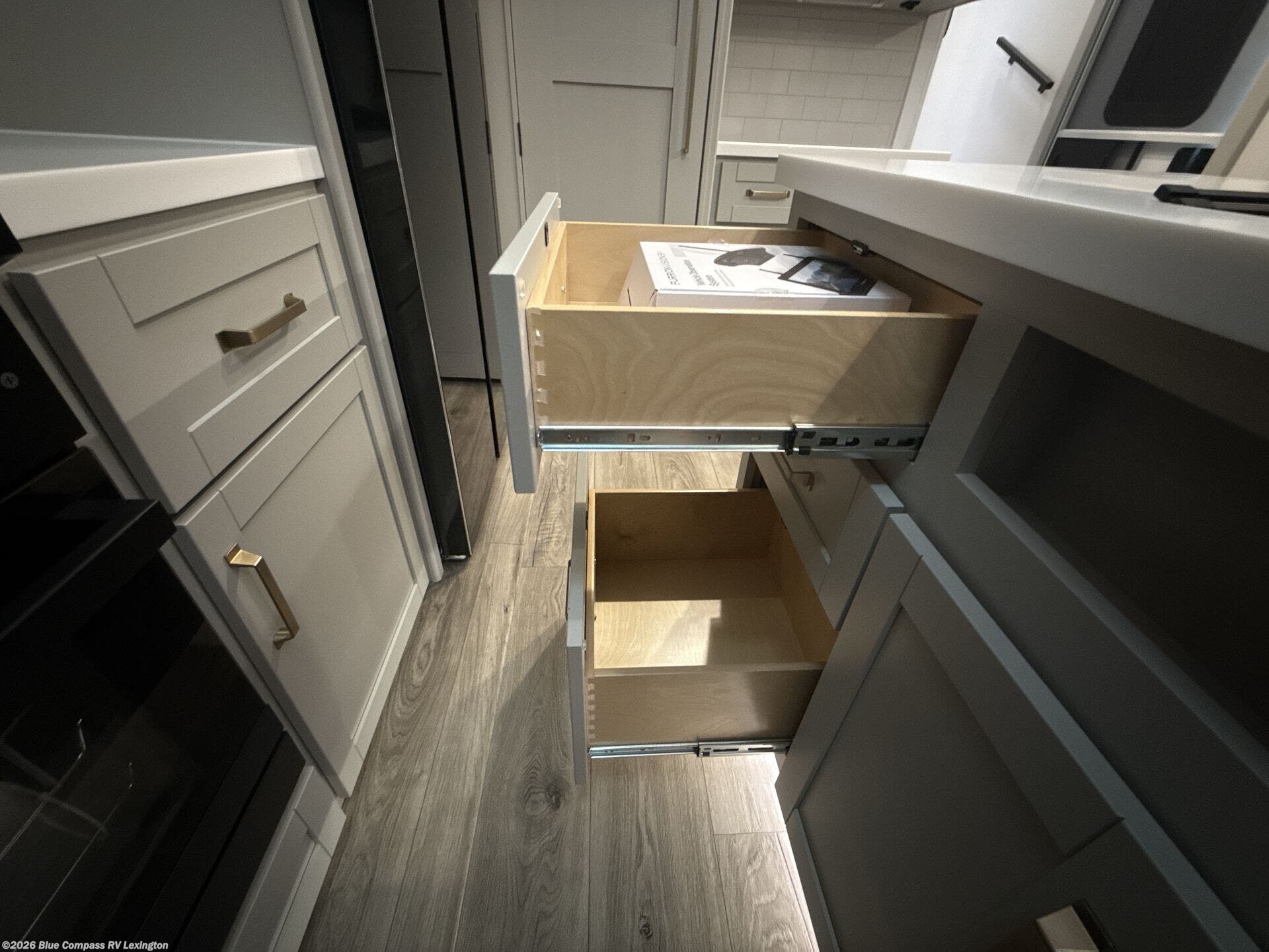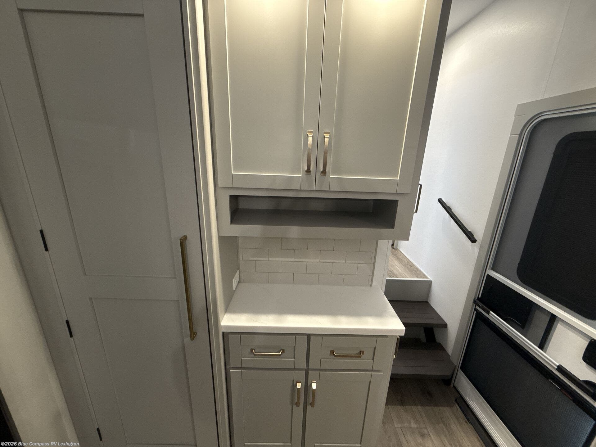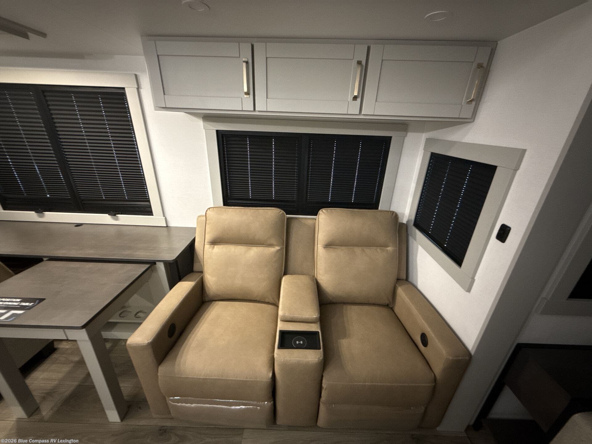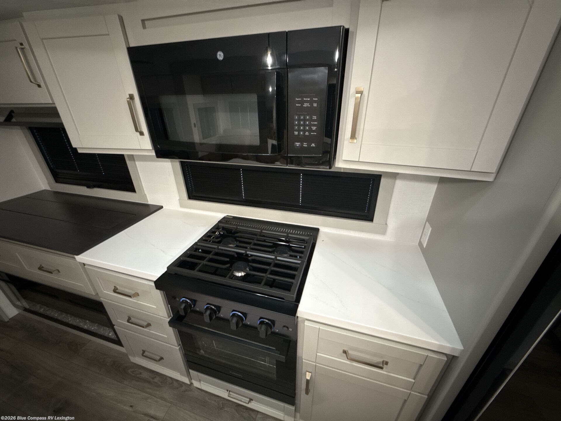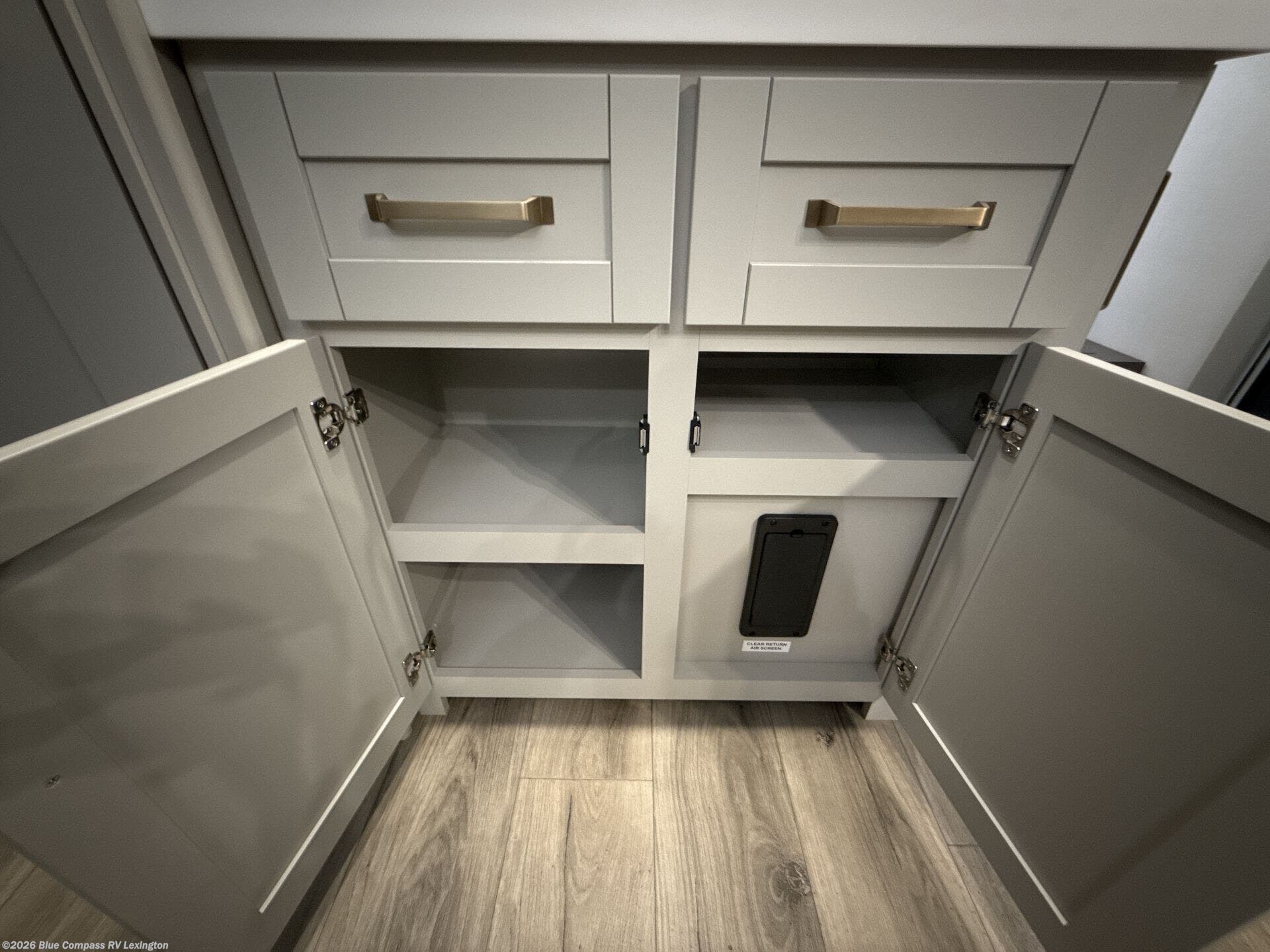 This Model Z luxury fifth wheel is bright and modern on the inside, with loads of amenities that will have you dreaming of your next trip! Enter and find a spacious combined living/kitchen space thanks to dual opposing slides. There is ample seating with a sliding desk/dining table, 62" theater seating, and a 72" tri-fold sofa along the rear wall. You can easily relax and enjoy the 50" Smart telescoping TV with a cozy fireplace below. The kitchen offers all that you need to prepare and cook meals just like home with a 16 cu. ft. refrigerator for your perishables, a 30" microwave oven, and three burner range top and oven. You will love the integrated spice rack, and the kitchen island all outfitted with dog bowls and double pull out trash bins with an integrated Stow 'N Go paper towel holder. There is also an 84" pantry with adjustable shelves for all of your canned and dry goods. Head up the steps to a private master suite with king bed slide. You can opt for the queen bed if you like. A sliding dresser top features hidden storage which is perfect for jewelry and other personal belongings. The front wardrobe features mirrored doors and the corner closet has been prepped for a stackable washer and dryer if you choose to add that option. Relax and enjoy a large bath featuring a linen cabinet, a 30" x 42" shower, and vanity with sink, plus medicine cabinet.