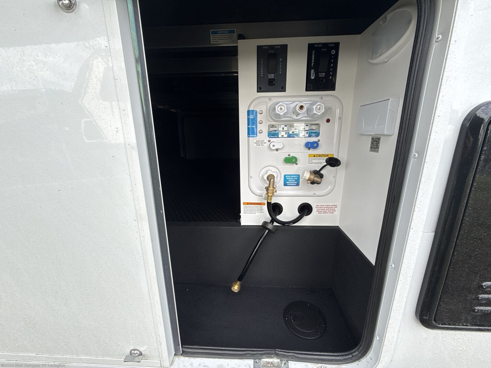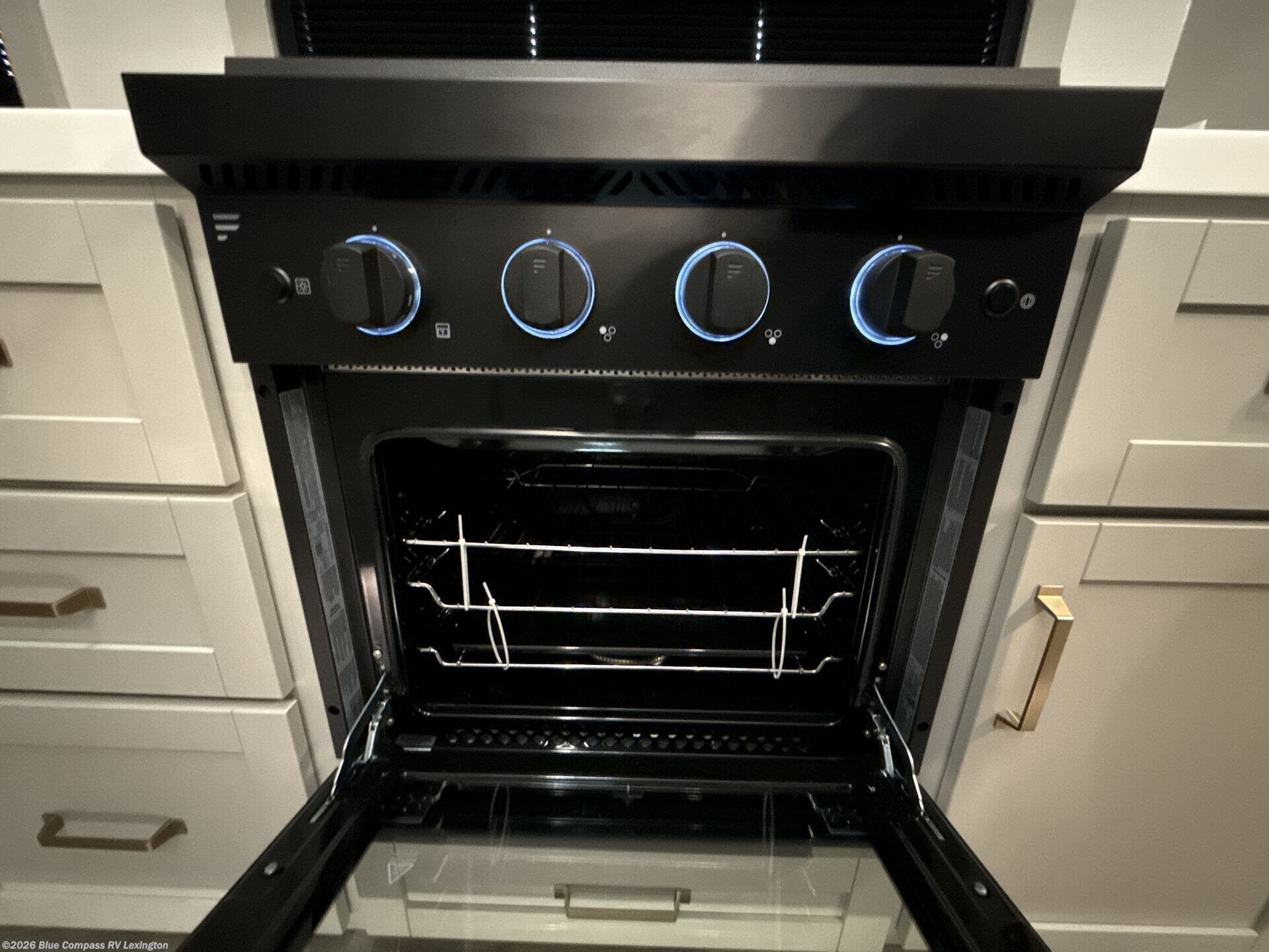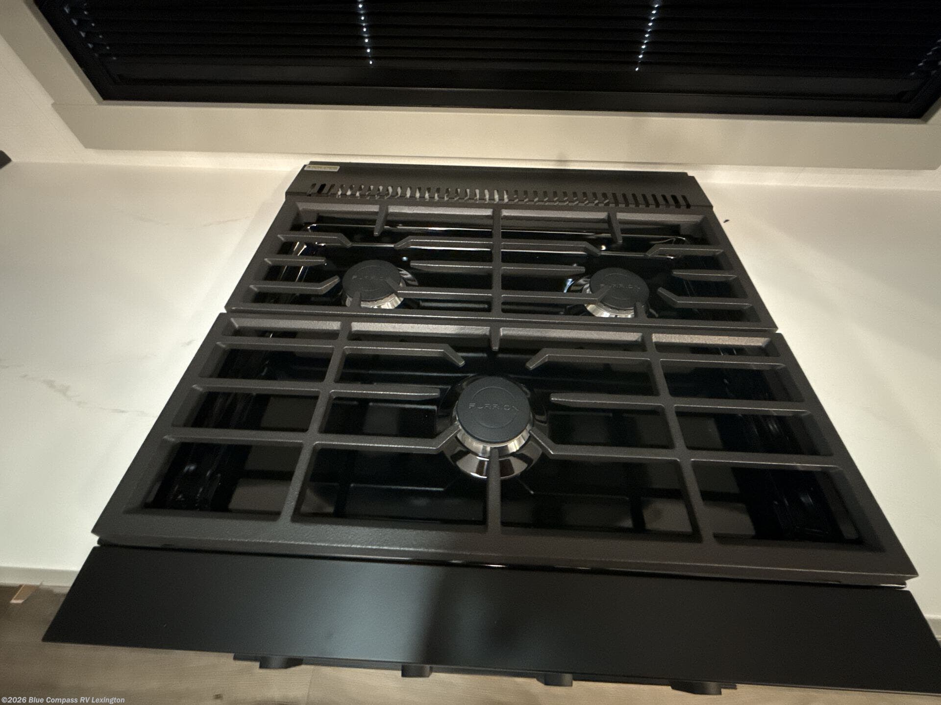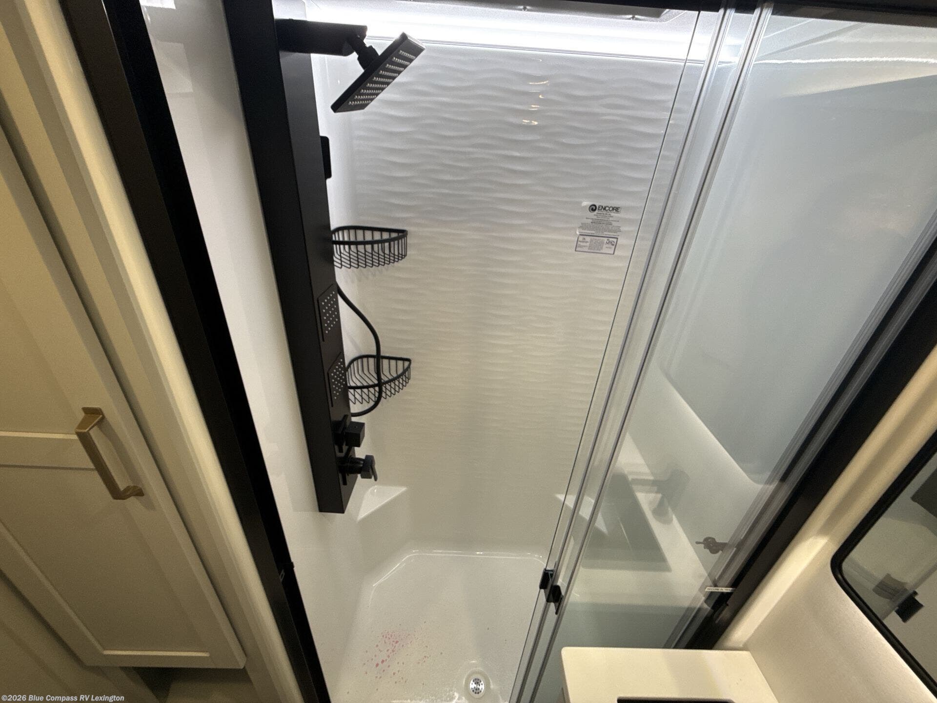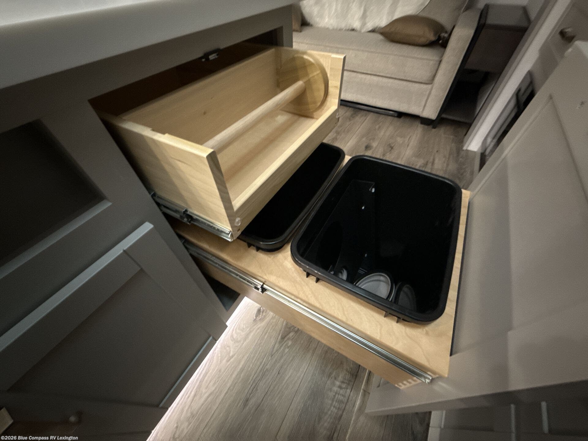 This Model Z luxury fifth wheel is bright and modern on the inside, with loads of amenities that will have you dreaming of your next trip! Enter and find a spacious combined living/kitchen space thanks to dual opposing slides. There is ample seating with a sliding desk/dining table, 62" theater seating, and a 72" tri-fold sofa along the rear wall. You can easily relax and enjoy the 50" Smart telescoping TV with a cozy fireplace below. The kitchen offers all that you need to prepare and cook meals just like home with a 16 cu. ft. refrigerator for your perishables, a 30" microwave oven, and three burner range top and oven. You will love the integrated spice rack, and the kitchen island all outfitted with dog bowls and double pull out trash bins with an integrated Stow 'N Go paper towel holder. There is also an 84" pantry with adjustable shelves for all of your canned and dry goods. Head up the steps to a private master suite with king bed slide. You can opt for the queen bed if you like. A sliding dresser top features hidden storage which is perfect for jewelry and other personal belongings. The front wardrobe features mirrored doors and the corner closet has been prepped for a stackable washer and dryer if you choose to add that option. Relax and enjoy a large bath featuring a linen cabinet, a 30" x 42" shower, and vanity with sink, plus medicine cabinet.