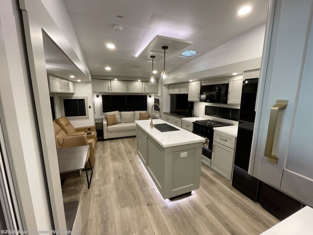 This Model Z luxury fifth wheel is bright and modern on the inside, with loads of amenities that will have you dreaming of your next trip! Enter and find a spacious combined living/kitchen space thanks to dual opposing slides. There is ample seating with a sliding desk/dining table, 62" theater seating, and a 72" tri-fold sofa along the rear wall. You can easily relax and enjoy the 50" Smart telescoping TV with a cozy fireplace below. The kitchen offers all that you need to prepare and cook meals just like home with a 16 cu. ft. refrigerator for your perishables, a 30" microwave oven, and three burner range top and oven. You will love the integrated spice rack, and the kitchen island all outfitted with dog bowls and double pull out trash bins with an integrated Stow 'N Go paper towel holder. There is also an 84" pantry with adjustable shelves for all of your canned and dry goods. Head up the steps to a private master suite with king bed slide. You can opt for the queen bed if you like. A sliding dresser top features hidden storage which is perfect for jewelry and other personal belongings. The front wardrobe features mirrored doors and the corner closet has been prepped for a stackable washer and dryer if you choose to add that option. Relax and enjoy a large bath featuring a linen cabinet, a 30" x 42" shower, and vanity with sink, plus medicine cabinet.