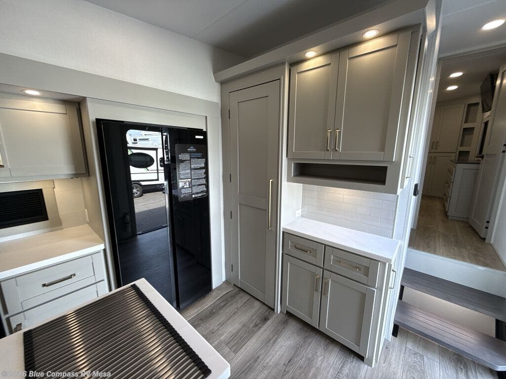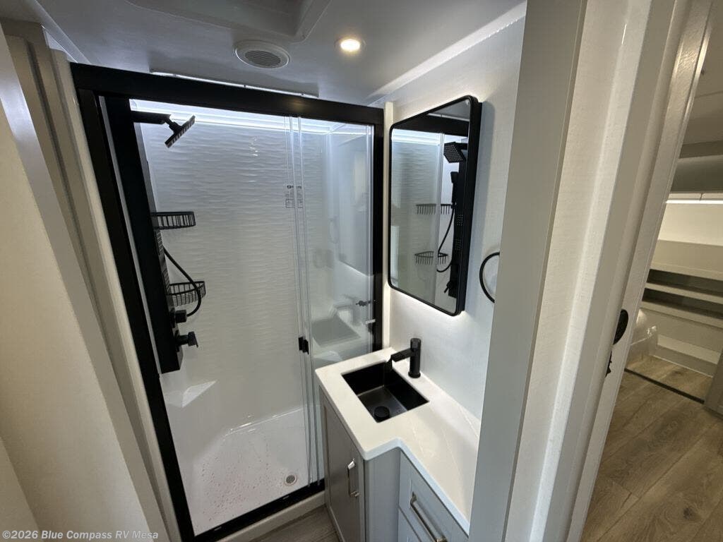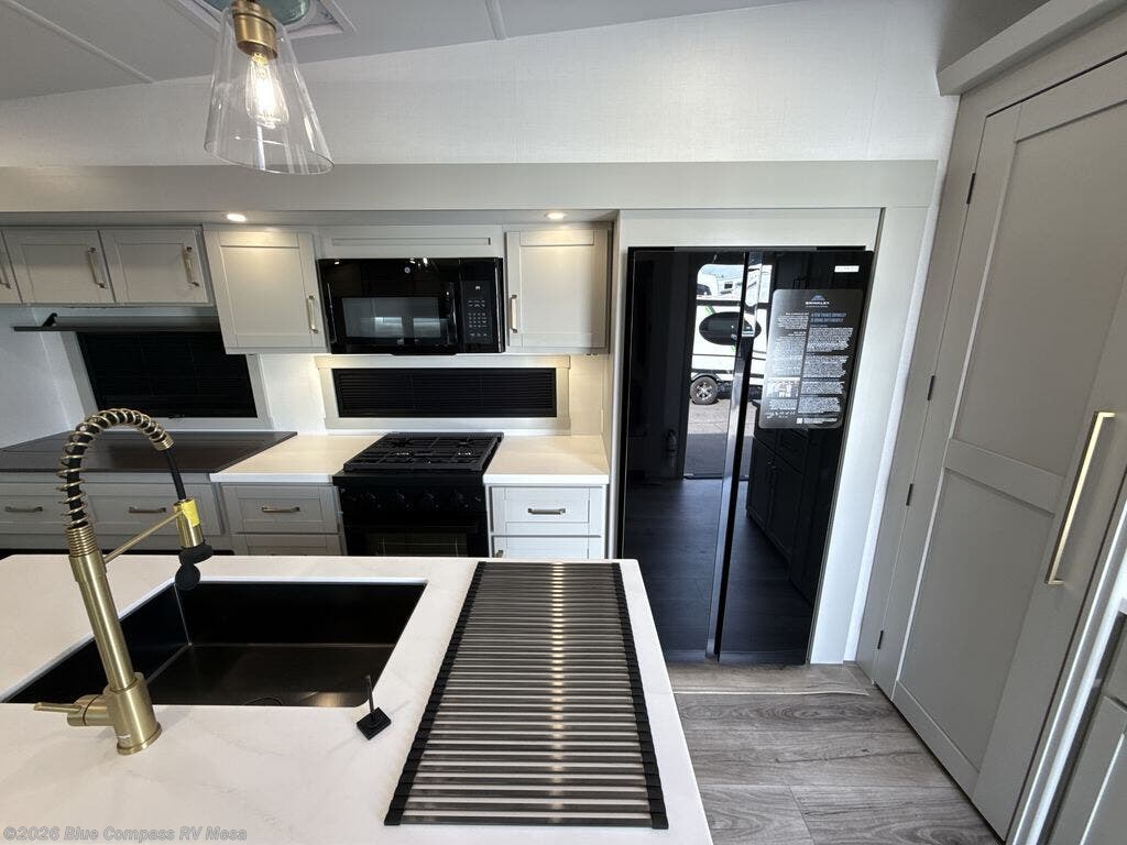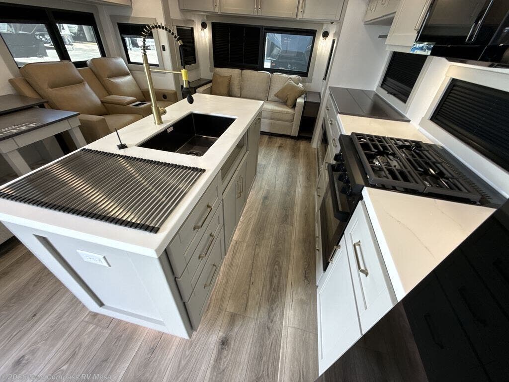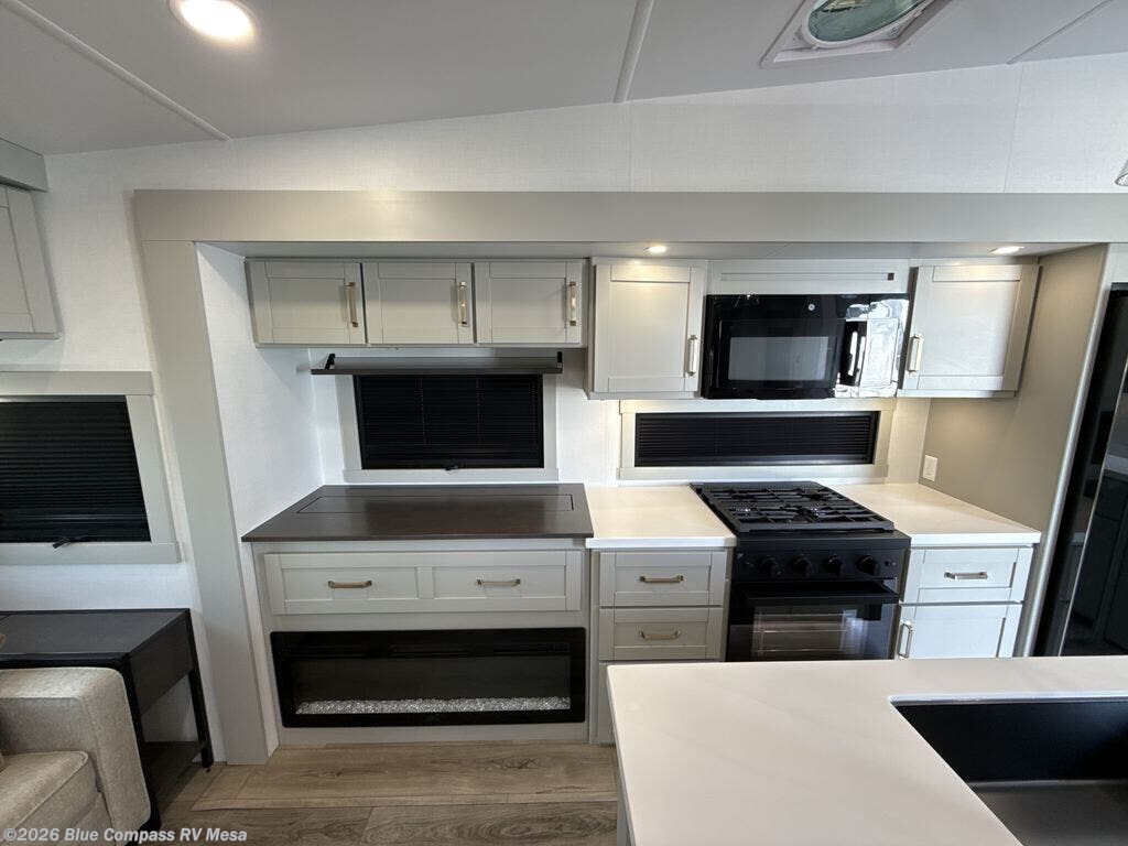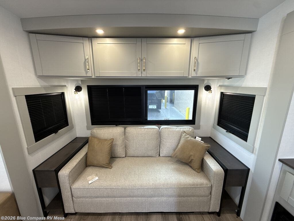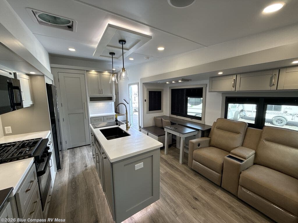 This Model Z luxury fifth wheel is bright and modern on the inside, with loads of amenities that will have you dreaming of your next trip! Enter and find a spacious combined living/kitchen space thanks to dual opposing slides. There is ample seating with a sliding desk/dining table, 62" theater seating, and a 72" tri-fold sofa along the rear wall. You can easily relax and enjoy the 50" Smart telescoping TV with a cozy fireplace below. The kitchen offers all that you need to prepare and cook meals just like home with a 16 cu. ft. refrigerator for your perishables, a 30" microwave oven, and three burner range top and oven. You will love the integrated spice rack, and the kitchen island all outfitted with dog bowls and double pull out trash bins with an integrated Stow 'N Go paper towel holder. There is also an 84" pantry with adjustable shelves for all of your canned and dry goods. Head up the steps to a private master suite with king bed slide. You can opt for the queen bed if you like. A sliding dresser top features hidden storage which is perfect for jewelry and other personal belongings. The front wardrobe features mirrored doors and the corner closet has been prepped for a stackable washer and dryer if you choose to add that option. Relax and enjoy a large bath featuring a linen cabinet, a 30" x 42" shower, and vanity with sink, plus medicine cabinet.