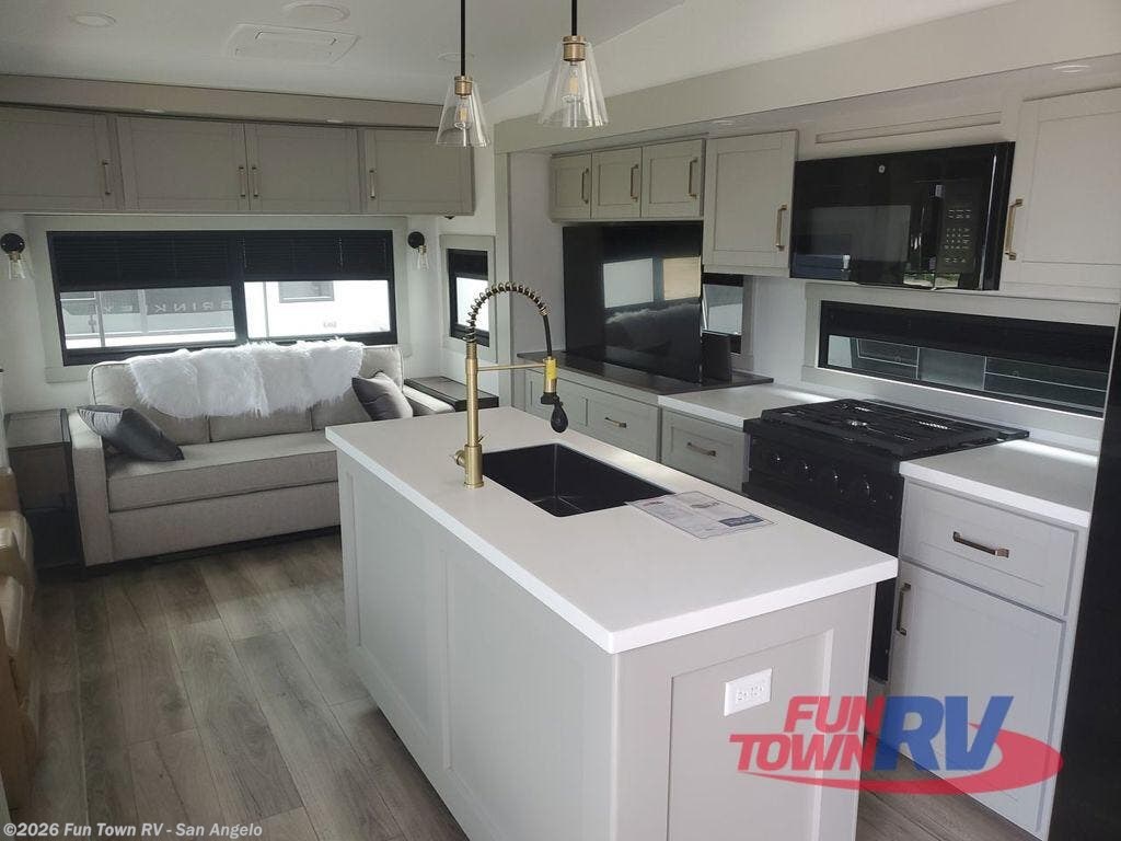 This Model Z luxury fifth wheel is bright and modern on the inside, with loads of amenities that will have you dreaming of your next trip! Enter and find a spacious combined living/kitchen space thanks to dual opposing slides. There is ample seating with a sliding desk/dining table, 62" theater seating, and a 72" tri-fold sofa along the rear wall. You can easily relax and enjoy the 50" Smart telescoping TV with a cozy fireplace below. The kitchen offers all that you need to prepare and cook meals just like home with a 16 cu. ft. refrigerator for your perishables, a 30" microwave oven, and three burner range top and oven. You will love the integrated spice rack, and the kitchen island all outfitted with dog bowls and double pull out trash bins with an integrated Stow 'N Go paper towel holder. There is also an 84" pantry with adjustable shelves for all of your canned and dry goods. Head up the steps to a private master suite with king bed slide. You can opt for the queen bed if you like. A sliding dresser top features hidden storage which is perfect for jewelry and other personal belongings. The front wardrobe features mirrored doors and the corner closet has been prepped for a stackable washer and dryer if you choose to add that option. Relax and enjoy a large bath featuring a linen cabinet, a 30" x 42" shower, and vanity with sink, plus medicine cabinet.