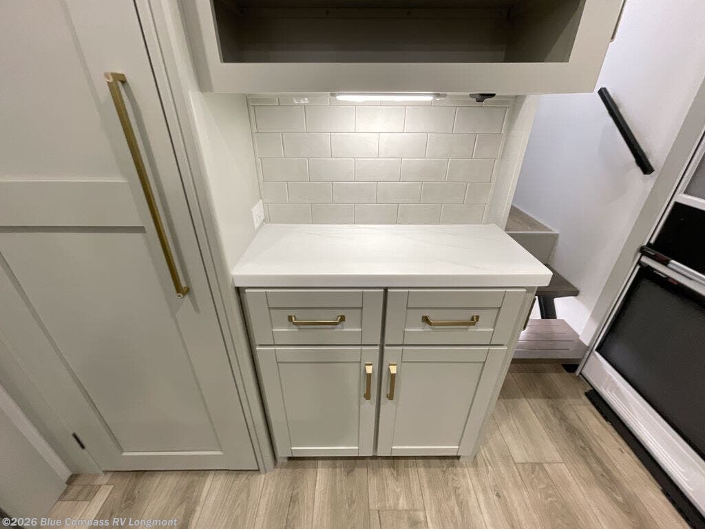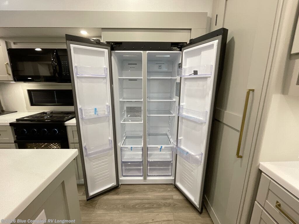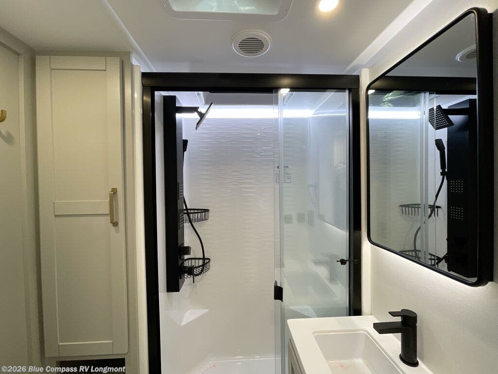 This Model Z luxury fifth wheel is bright and modern on the inside, with loads of amenities that will have you dreaming of your next trip! Enter and find a spacious combined living/kitchen space thanks to dual opposing slides. There is ample seating with a sliding desk/dining table, 62" theater seating, and a 72" tri-fold sofa along the rear wall. You can easily relax and enjoy the 50" Smart telescoping TV with a cozy fireplace below. The kitchen offers all that you need to prepare and cook meals just like home with a 16 cu. ft. refrigerator for your perishables, a 30" microwave oven, and three burner range top and oven. You will love the integrated spice rack, and the kitchen island all outfitted with dog bowls and double pull out trash bins with an integrated Stow 'N Go paper towel holder. There is also an 84" pantry with adjustable shelves for all of your canned and dry goods. Head up the steps to a private master suite with king bed slide. You can opt for the queen bed if you like. A sliding dresser top features hidden storage which is perfect for jewelry and other personal belongings. The front wardrobe features mirrored doors and the corner closet has been prepped for a stackable washer and dryer if you choose to add that option. Relax and enjoy a large bath featuring a linen cabinet, a 30" x 42" shower, and vanity with sink, plus medicine cabinet.