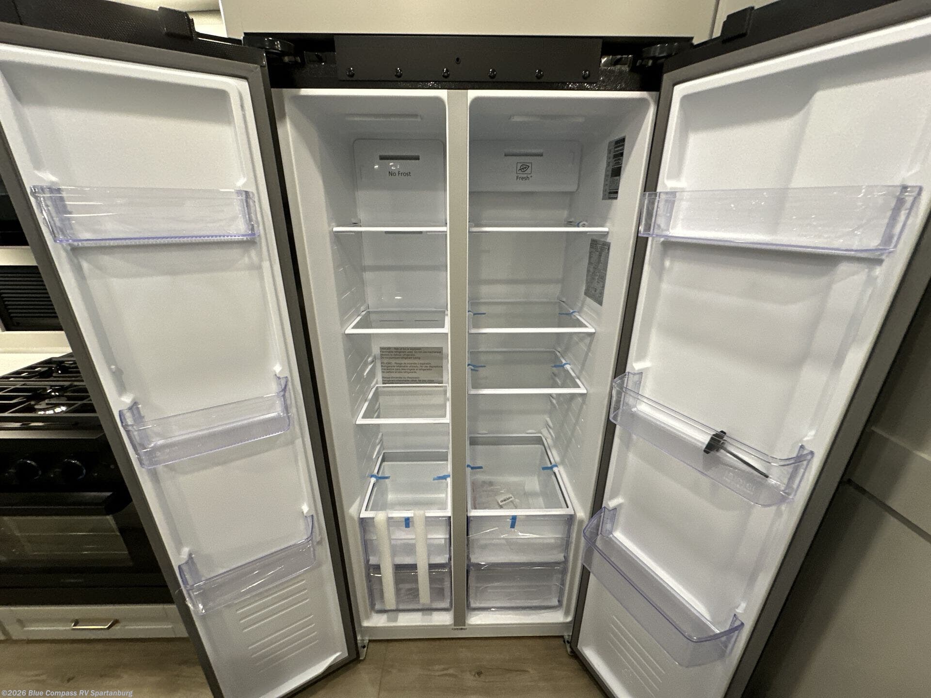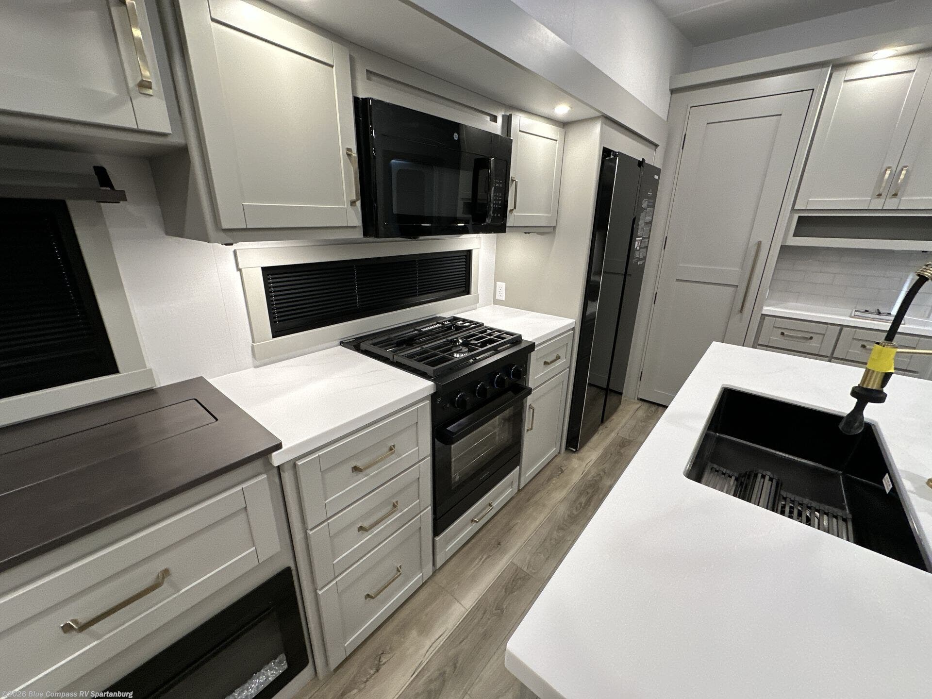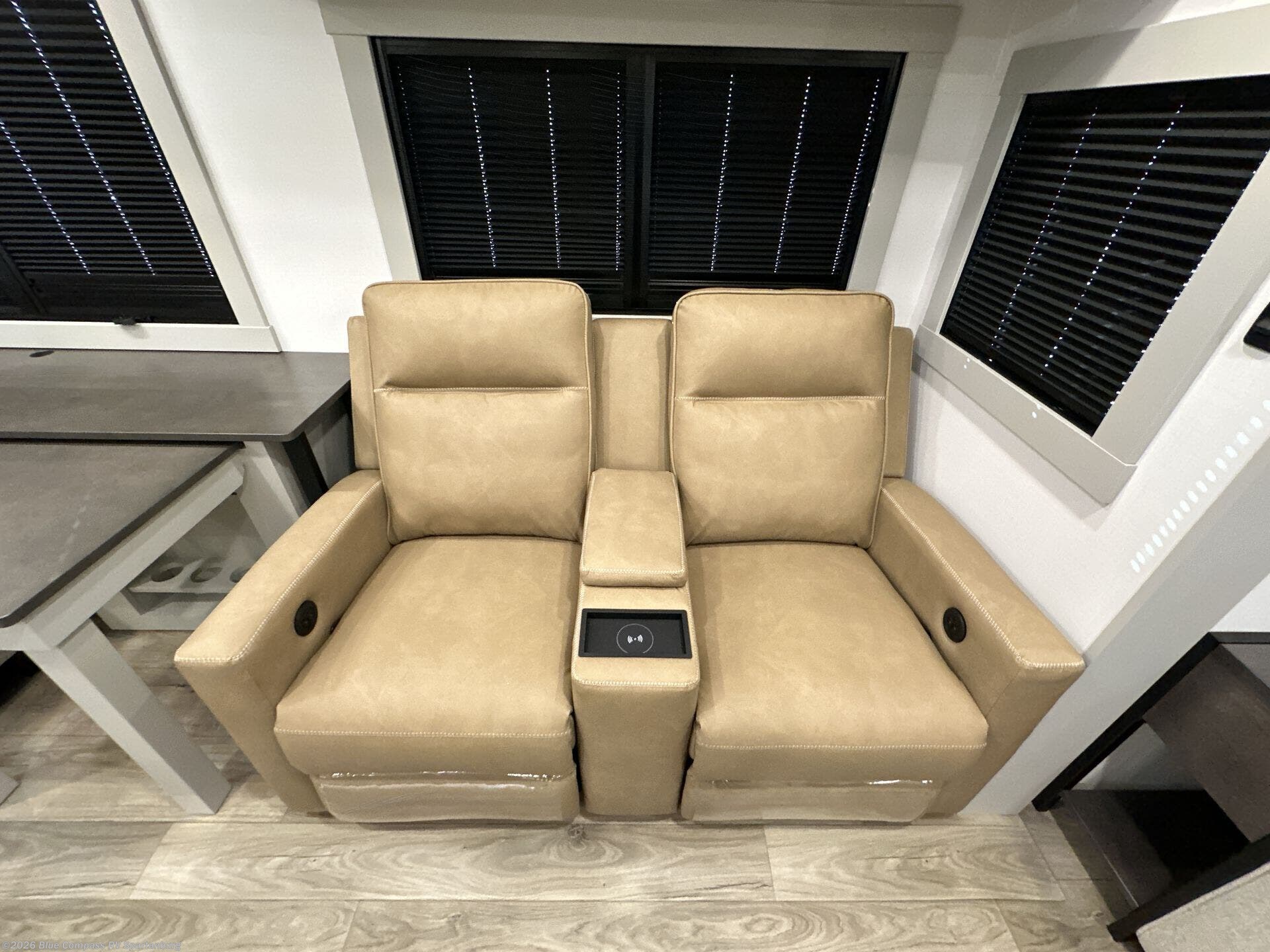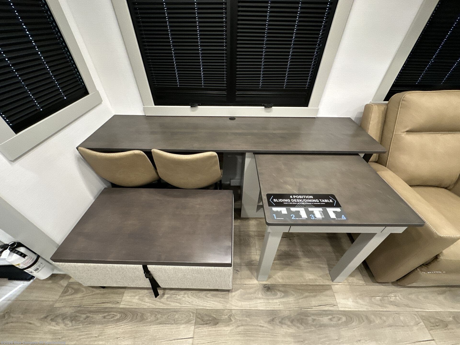 This Model Z luxury fifth wheel is bright and modern on the inside, with loads of amenities that will have you dreaming of your next trip! Enter and find a spacious combined living/kitchen space thanks to dual opposing slides. There is ample seating with a sliding desk/dining table, 62" theater seating, and a 72" tri-fold sofa along the rear wall. You can easily relax and enjoy the 50" Smart telescoping TV with a cozy fireplace below. The kitchen offers all that you need to prepare and cook meals just like home with a 16 cu. ft. refrigerator for your perishables, a 30" microwave oven, and three burner range top and oven. You will love the integrated spice rack, and the kitchen island all outfitted with dog bowls and double pull out trash bins with an integrated Stow 'N Go paper towel holder. There is also an 84" pantry with adjustable shelves for all of your canned and dry goods. Head up the steps to a private master suite with king bed slide. You can opt for the queen bed if you like. A sliding dresser top features hidden storage which is perfect for jewelry and other personal belongings. The front wardrobe features mirrored doors and the corner closet has been prepped for a stackable washer and dryer if you choose to add that option. Relax and enjoy a large bath featuring a linen cabinet, a 30" x 42" shower, and vanity with sink, plus medicine cabinet.