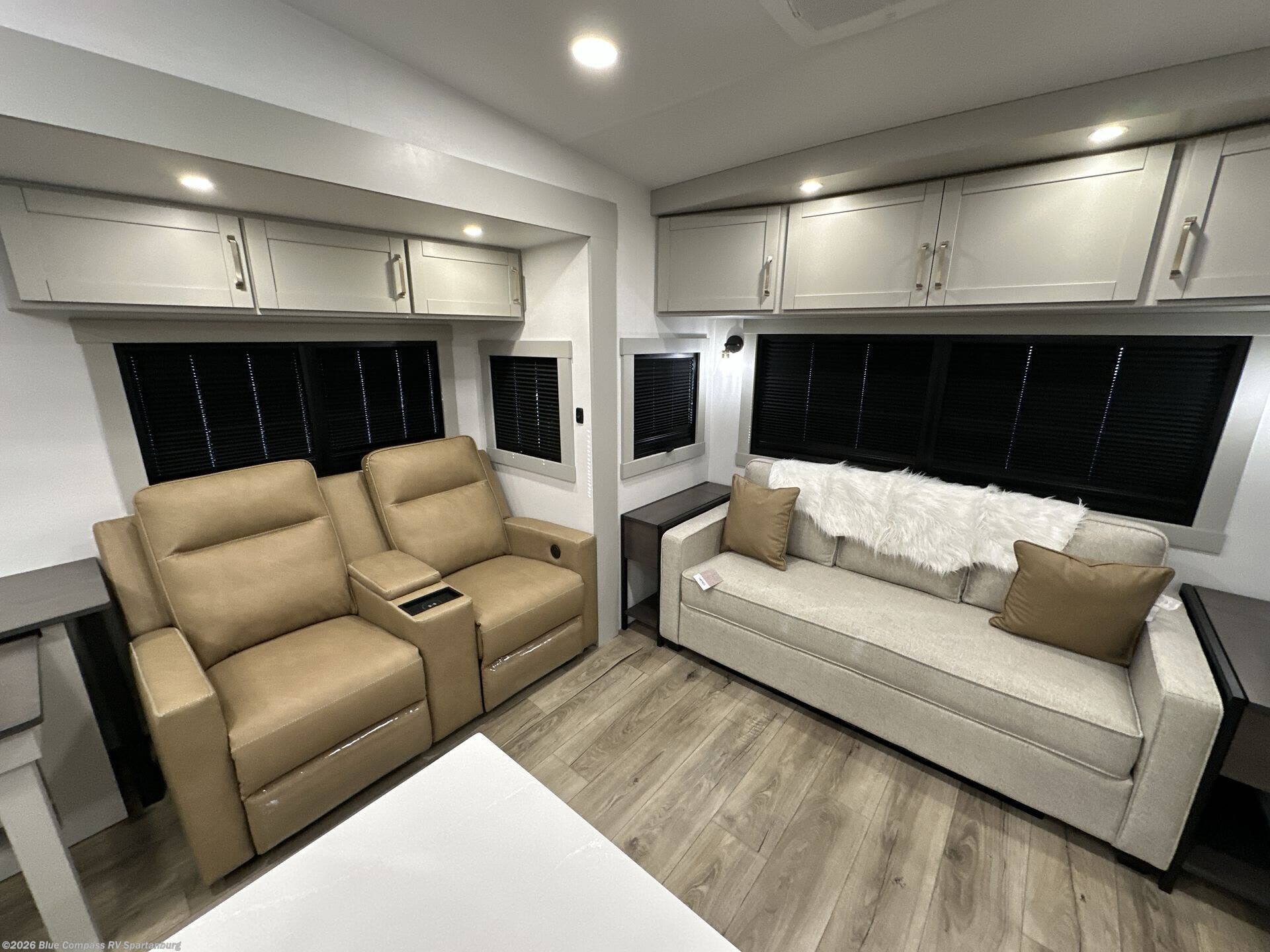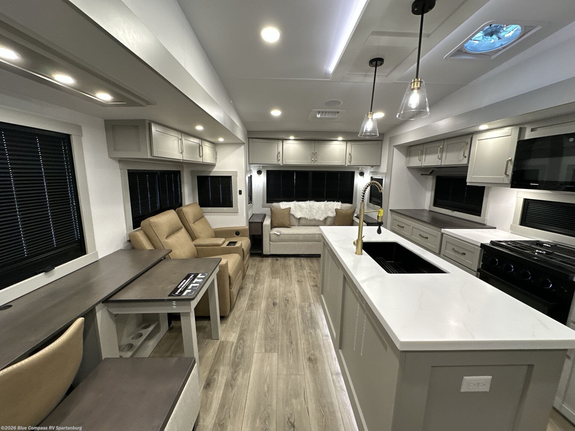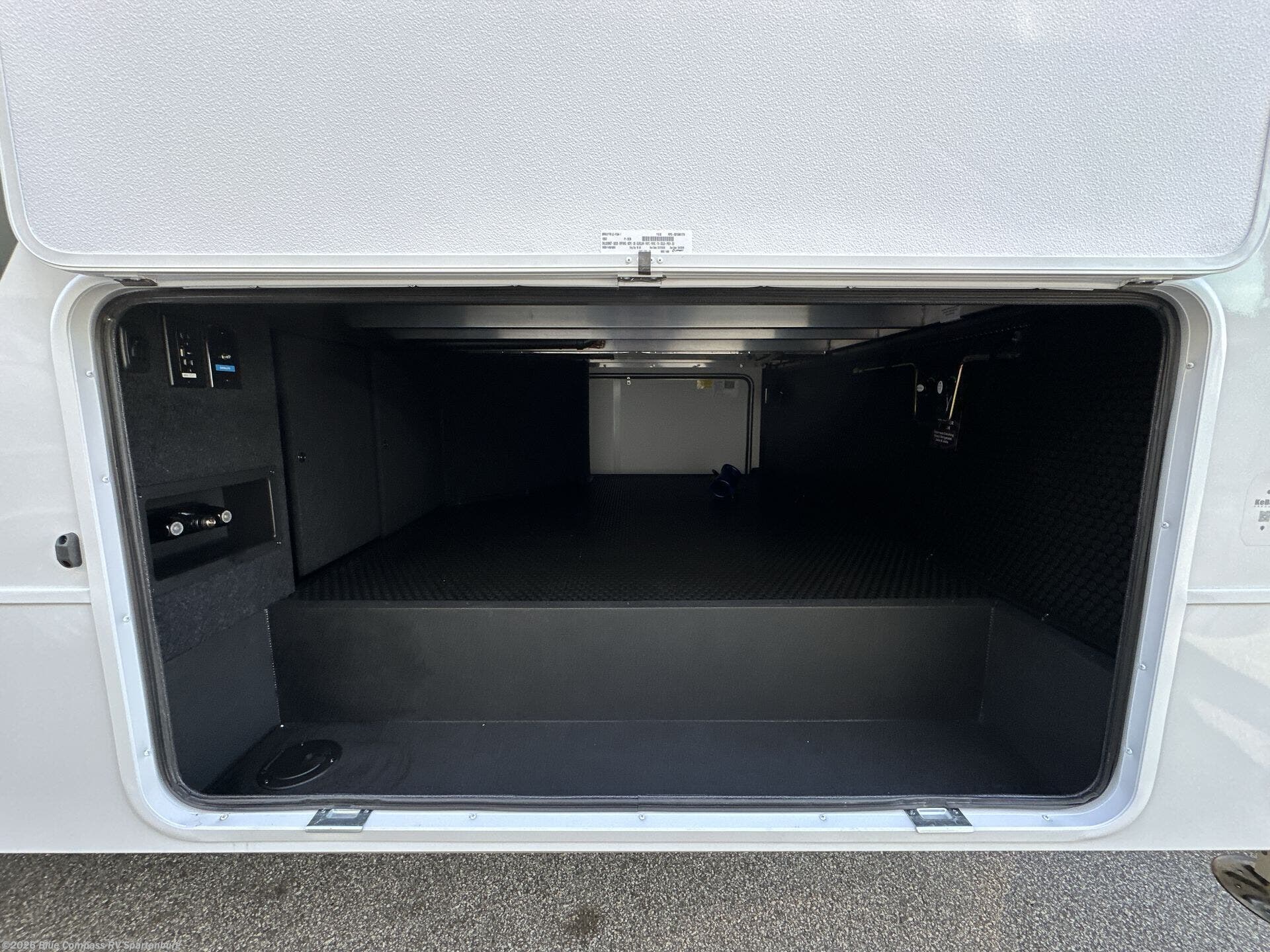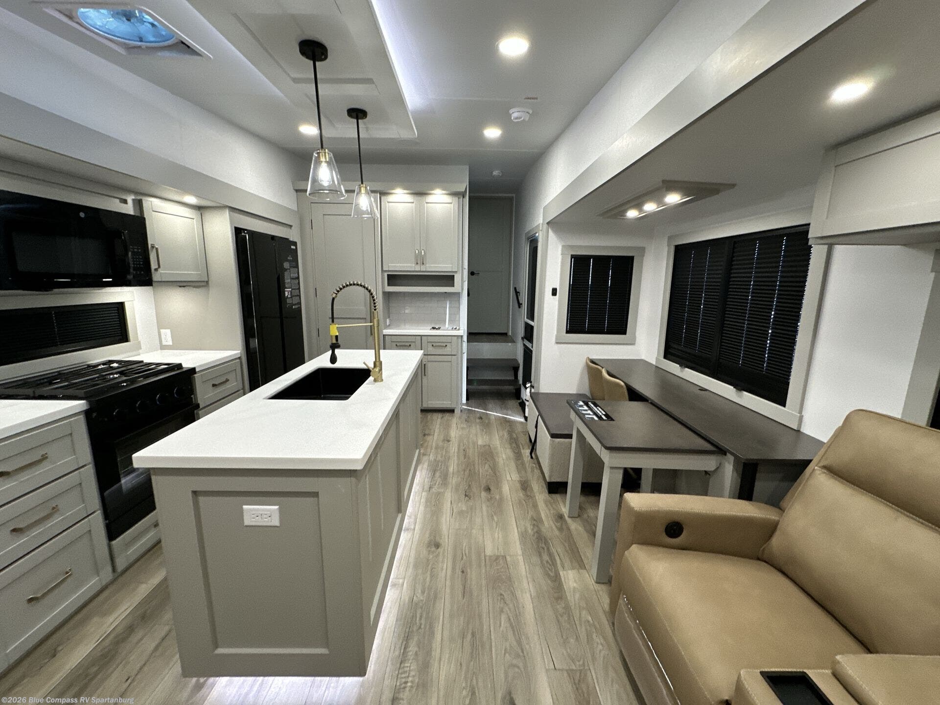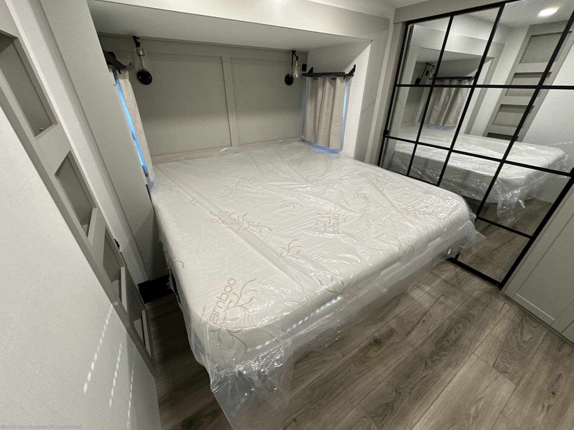 This Model Z luxury fifth wheel is bright and modern on the inside, with loads of amenities that will have you dreaming of your next trip! Enter and find a spacious combined living/kitchen space thanks to dual opposing slides. There is ample seating with a sliding desk/dining table, 62" theater seating, and a 72" tri-fold sofa along the rear wall. You can easily relax and enjoy the 50" Smart telescoping TV with a cozy fireplace below. The kitchen offers all that you need to prepare and cook meals just like home with a 16 cu. ft. refrigerator for your perishables, a 30" microwave oven, and three burner range top and oven. You will love the integrated spice rack, and the kitchen island all outfitted with dog bowls and double pull out trash bins with an integrated Stow 'N Go paper towel holder. There is also an 84" pantry with adjustable shelves for all of your canned and dry goods. Head up the steps to a private master suite with king bed slide. You can opt for the queen bed if you like. A sliding dresser top features hidden storage which is perfect for jewelry and other personal belongings. The front wardrobe features mirrored doors and the corner closet has been prepped for a stackable washer and dryer if you choose to add that option. Relax and enjoy a large bath featuring a linen cabinet, a 30" x 42" shower, and vanity with sink, plus medicine cabinet.