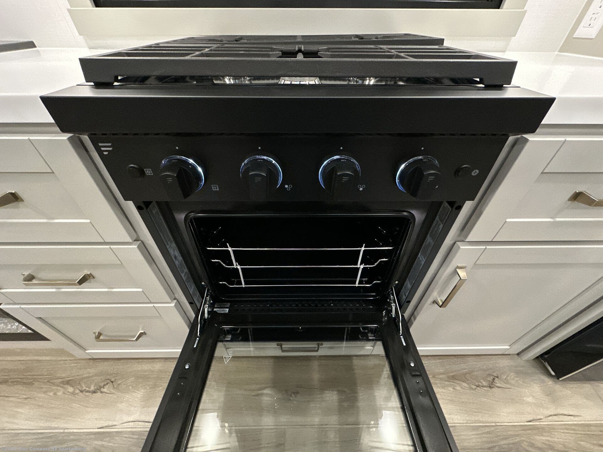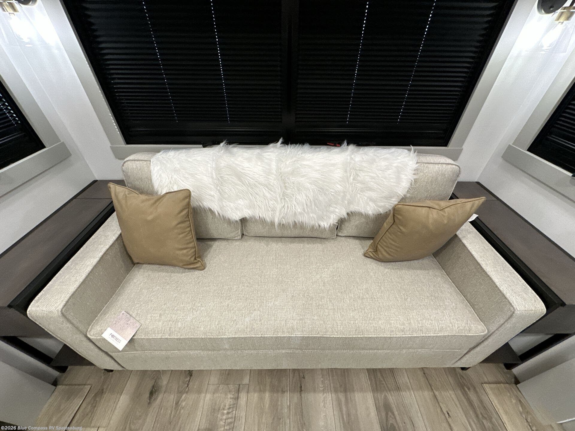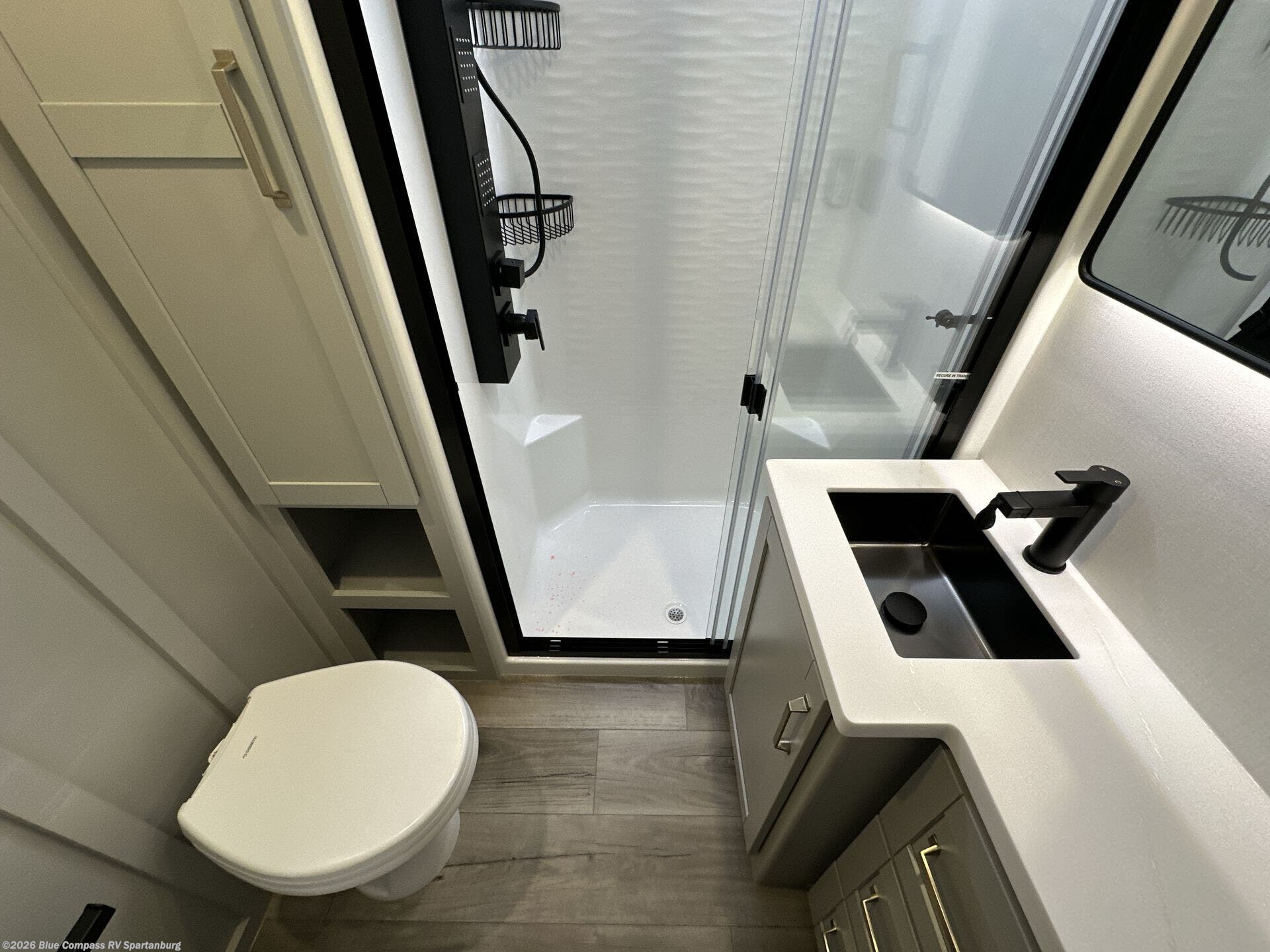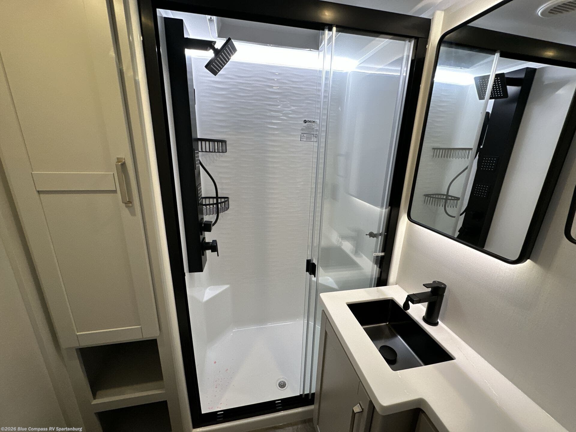 This Model Z luxury fifth wheel is bright and modern on the inside, with loads of amenities that will have you dreaming of your next trip! Enter and find a spacious combined living/kitchen space thanks to dual opposing slides. There is ample seating with a sliding desk/dining table, 62" theater seating, and a 72" tri-fold sofa along the rear wall. You can easily relax and enjoy the 50" Smart telescoping TV with a cozy fireplace below. The kitchen offers all that you need to prepare and cook meals just like home with a 16 cu. ft. refrigerator for your perishables, a 30" microwave oven, and three burner range top and oven. You will love the integrated spice rack, and the kitchen island all outfitted with dog bowls and double pull out trash bins with an integrated Stow 'N Go paper towel holder. There is also an 84" pantry with adjustable shelves for all of your canned and dry goods. Head up the steps to a private master suite with king bed slide. You can opt for the queen bed if you like. A sliding dresser top features hidden storage which is perfect for jewelry and other personal belongings. The front wardrobe features mirrored doors and the corner closet has been prepped for a stackable washer and dryer if you choose to add that option. Relax and enjoy a large bath featuring a linen cabinet, a 30" x 42" shower, and vanity with sink, plus medicine cabinet.