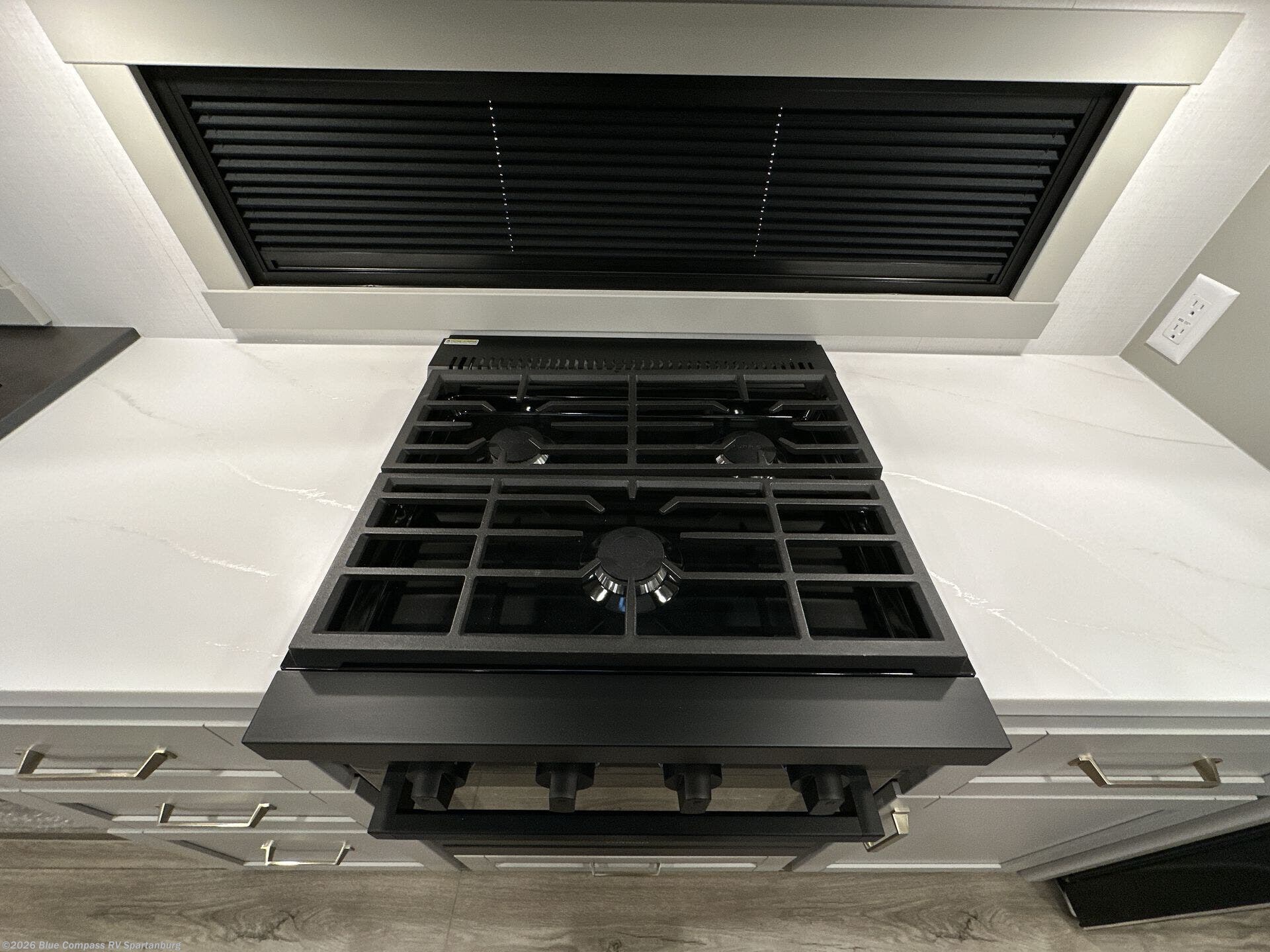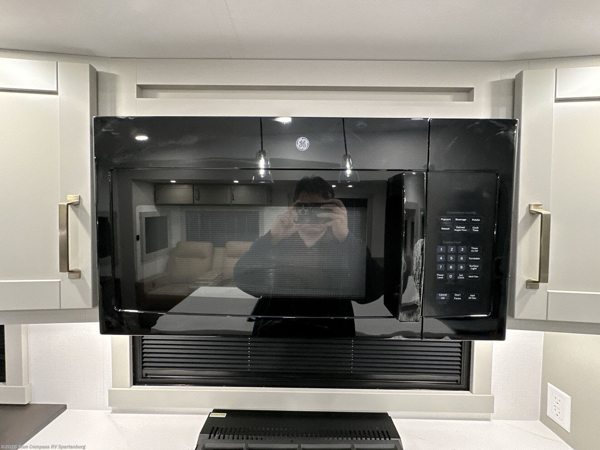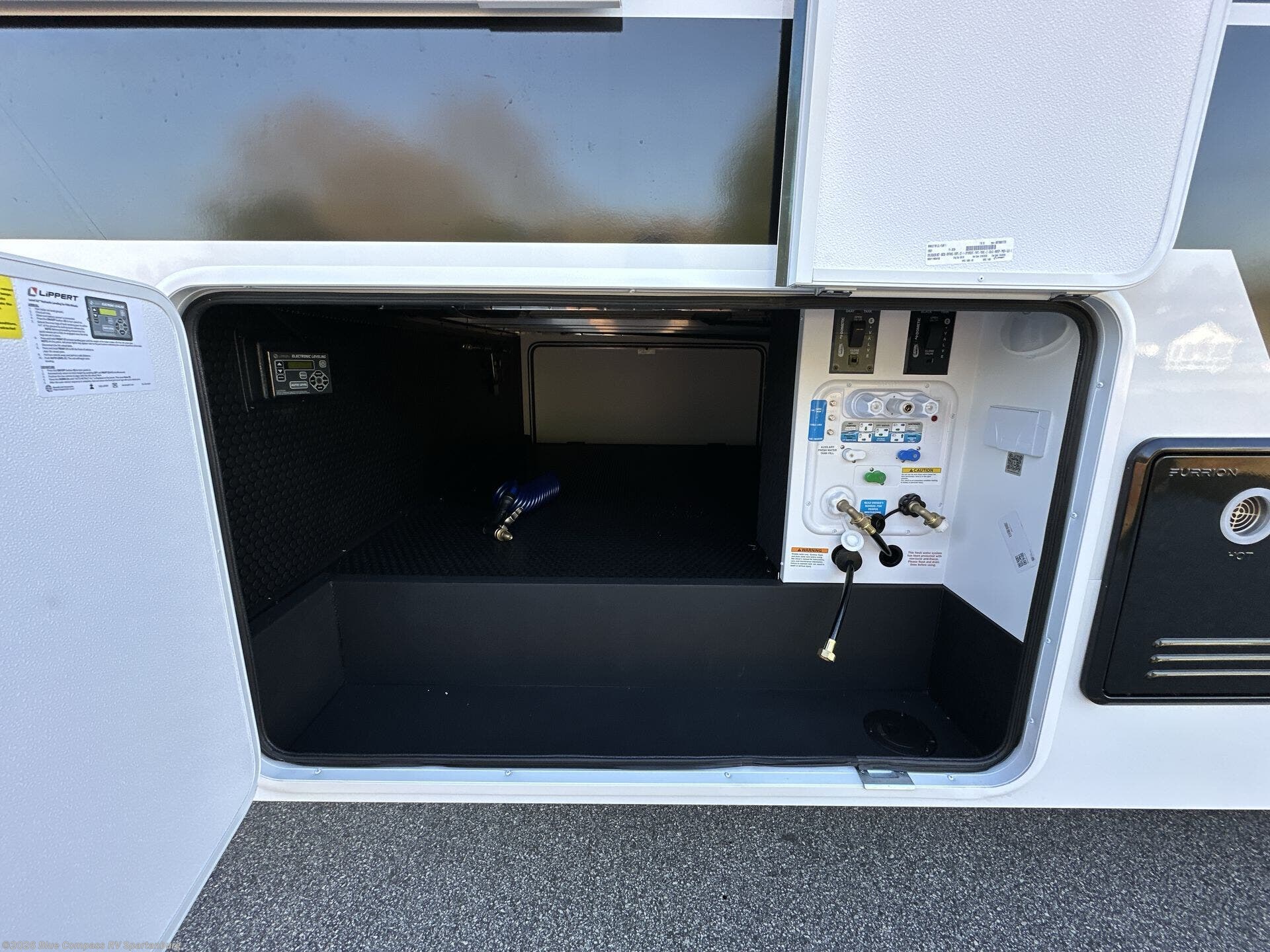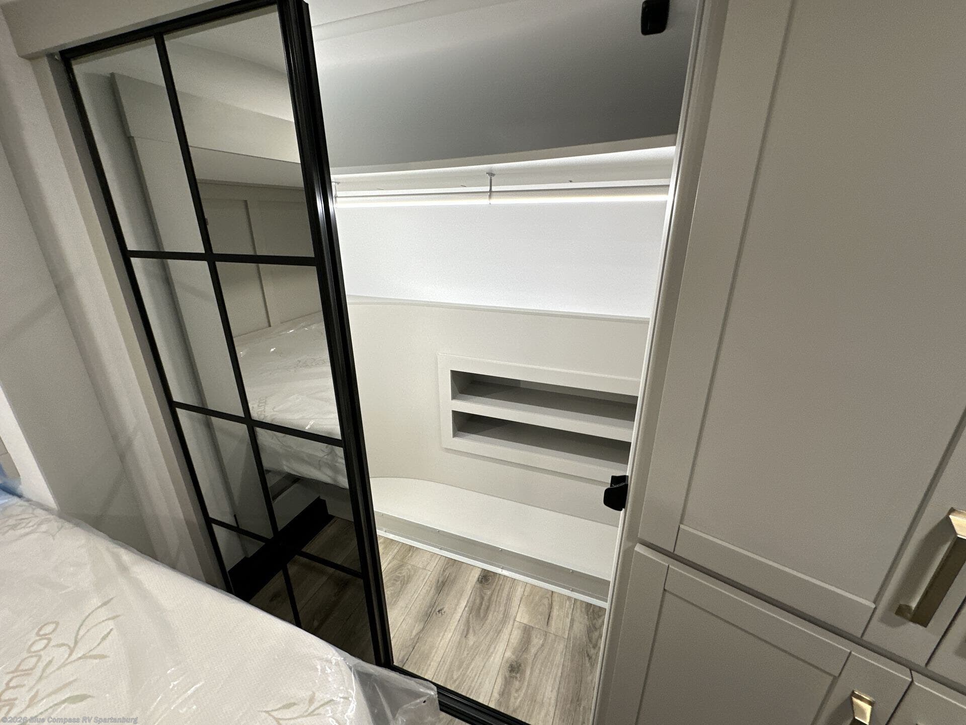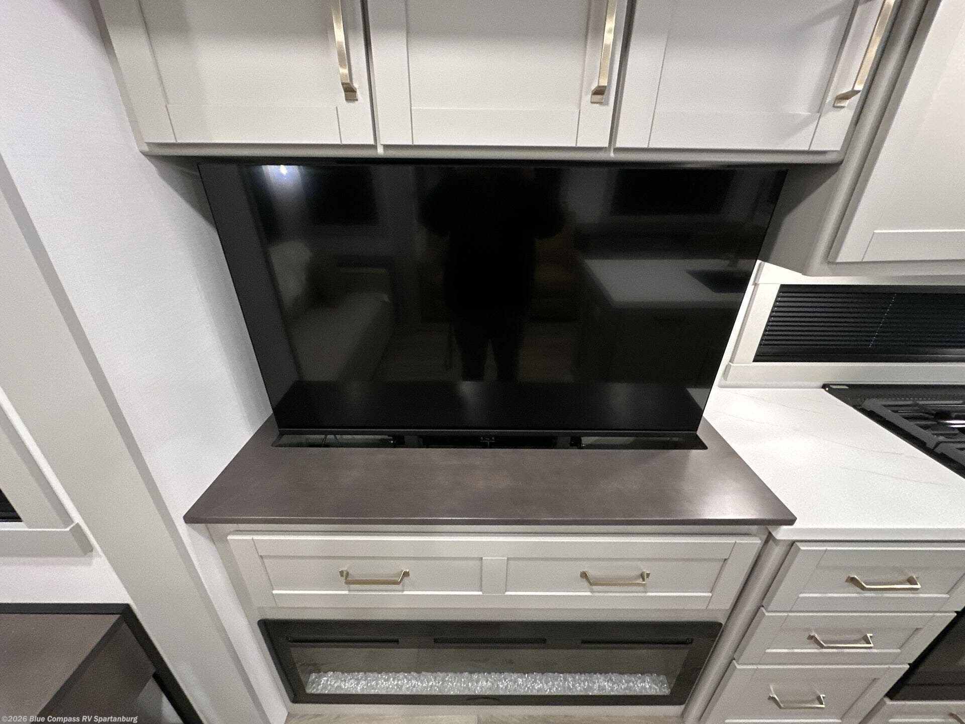 This Model Z luxury fifth wheel is bright and modern on the inside, with loads of amenities that will have you dreaming of your next trip! Enter and find a spacious combined living/kitchen space thanks to dual opposing slides. There is ample seating with a sliding desk/dining table, 62" theater seating, and a 72" tri-fold sofa along the rear wall. You can easily relax and enjoy the 50" Smart telescoping TV with a cozy fireplace below. The kitchen offers all that you need to prepare and cook meals just like home with a 16 cu. ft. refrigerator for your perishables, a 30" microwave oven, and three burner range top and oven. You will love the integrated spice rack, and the kitchen island all outfitted with dog bowls and double pull out trash bins with an integrated Stow 'N Go paper towel holder. There is also an 84" pantry with adjustable shelves for all of your canned and dry goods. Head up the steps to a private master suite with king bed slide. You can opt for the queen bed if you like. A sliding dresser top features hidden storage which is perfect for jewelry and other personal belongings. The front wardrobe features mirrored doors and the corner closet has been prepped for a stackable washer and dryer if you choose to add that option. Relax and enjoy a large bath featuring a linen cabinet, a 30" x 42" shower, and vanity with sink, plus medicine cabinet.