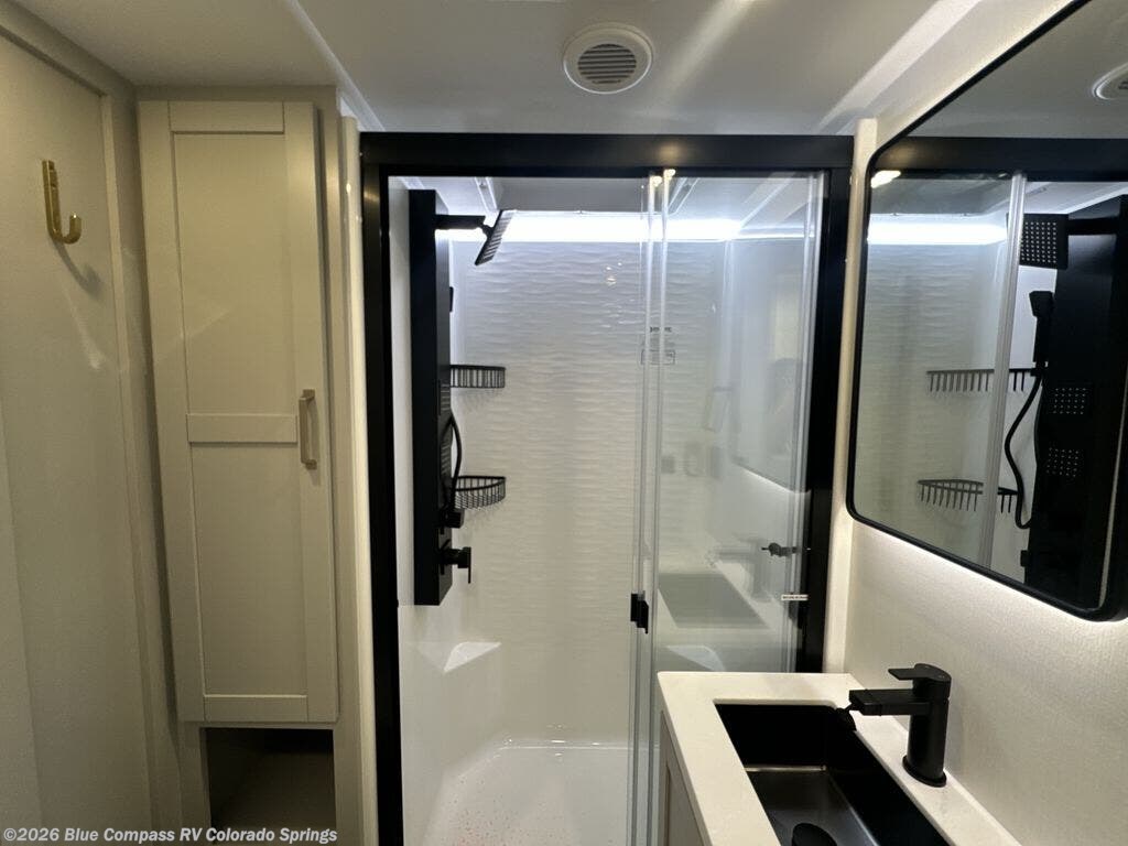 This Model Z luxury fifth wheel is bright and modern on the inside, with loads of amenities that will have you dreaming of your next trip! Enter and find a spacious combined living/kitchen space thanks to dual opposing slides. There is ample seating with a sliding desk/dining table, 62" theater seating, and a 72" tri-fold sofa along the rear wall. You can easily relax and enjoy the 50" Smart telescoping TV with a cozy fireplace below. The kitchen offers all that you need to prepare and cook meals just like home with a 16 cu. ft. refrigerator for your perishables, a 30" microwave oven, and three burner range top and oven. You will love the integrated spice rack, and the kitchen island all outfitted with dog bowls and double pull out trash bins with an integrated Stow 'N Go paper towel holder. There is also an 84" pantry with adjustable shelves for all of your canned and dry goods. Head up the steps to a private master suite with king bed slide. You can opt for the queen bed if you like. A sliding dresser top features hidden storage which is perfect for jewelry and other personal belongings. The front wardrobe features mirrored doors and the corner closet has been prepped for a stackable washer and dryer if you choose to add that option. Relax and enjoy a large bath featuring a linen cabinet, a 30" x 42" shower, and vanity with sink, plus medicine cabinet.
