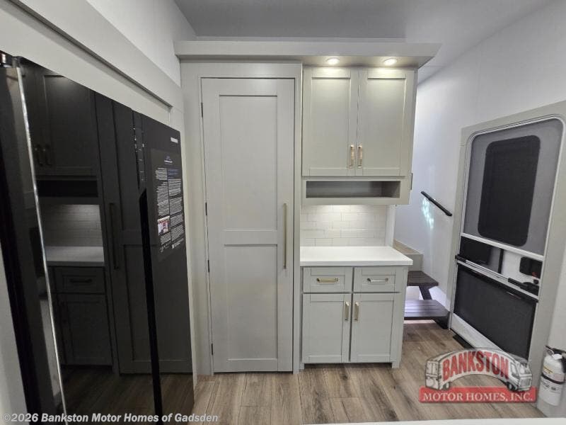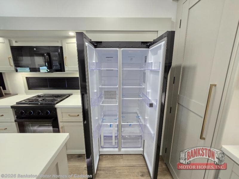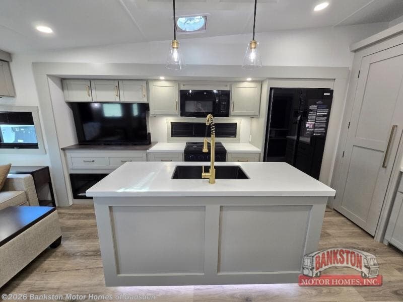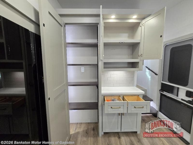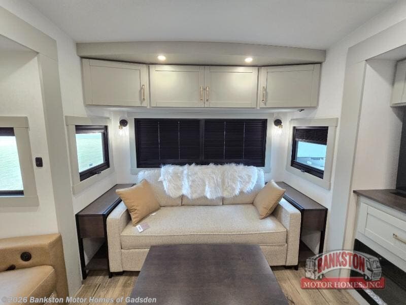 This Model Z luxury fifth wheel is bright and modern on the inside, with loads of amenities that will have you dreaming of your next trip! Enter and find a spacious combined living/kitchen space thanks to dual opposing slides. There is ample seating with a sliding desk/dining table, 62" theater seating, and a 72" tri-fold sofa along the rear wall. You can easily relax and enjoy the 50" Smart telescoping TV with a cozy fireplace below. The kitchen offers all that you need to prepare and cook meals just like home with a 16 cu. ft. refrigerator for your perishables, a 30" microwave oven, and three burner range top and oven. You will love the integrated spice rack, and the kitchen island all outfitted with dog bowls and double pull out trash bins with an integrated Stow 'N Go paper towel holder. There is also an 84" pantry with adjustable shelves for all of your canned and dry goods. Head up the steps to a private master suite with king bed slide. You can opt for the queen bed if you like. A sliding dresser top features hidden storage which is perfect for jewelry and other personal belongings. The front wardrobe features mirrored doors and the corner closet has been prepped for a stackable washer and dryer if you choose to add that option. Relax and enjoy a large bath featuring a linen cabinet, a 30" x 42" shower, and vanity with sink, plus medicine cabinet.