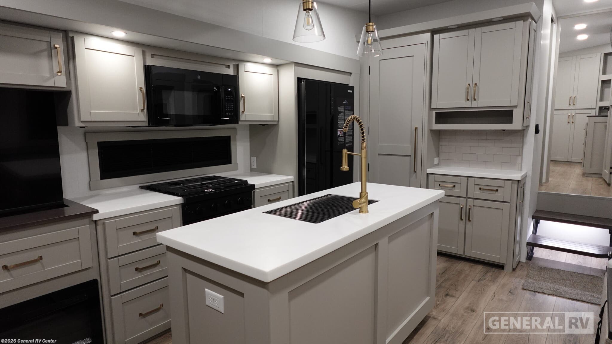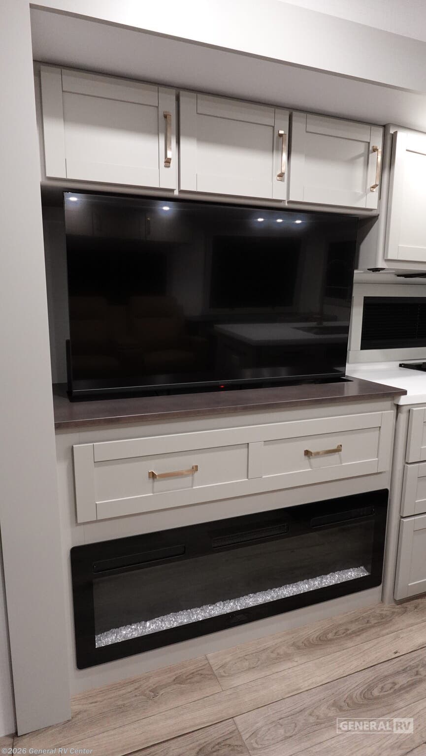 **Brinkley Model Z fifth wheel 3100 highlights:** - Theater Seating - Fireplace - Integrated Dog Bowls - Double Pull Out Trash Bins - 16 Cu. Ft. Refrigerator - Hidden Storage When you want travel accommodations to feel just like home! This Model Z luxury fifth wheel is bright and modern on the inside, with loads of amenities that will have you dreaming of your next trip! Enter and find a spacious combined living/kitchen space thanks to dual opposing slides. There is ample seating with a free standing dinette that includes a built-in utensil drawer, 62" theater seating, and a 72" tri-fold sofa along the rear wall. You can easily relax and enjoy the 50" Smart telescoping TV with a cozy fireplace below. The kitchen offers all that you need to prepare and cook meals just like home with a 16 cu. ft. refrigerator for your perishables, a 30" microwave oven, and three burner range top and oven. You will love the integrated spice rack, and the kitchen island all outfitted with dog bowls and double pull out trash bins with an integrated Stow & Go paper towel holder. There is also an 84" pantry with adjustable shelves for all of your canned and dry goods. Head up the steps to a private master suite with king bed slide. You can opt for the queen bed if you like. A sliding dresser top features hidden storage which is perfect for jewelry and other personal belongings. The front wardrobe features mirrored doors and the corner closet has been prepped for a stackable washer and dryer if you choose to add that option. Relax and enjoy a large bath featuring a linen cabinet, a 30" x 42" shower, and vanity with sink, plus medicine cabinet. You will also appreciate having dual showers on the outside of this unit, and a rear baggage door and mid-coach pass-through storage. The Brinkley mid-profile Model Z fifth wheels bring you clean lines and an upscale look with plenty of style and exciting new features like the industry first brass plumbing connections. These units also feature an automotive grade front cap, plenty of exterior storage, dual exterior hot and cold showers, and wide stance leveling jacks for easy set up. Residential frameless windows provide a clean look and beautiful views, and ample electrical outlets and 6 USB/USB-C outlets allow all of your electronics and appliances to easily be used and charged.