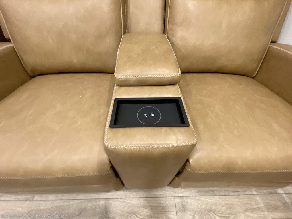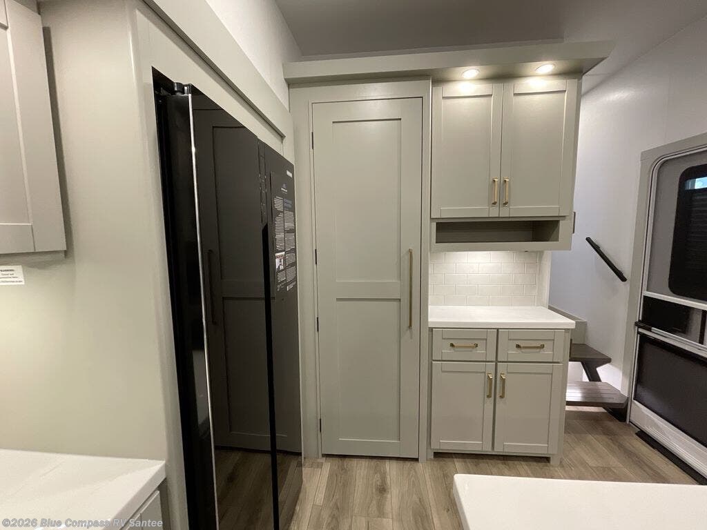 This Model Z luxury fifth wheel is bright and modern on the inside, with loads of amenities that will have you dreaming of your next trip! Enter and find a spacious combined living/kitchen space thanks to dual opposing slides. There is ample seating with a sliding desk/dining table, 62" theater seating, and a 72" tri-fold sofa along the rear wall. You can easily relax and enjoy the 50" Smart telescoping TV with a cozy fireplace below. The kitchen offers all that you need to prepare and cook meals just like home with a 16 cu. ft. refrigerator for your perishables, a 30" microwave oven, and three burner range top and oven. You will love the integrated spice rack, and the kitchen island all outfitted with dog bowls and double pull out trash bins with an integrated Stow 'N Go paper towel holder. There is also an 84" pantry with adjustable shelves for all of your canned and dry goods. Head up the steps to a private master suite with king bed slide. You can opt for the queen bed if you like. A sliding dresser top features hidden storage which is perfect for jewelry and other personal belongings. The front wardrobe features mirrored doors and the corner closet has been prepped for a stackable washer and dryer if you choose to add that option. Relax and enjoy a large bath featuring a linen cabinet, a 30" x 42" shower, and vanity with sink, plus medicine cabinet.
