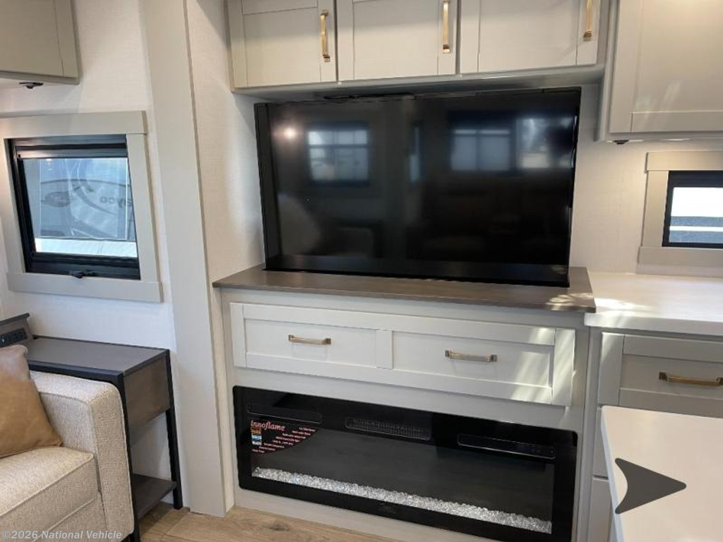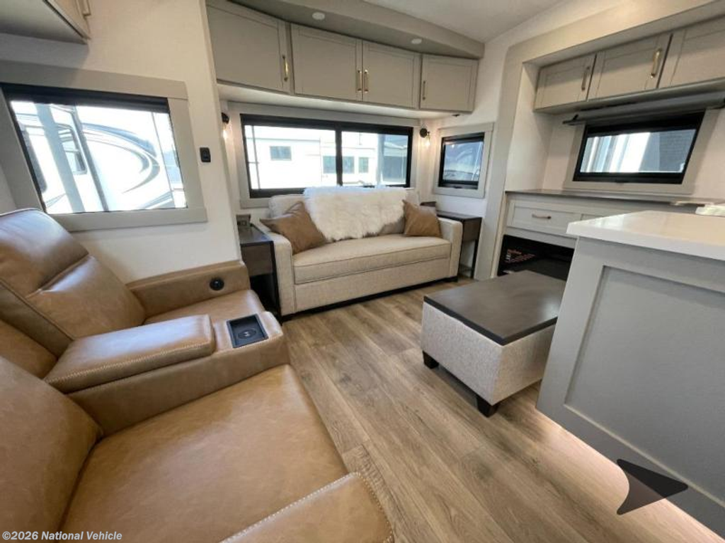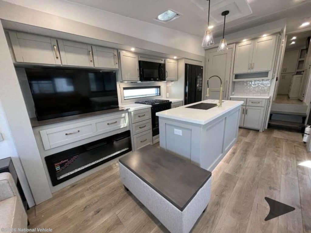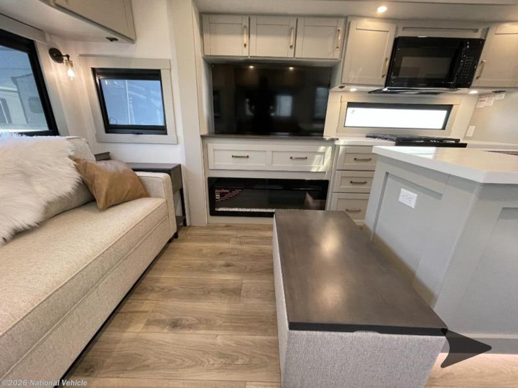Step inside to a spacious living and kitchen area enhanced by dual opposing slides, creating a wide, open-concept layout. Relax in comfort with 62? theater seating, a 72? tri-fold sofa, and a free-standing dinette with a built-in utensil drawer. The entertainment center features a 50? Smart telescoping TV paired with a sleek fireplace, perfect for cozy evenings.