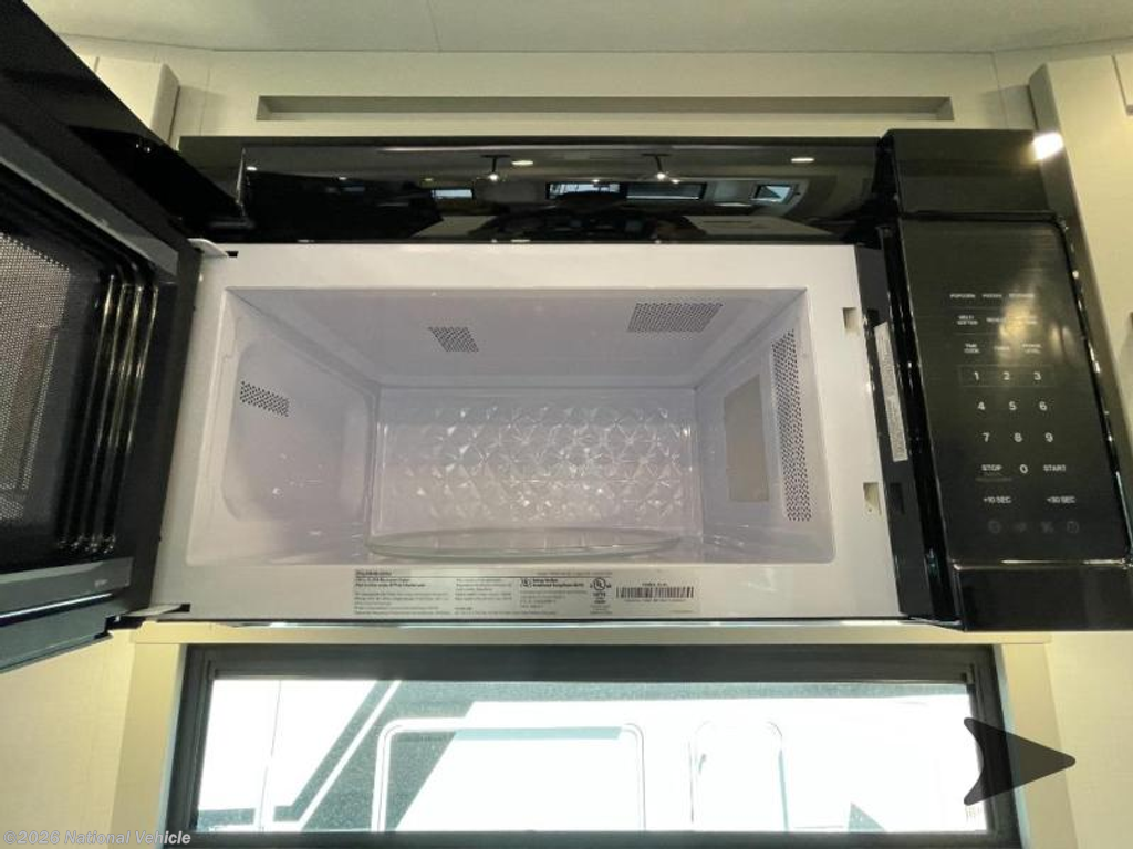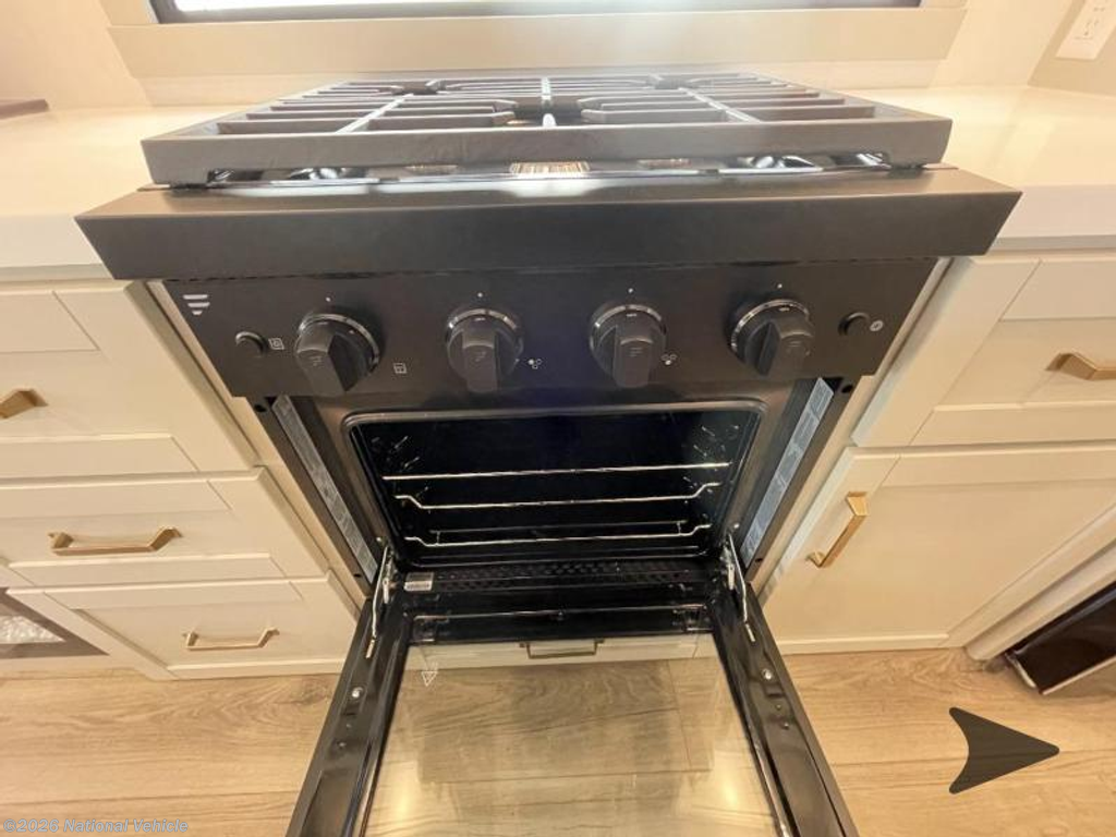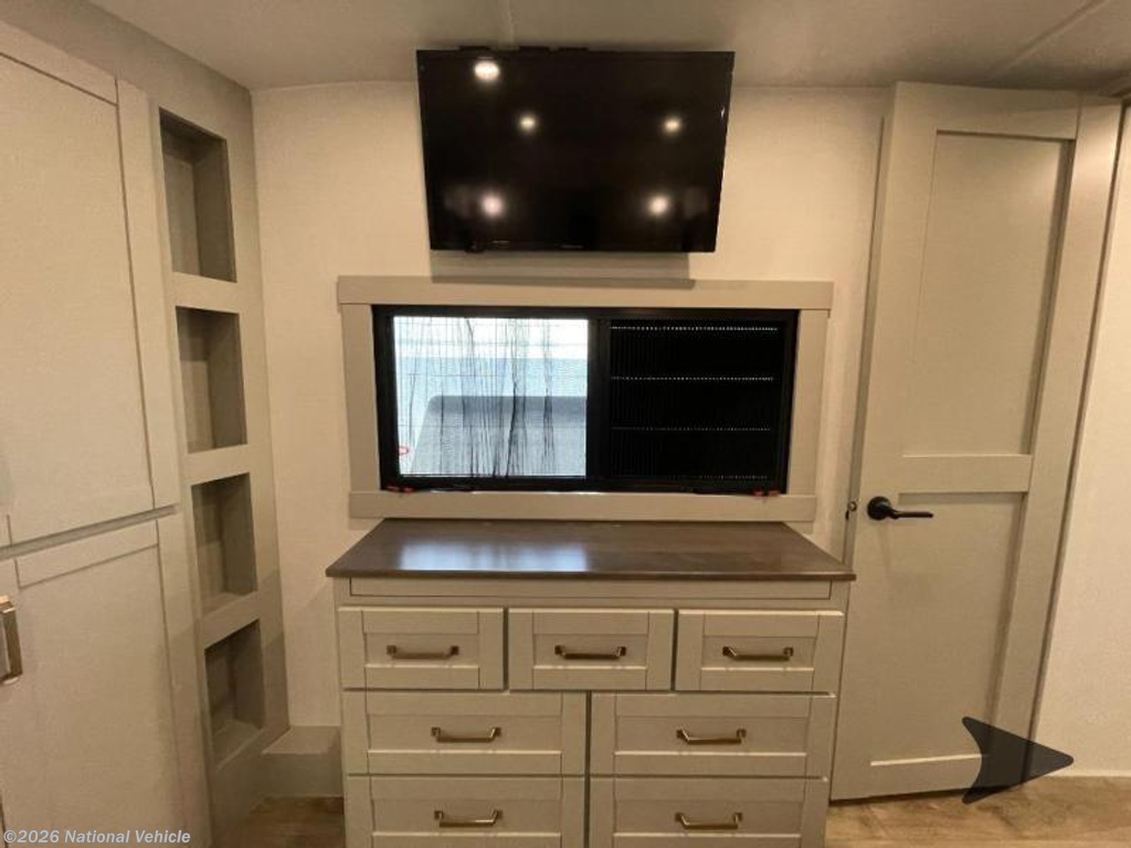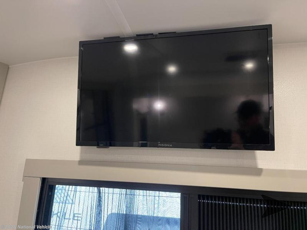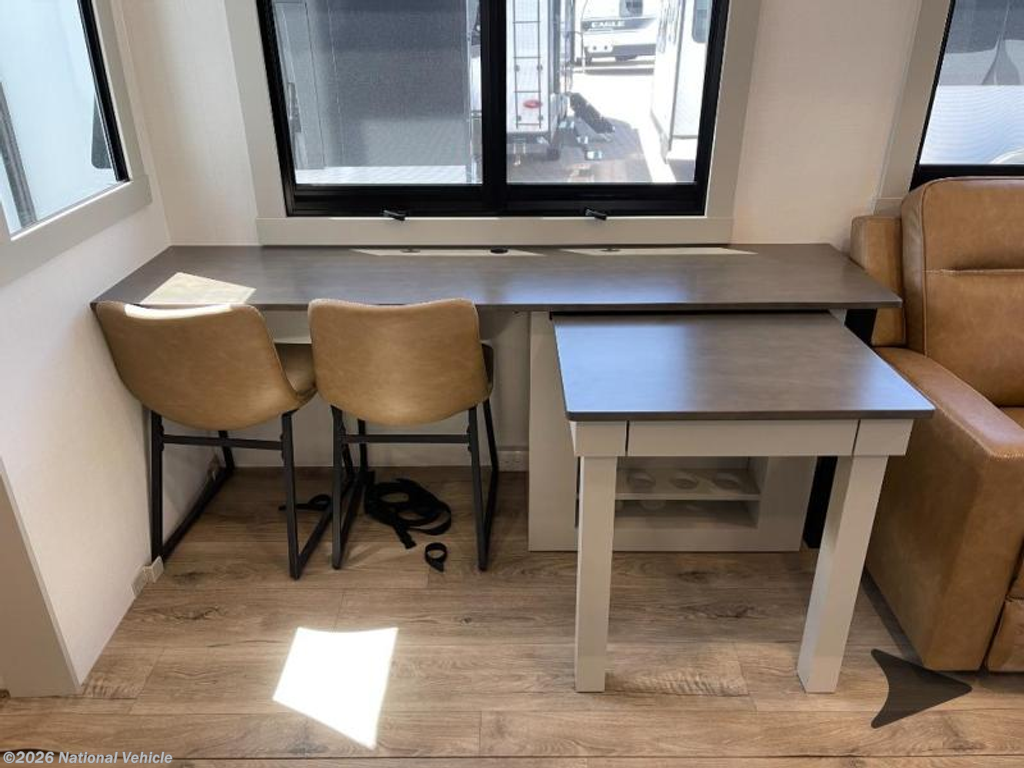 Step inside to a spacious living and kitchen area enhanced by dual opposing slides, creating a wide, open-concept layout. Relax in comfort with 62? theater seating, a 72? tri-fold sofa, and a free-standing dinette with a built-in utensil drawer. The entertainment center features a 50? Smart telescoping TV paired with a sleek fireplace, perfect for cozy evenings.