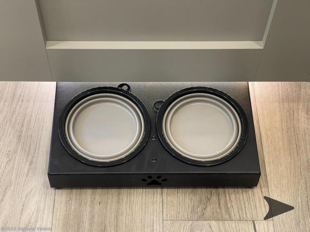The kitchen is thoughtfully designed for both style and function, featuring a 16 cu. ft. refrigerator, 30? microwave, and three-burner cooktop with oven. A large island adds workspace and includes integrated dog bowls, double pull-out trash bins, and a Stow & Go paper towel holder. An 84? pantry with adjustable shelving and a built-in spice rack provide excellent storage for extended trips.