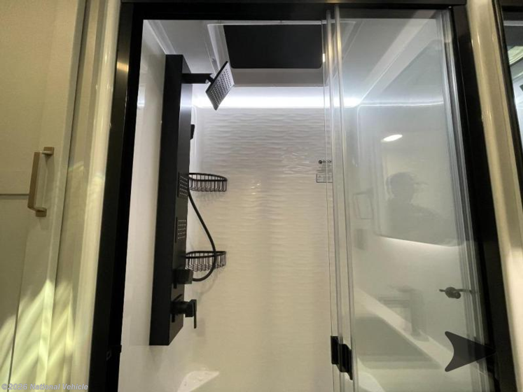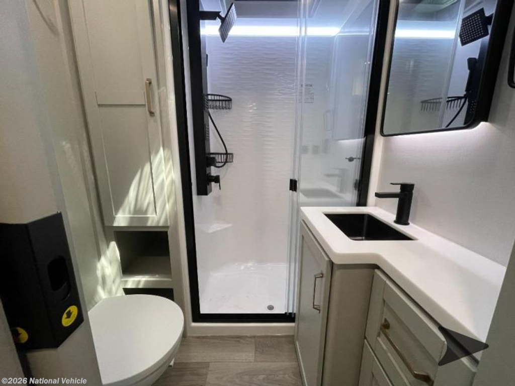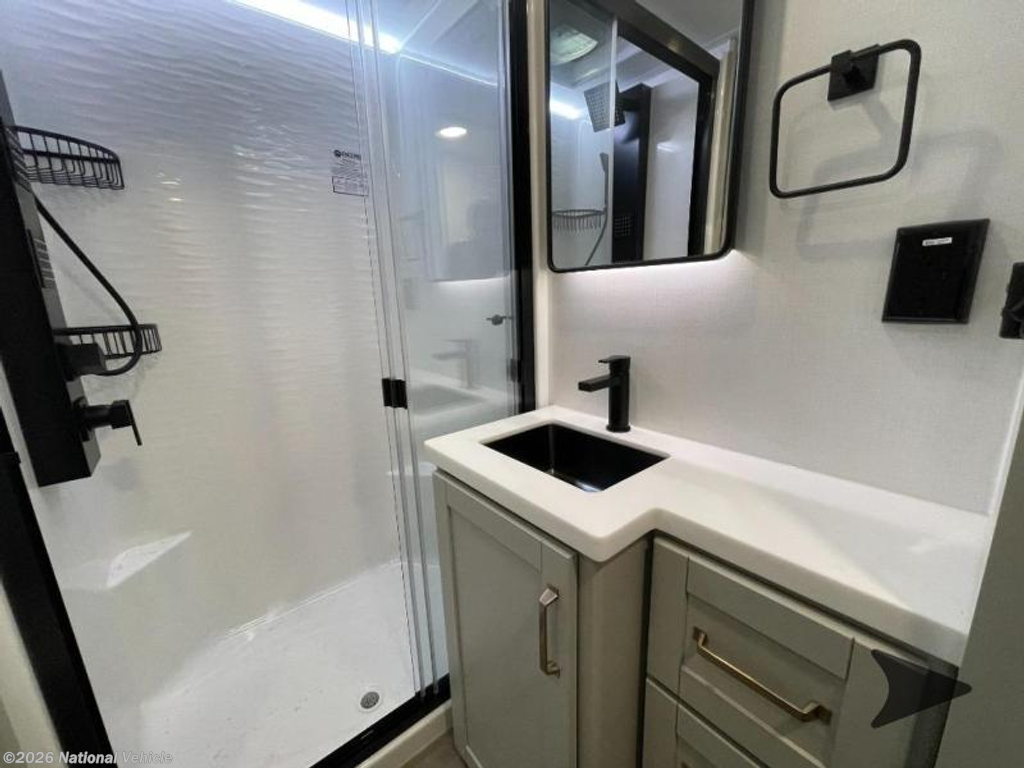 The bathroom features a 30? x 42? shower, vanity with sink, medicine cabinet, and linen storage, delivering residential comfort. Outside, enjoy dual exterior hot and cold showers, a rear baggage door, and mid-coach pass-through storage for all your gear.