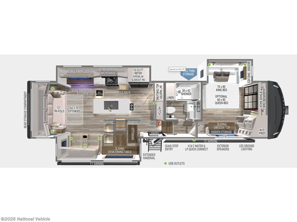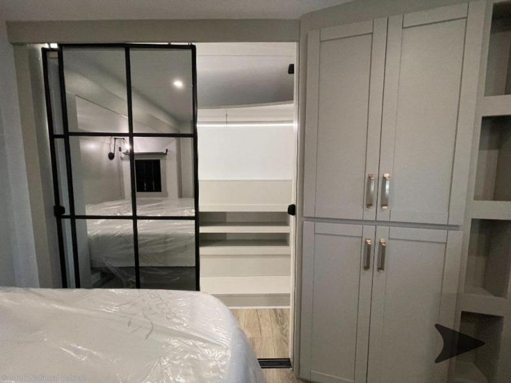 Upstairs, the private master suite offers a king bed slide and a sliding dresser top with hidden storage?ideal for valuables. A spacious front wardrobe with mirrored doors and a corner closet prepped for a stackable washer and dryer add convenience and flexibility for long-term travel.
