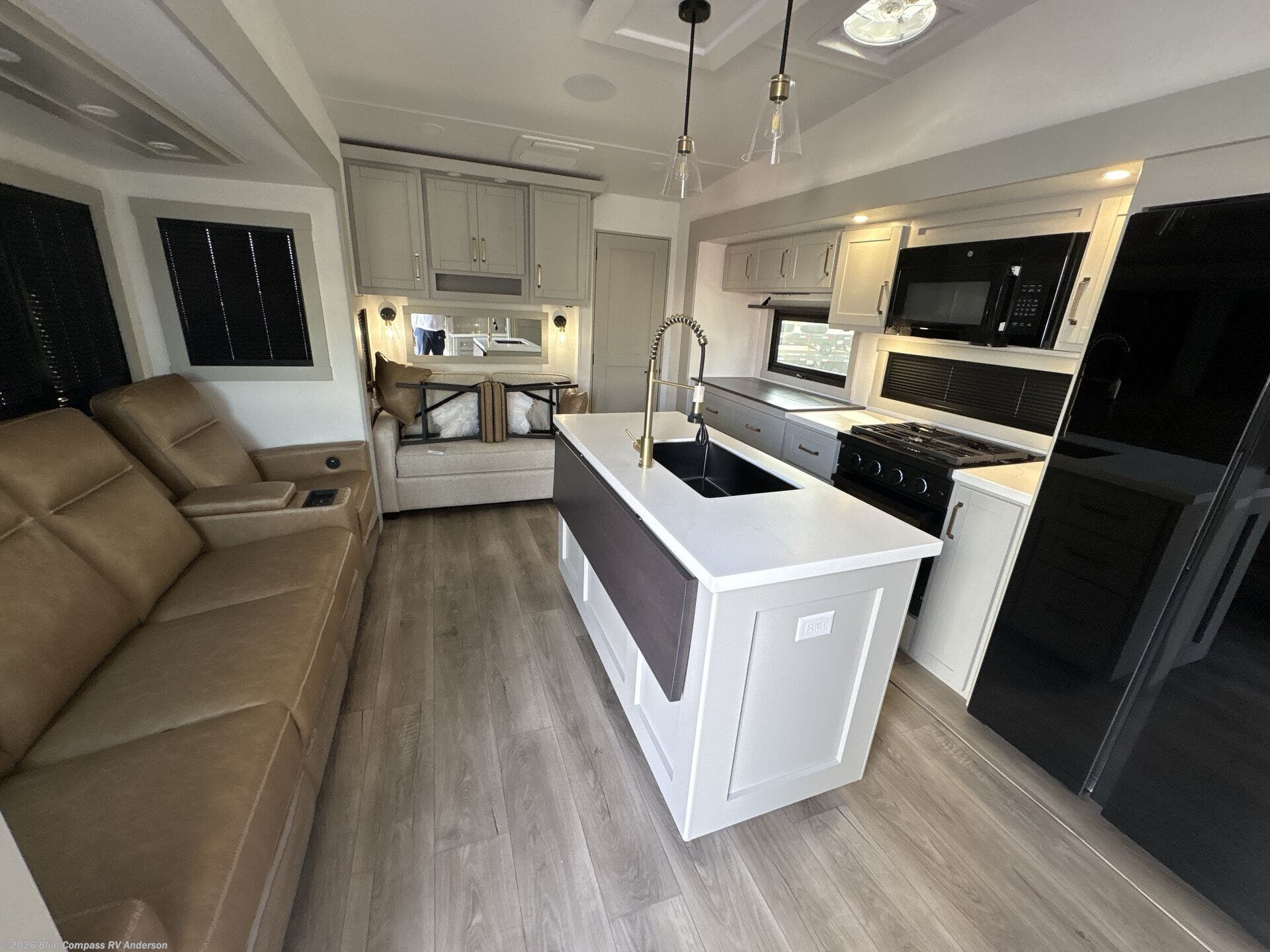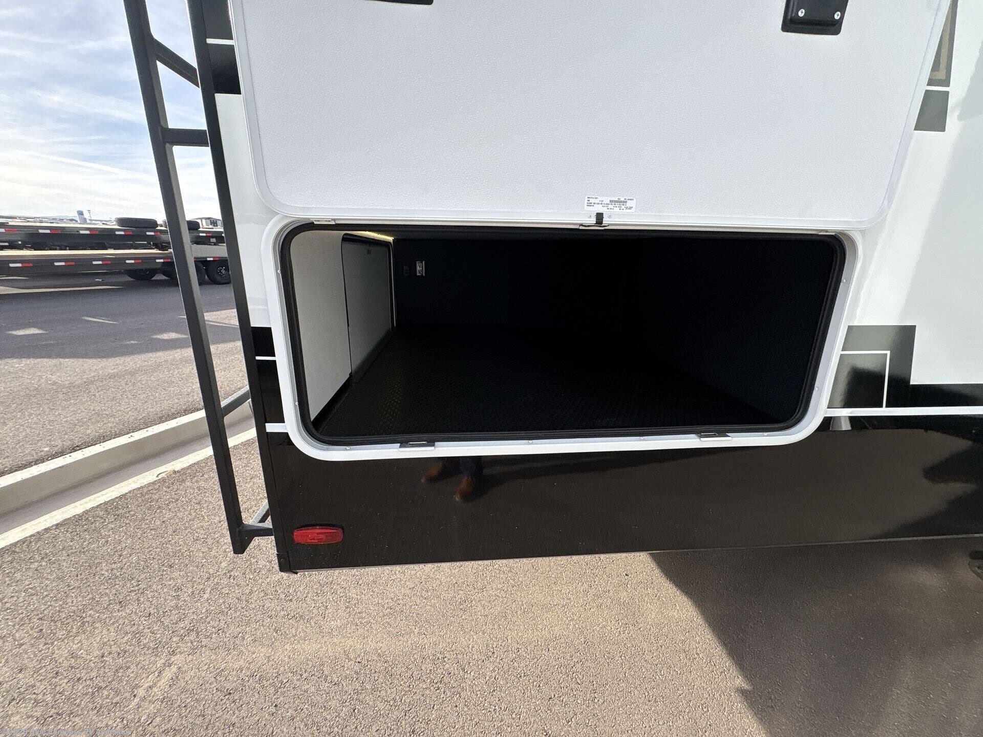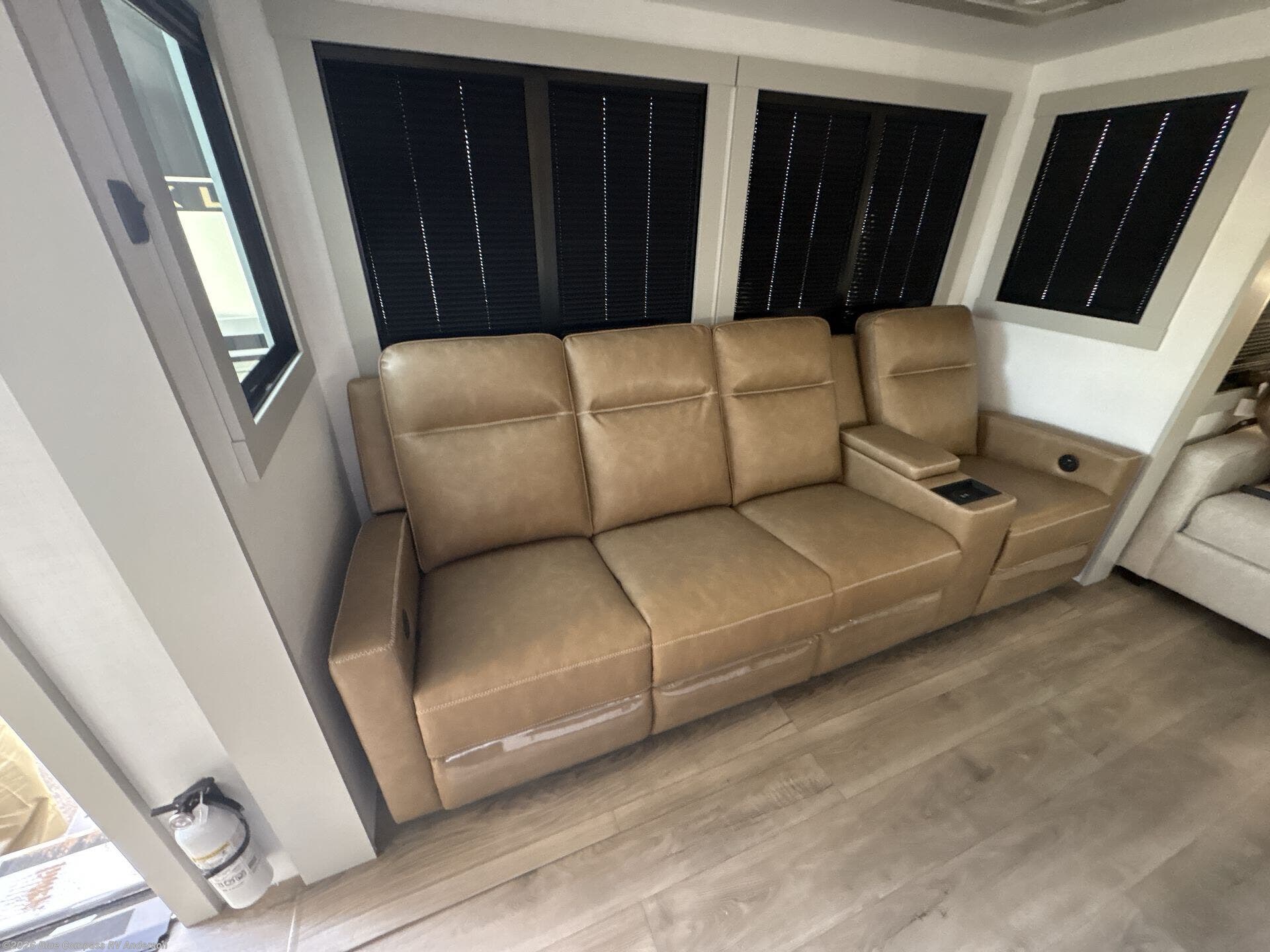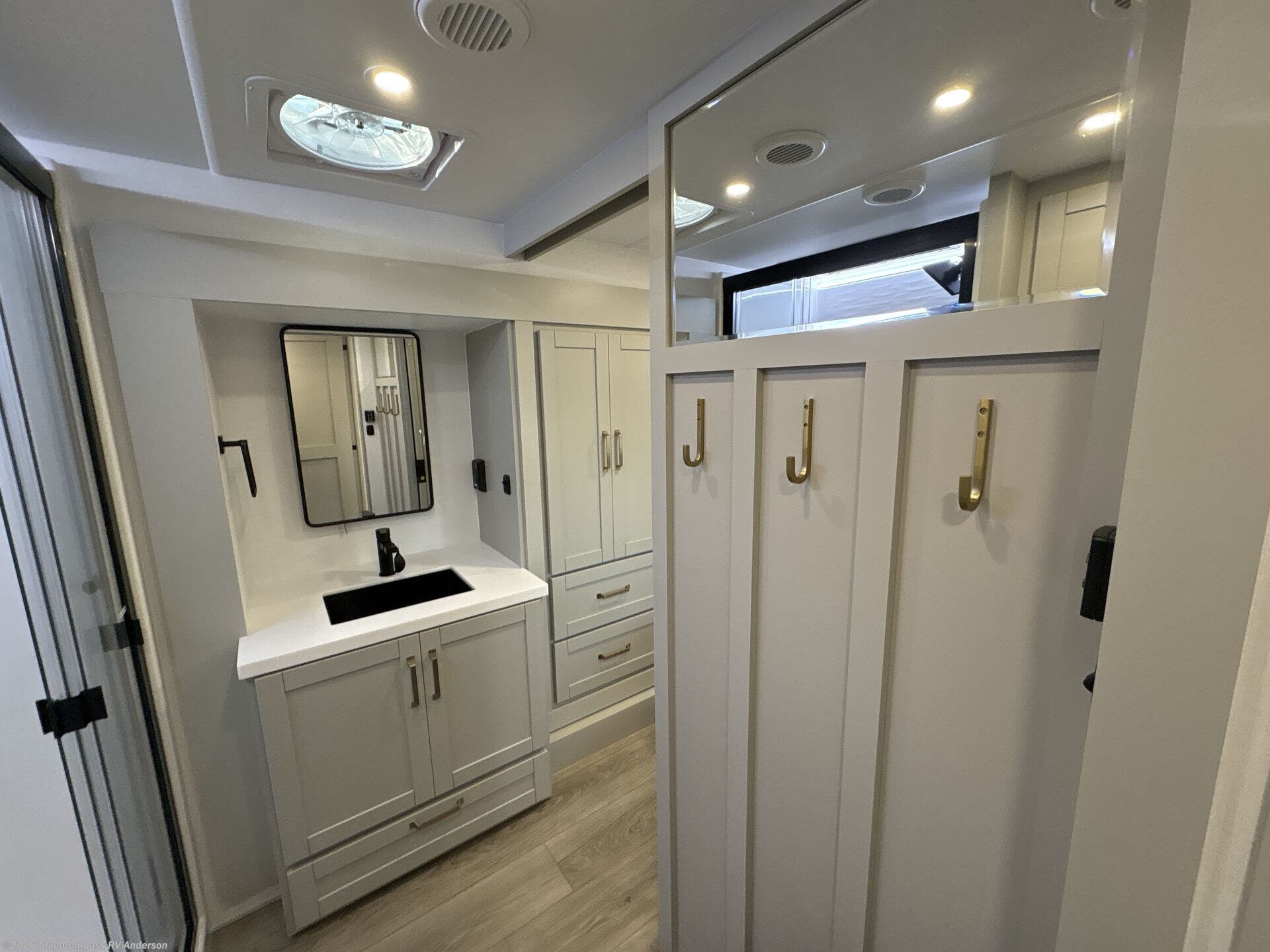 The perfect unit for your larger family, this Model Z can sleep eight! Step inside and find a wide open combined kitchen and living room. There is a large slide out theater seat with two recliners and seating for four, plus a 60" tri-fold sofa, and a televator and fireplace in the appliance slide along the roadside. The center island features dual trash bins and stow & go paper towel holder, a large sink, and even dog bowls for your favorite furry friend. A 16 cu. ft. refrigerator will house all of your perishables, and you will also have an 84" pantry with adjustable shelves for all of your dry goods and snacks. Head up the steps to your right, just inside the entry, to find a private master bedroom and bath at the end of the hall. Here you will find a queen bed, slide out wardrobe with a dresser, and the bathroom vanity. A large 30" x 42" shower will welcome you each morning or night to keep clean and refreshed. At the very back of the unit, guests will enjoy a private bunkhouse with 54" x 74" bunk beds, a TV, and wardrobe with drawers beneath. The outside features over 160 cu. ft. of exterior storage with mid-coach pass-through and exterior storage access, plus two awnings for added outdoor living.