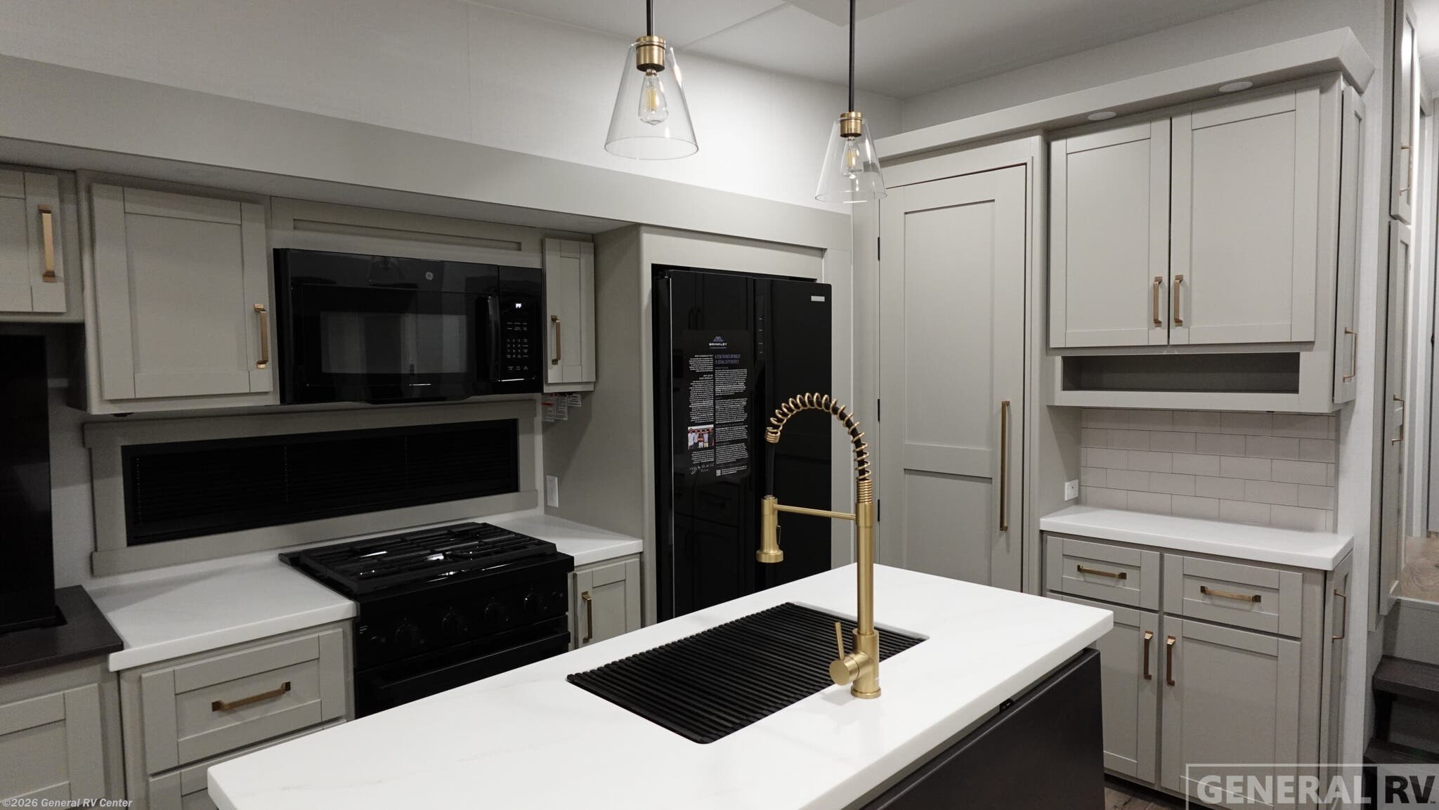 The perfect unit for your larger family, this Model Z can sleep eight! Step inside and find a wide open combined kitchen and living room. There is a large slide out theater seat with two recliners and seating for four, plus a 60" tri-fold sofa, and a televator and fireplace in the appliance slide along the roadside. The center island features dual trash bins and stow go paper towel holder, a large sink, and even dog bowls for your favorite furry friend. A 16 cu. ft. refrigerator will house all of your perishables, and you will also have an 84" pantry with adjustable shelves for all of your dry goods and snacks. Head up the steps to your right, just inside the entry, to find a private master bedroom and bath at the end of the hall. Here you will find a queen bed, slide out wardrobe with a dresser, and the bathroom vanity. A large 30" x 42" shower will welcome you each morning or night to keep clean and refreshed. At the very back of the unit, guests will enjoy a private bunkhouse with 54" x 74" bunk beds, a TV, and wardrobe with drawers beneath. The outside features over 160 cu. ft. of exterior storage with mid-coach pass-through and exterior storage access, plus two awnings for added outdoor living. The Brinkley mid-profile Model Z fifth wheels bring you clean lines and an upscale look with plenty of style and exciting new features like the industry first brass plumbing connections. These units also feature an automotive grade front cap, plenty of exterior storage, exterior hot and cold showers, and wide stance leveling jacks for easy set up. Residential frameless windows provide a clean look and beautiful views, and ample electrical outlets and 6 USB/USB-C outlets allow all of your electronics and appliances to easily be used and charged.