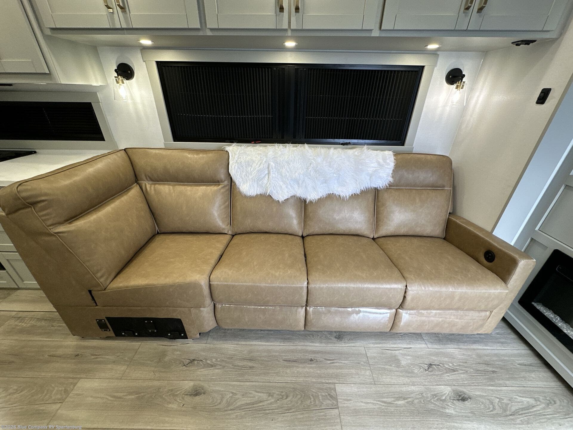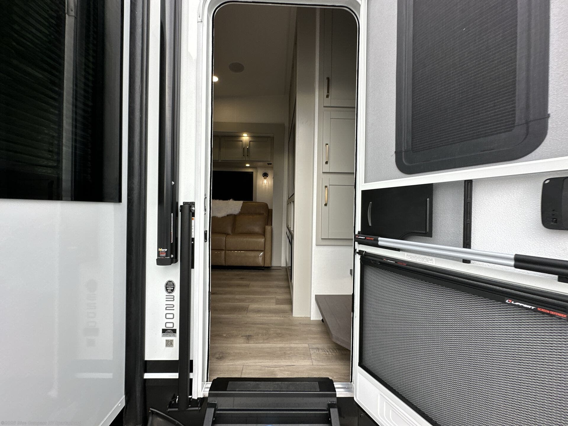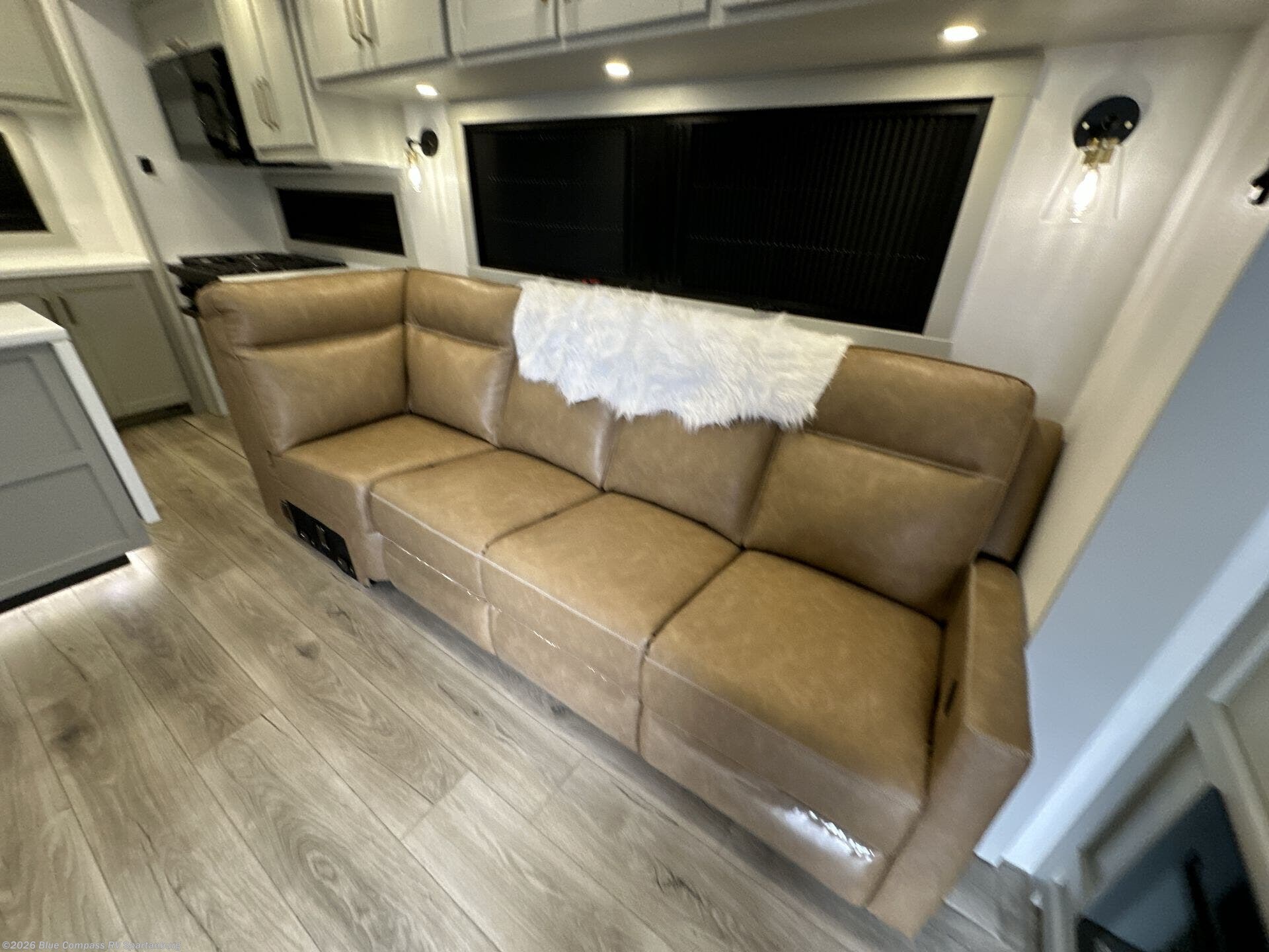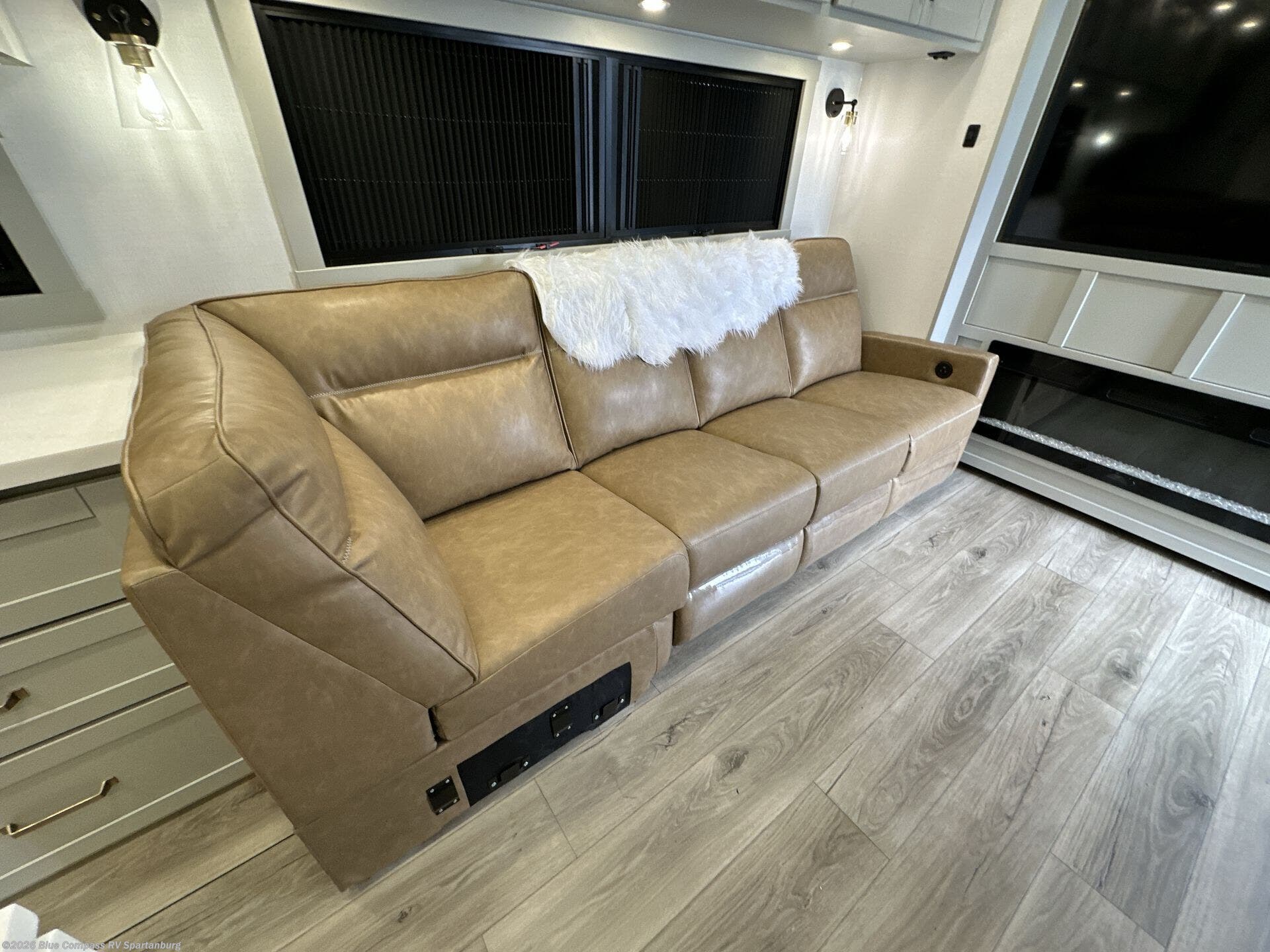 Escape to a world of comfort and luxury with this incredible fifth wheel! The living area features a plush L-sofa, five recliners, and a warm fireplace. The versatile dining table/L desk seats up to four people, making it perfect for meals, work, or play. Ample shoe storage and a convenient spot for pet bowls enhance comfort and practicality. The kitchen offers stunning solid surface countertops, dishwasher prep, a residential microwave, and a three-burner cooktop. The expansive pantry with pull-out drawers provides ample storage for your favorite ingredients and cooking essentials. The full bathroom is a serene oasis, featuring a linen closet for added storage and convenience. The front bedroom is a peaceful sanctuary, featuring a spacious king bed, shelves, and a sliding dresser top with hidden storage. The generous wardrobe and shoe rack provide ample storage for your clothes and shoes.
