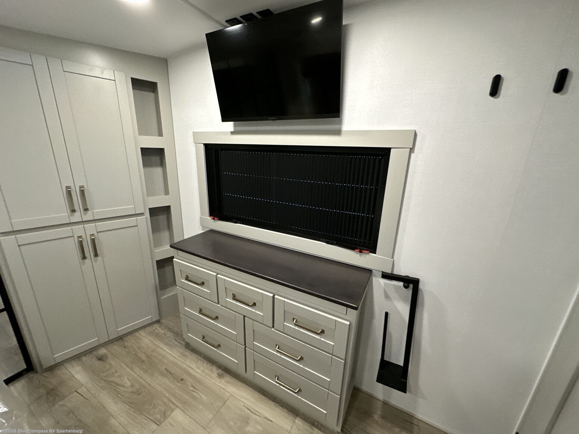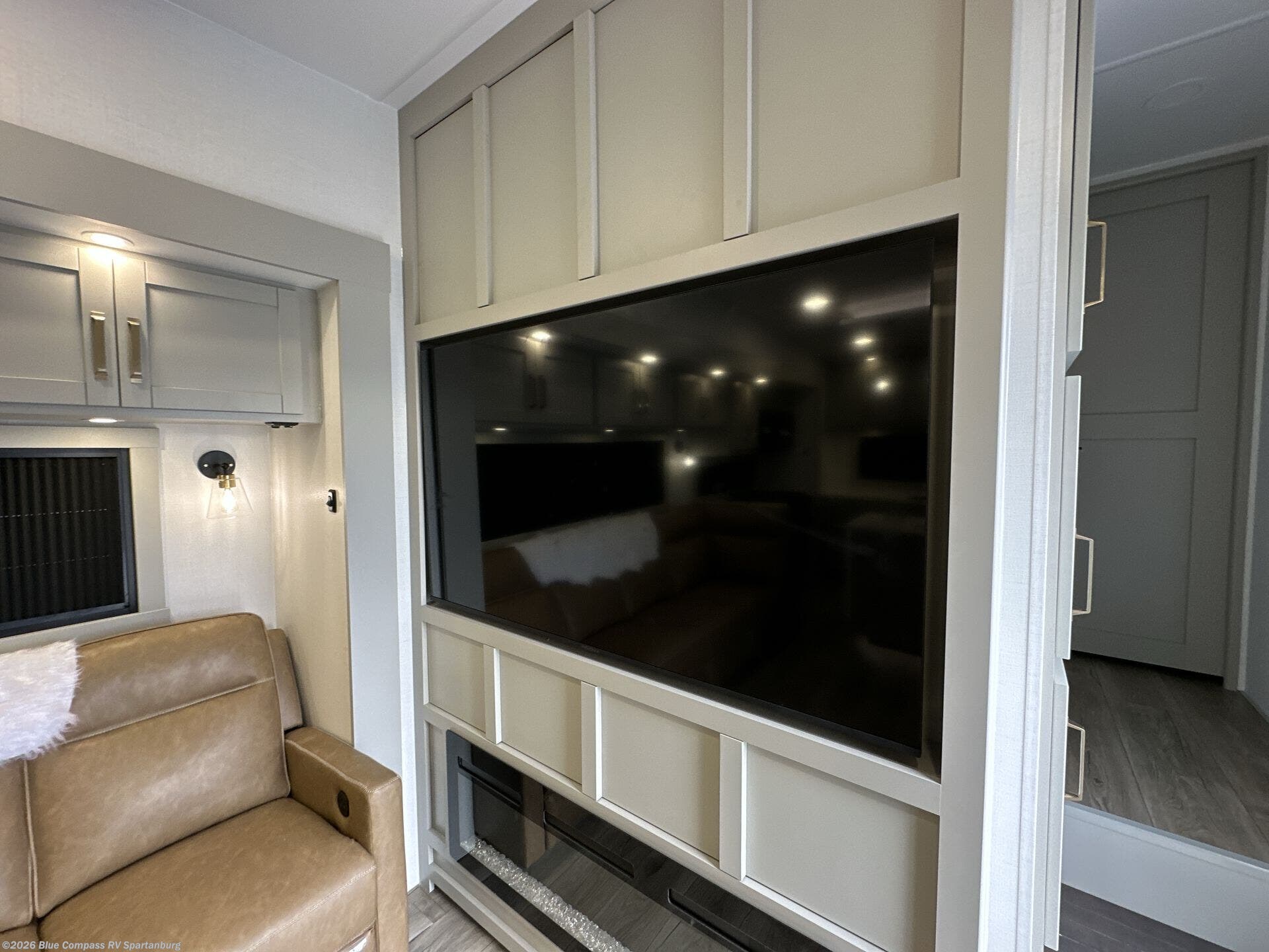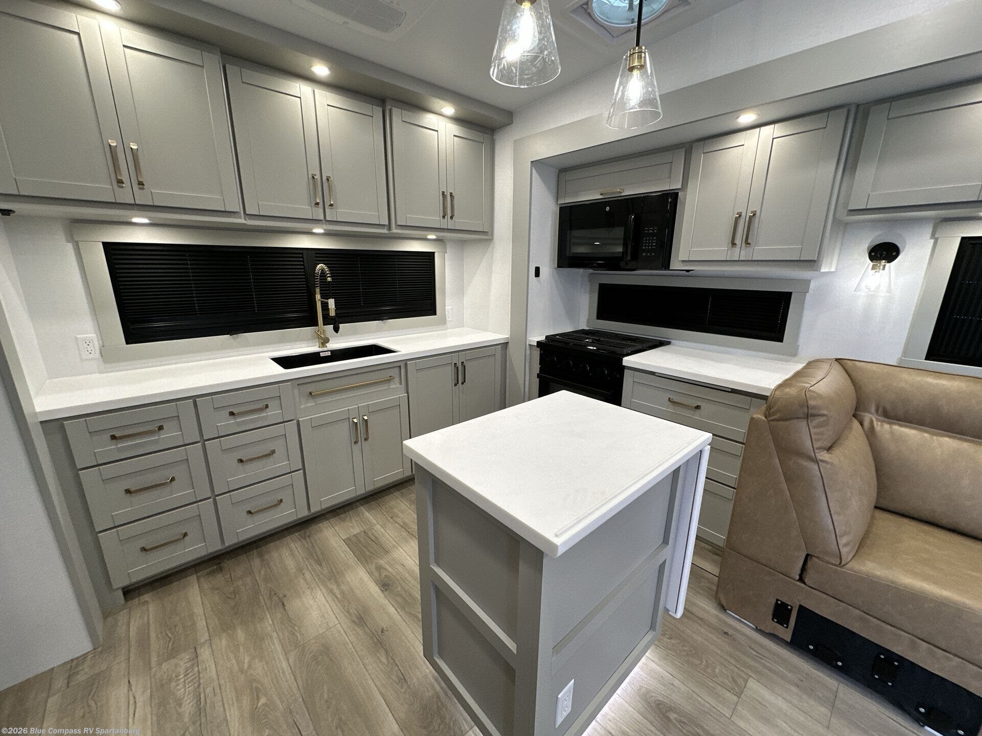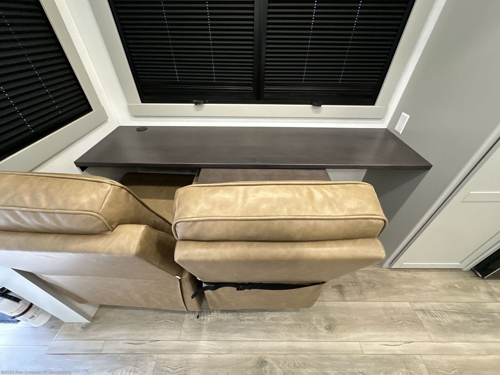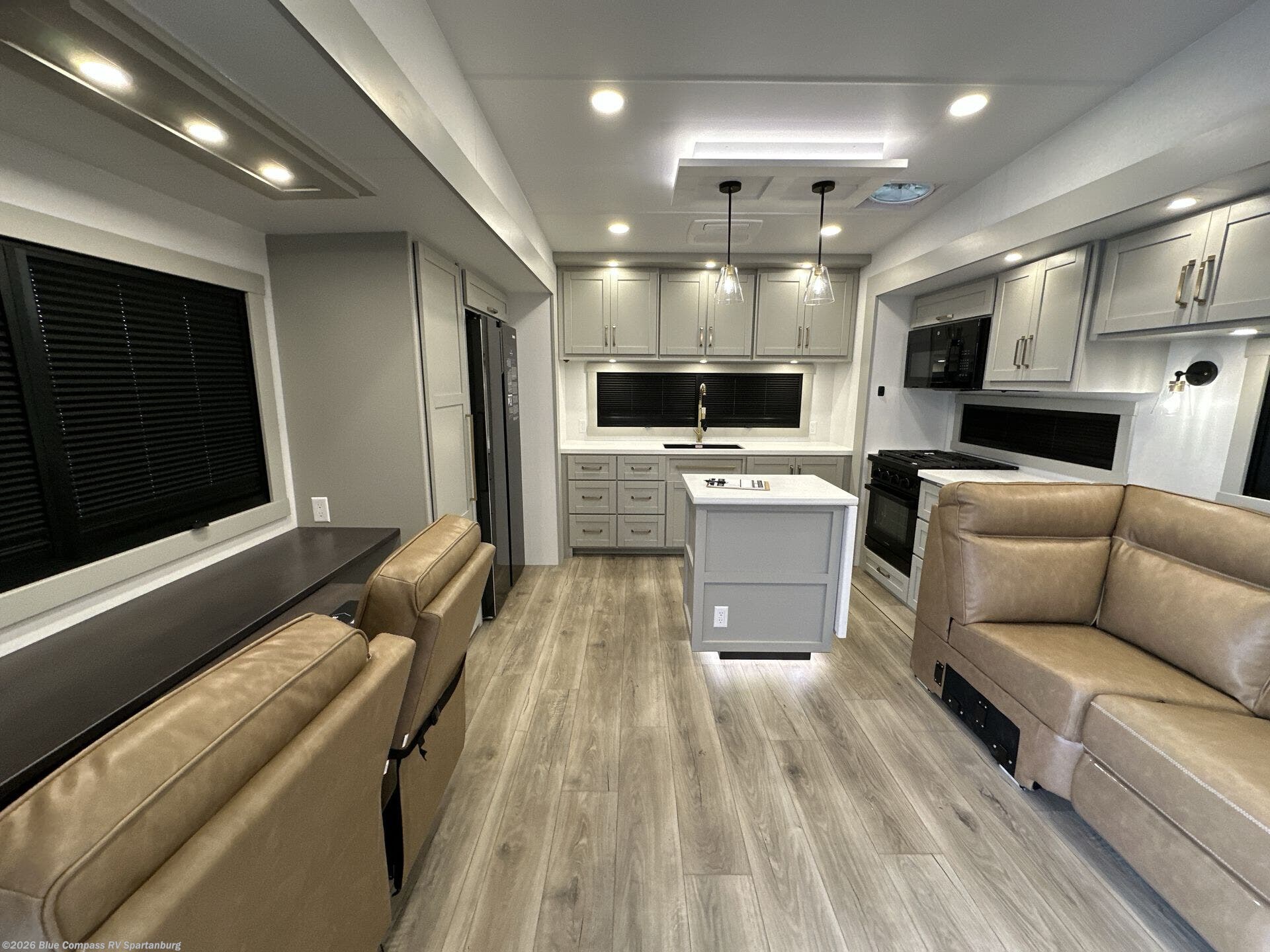 Escape to a world of comfort and luxury with this incredible fifth wheel! The living area features a plush L-sofa, five recliners, and a warm fireplace. The versatile dining table/L desk seats up to four people, making it perfect for meals, work, or play. Ample shoe storage and a convenient spot for pet bowls enhance comfort and practicality. The kitchen offers stunning solid surface countertops, dishwasher prep, a residential microwave, and a three-burner cooktop. The expansive pantry with pull-out drawers provides ample storage for your favorite ingredients and cooking essentials. The full bathroom is a serene oasis, featuring a linen closet for added storage and convenience. The front bedroom is a peaceful sanctuary, featuring a spacious king bed, shelves, and a sliding dresser top with hidden storage. The generous wardrobe and shoe rack provide ample storage for your clothes and shoes.