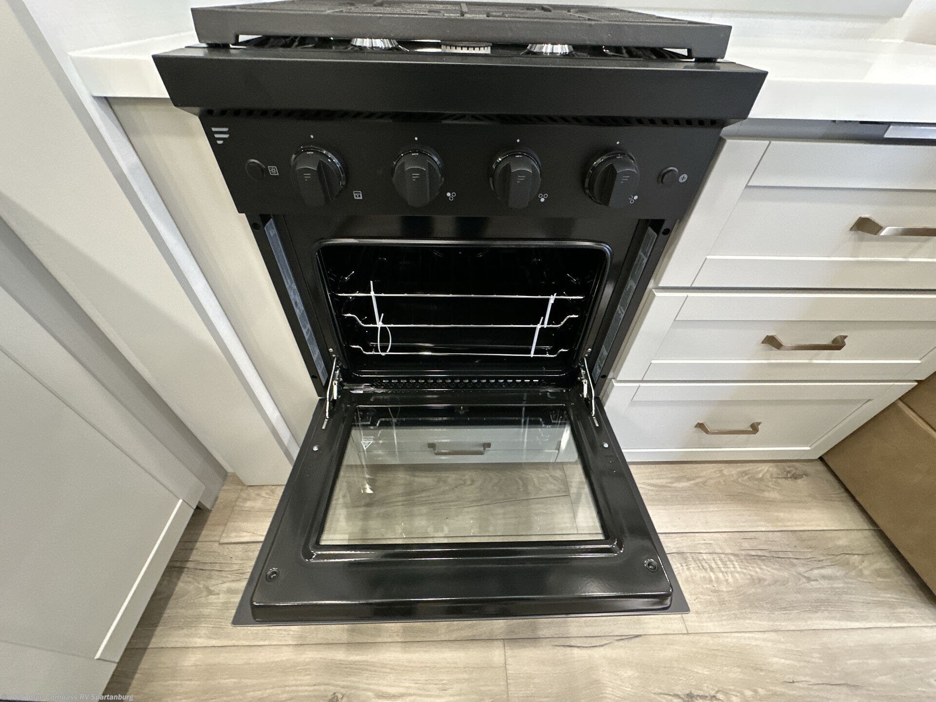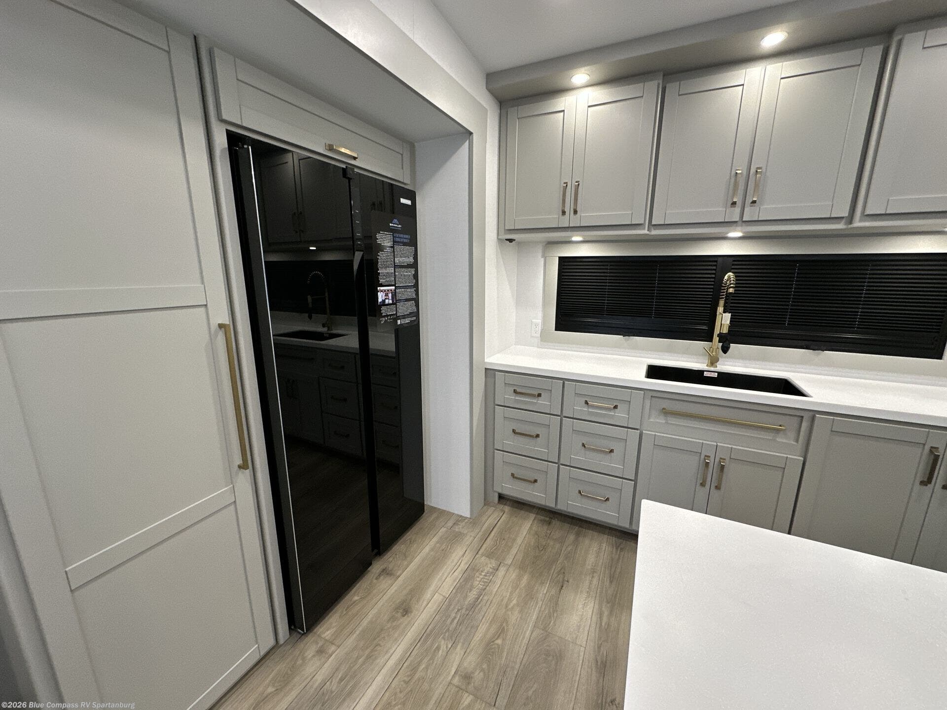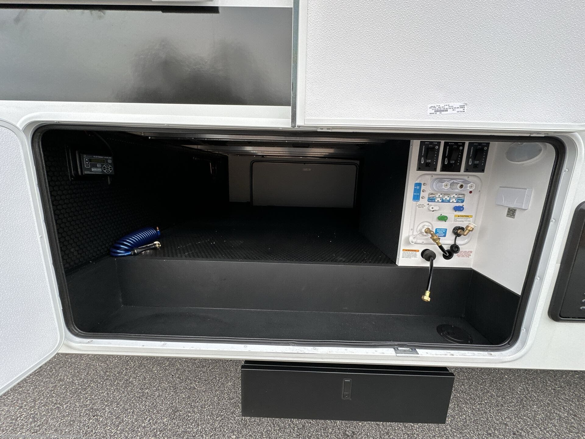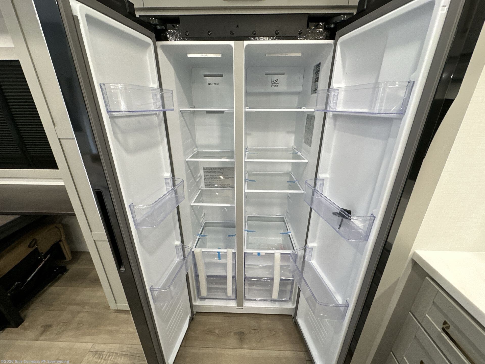 Escape to a world of comfort and luxury with this incredible fifth wheel! The living area features a plush L-sofa, five recliners, and a warm fireplace. The versatile dining table/L desk seats up to four people, making it perfect for meals, work, or play. Ample shoe storage and a convenient spot for pet bowls enhance comfort and practicality. The kitchen offers stunning solid surface countertops, dishwasher prep, a residential microwave, and a three-burner cooktop. The expansive pantry with pull-out drawers provides ample storage for your favorite ingredients and cooking essentials. The full bathroom is a serene oasis, featuring a linen closet for added storage and convenience. The front bedroom is a peaceful sanctuary, featuring a spacious king bed, shelves, and a sliding dresser top with hidden storage. The generous wardrobe and shoe rack provide ample storage for your clothes and shoes.