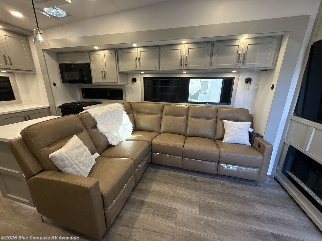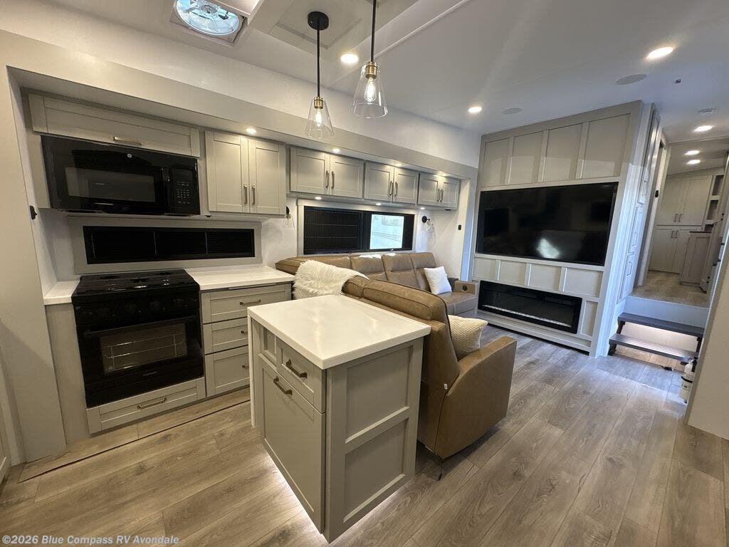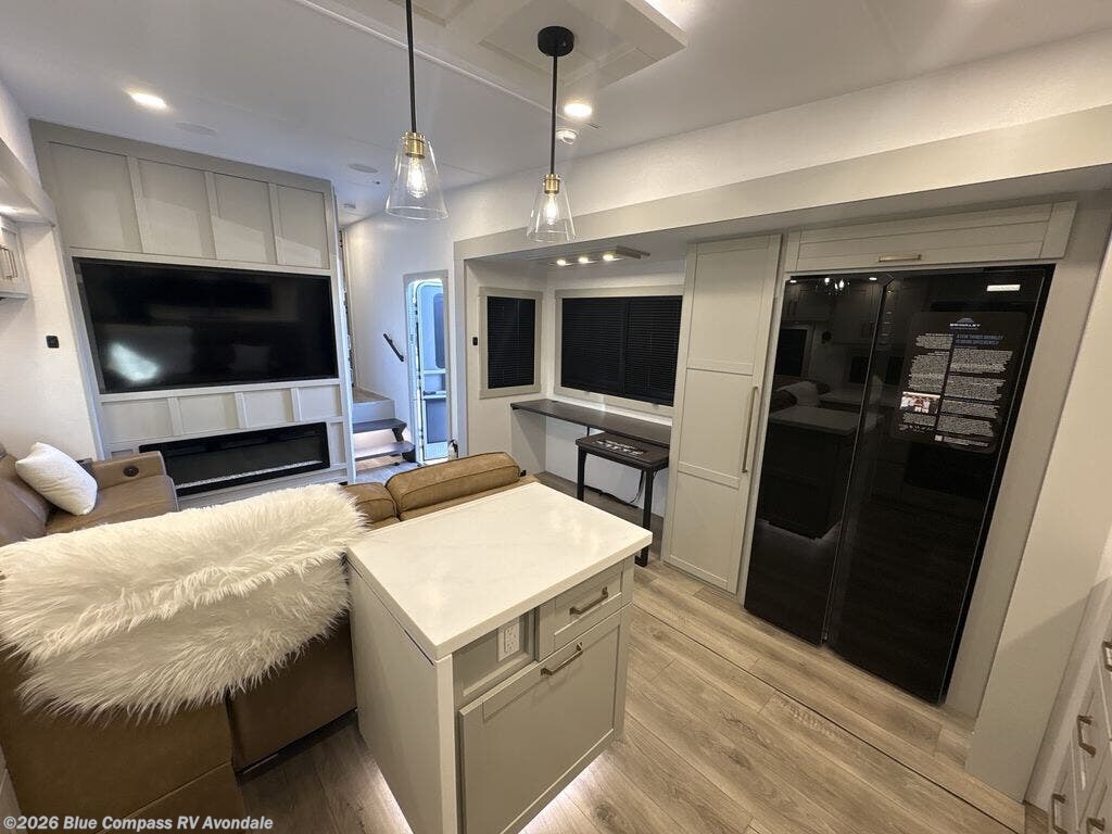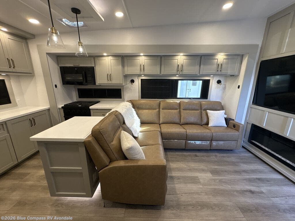 Escape to a world of comfort and luxury with this incredible fifth wheel! The living area features a plush L-sofa, five recliners, and a warm fireplace. The versatile dining table/L desk seats up to four people, making it perfect for meals, work, or play. Ample shoe storage and a convenient spot for pet bowls enhance comfort and practicality. The kitchen offers stunning solid surface countertops, dishwasher prep, a residential microwave, and a three-burner cooktop. The expansive pantry with pull-out drawers provides ample storage for your favorite ingredients and cooking essentials. The full bathroom is a serene oasis, featuring a linen closet for added storage and convenience. The front bedroom is a peaceful sanctuary, featuring a spacious king bed, shelves, and a sliding dresser top with hidden storage. The generous wardrobe and shoe rack provide ample storage for your clothes and shoes.