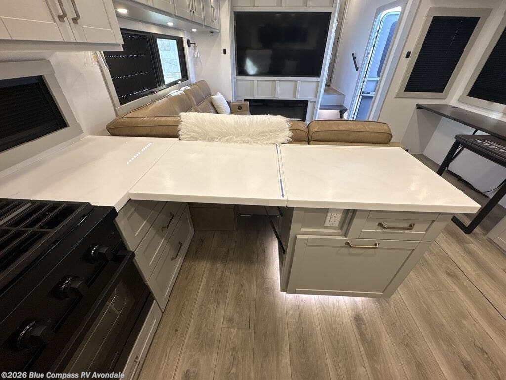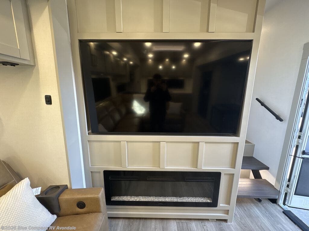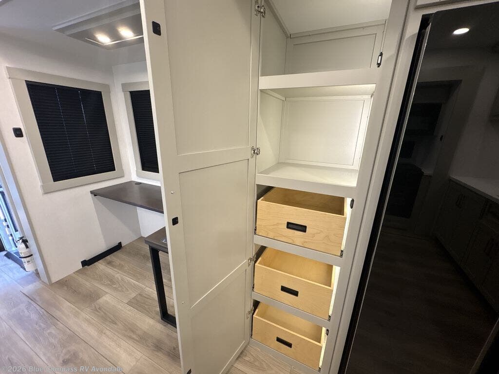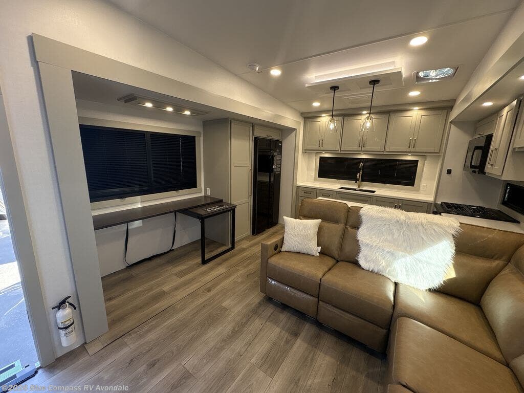 Escape to a world of comfort and luxury with this incredible fifth wheel! The living area features a plush L-sofa, five recliners, and a warm fireplace. The versatile dining table/L desk seats up to four people, making it perfect for meals, work, or play. Ample shoe storage and a convenient spot for pet bowls enhance comfort and practicality. The kitchen offers stunning solid surface countertops, dishwasher prep, a residential microwave, and a three-burner cooktop. The expansive pantry with pull-out drawers provides ample storage for your favorite ingredients and cooking essentials. The full bathroom is a serene oasis, featuring a linen closet for added storage and convenience. The front bedroom is a peaceful sanctuary, featuring a spacious king bed, shelves, and a sliding dresser top with hidden storage. The generous wardrobe and shoe rack provide ample storage for your clothes and shoes.