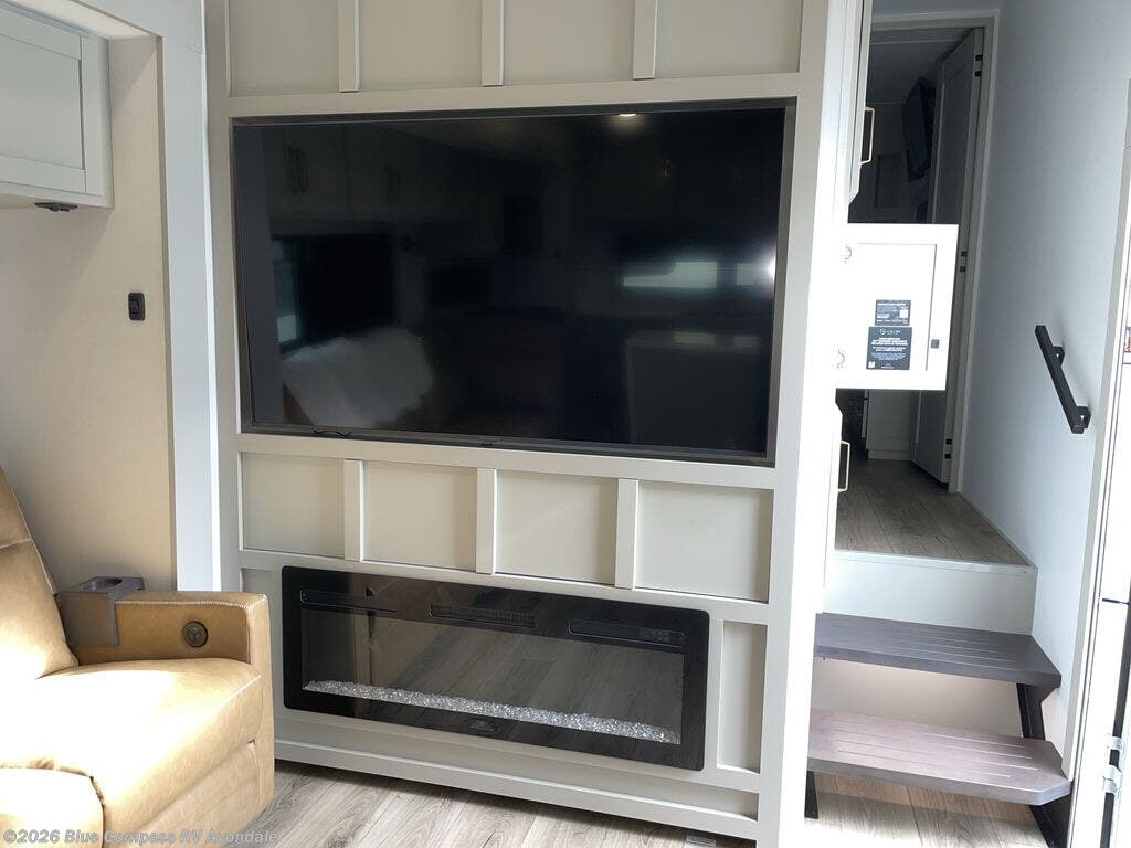 Escape to a world of comfort and luxury with this incredible fifth wheel! The living area features a plush L-sofa, five recliners, and a warm fireplace. The versatile dining table/L desk seats up to four people, making it perfect for meals, work, or play. Ample shoe storage and a convenient spot for pet bowls enhance comfort and practicality. The kitchen offers stunning solid surface countertops, dishwasher prep, a residential microwave, and a three-burner cooktop. The expansive pantry with pull-out drawers provides ample storage for your favorite ingredients and cooking essentials. The full bathroom is a serene oasis, featuring a linen closet for added storage and convenience. The front bedroom is a peaceful sanctuary, featuring a spacious king bed, shelves, and a sliding dresser top with hidden storage. The generous wardrobe and shoe rack provide ample storage for your clothes and shoes.