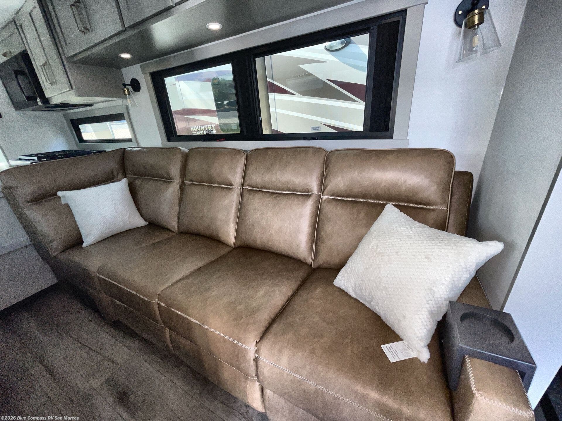 Escape to a world of comfort and luxury with this incredible fifth wheel! The living area features a plush L-sofa, five recliners, and a warm fireplace. The versatile dining table/L desk seats up to four people, making it perfect for meals, work, or play. Ample shoe storage and a convenient spot for pet bowls enhance comfort and practicality. The kitchen offers stunning solid surface countertops, dishwasher prep, a residential microwave, and a three-burner cooktop. The expansive pantry with pull-out drawers provides ample storage for your favorite ingredients and cooking essentials. The full bathroom is a serene oasis, featuring a linen closet for added storage and convenience. The front bedroom is a peaceful sanctuary, featuring a spacious king bed, shelves, and a sliding dresser top with hidden storage. The generous wardrobe and shoe rack provide ample storage for your clothes and shoes.