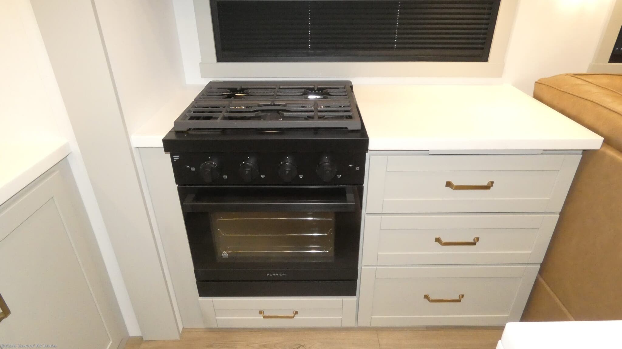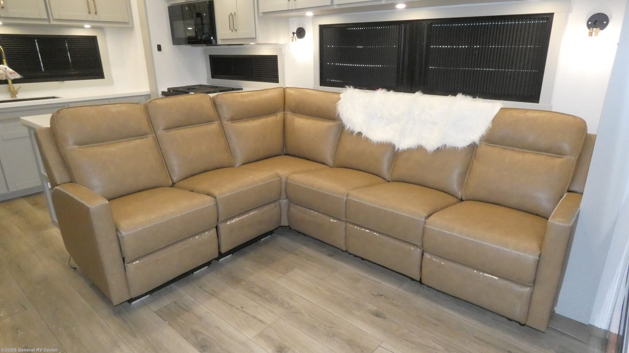 Brinkley Model Z 3200 fifth wheel highlights: L-Sofa with Five Recliners Flip-Up Countertop Fireplace Dual Awnings Shoe Storage Escape to a world of comfort and luxury with this incredible fifth wheel! The living area features a plush L-sofa, five recliners, and a warm fireplace. The versatile dining table/L desk seats up to four people, making it perfect for meals, work, or play. Ample shoe storage and a convenient spot for pet bowls enhance comfort and practicality. The kitchen offers stunning solid surface countertops, dishwasher prep, a residential microwave, and a three-burner cooktop. The expansive pantry with pull-out drawers provides ample storage for your favorite ingredients and cooking essentials. The full bathroom is a serene oasis, featuring a linen closet for added storage and convenience. The front bedroom is a peaceful sanctuary, featuring a spacious king bed, shelves, and a sliding dresser top with hidden storage. The generous wardrobe and shoe rack provide ample storage for your clothes and shoes. The Brinkley mid-profile Model Z fifth wheels bring you clean lines and an upscale look with plenty of style and exciting new features like the industry first brass plumbing connections. These units also feature an automotive grade front cap, plenty of exterior storage, exterior hot and cold showers, and wide stance leveling jacks for easy set up. Residential frameless windows provide a clean look and beautiful views, and ample electrical outlets and 6 USB/USB-C outlets allow all of your electronics and appliances to easily be used and charged.