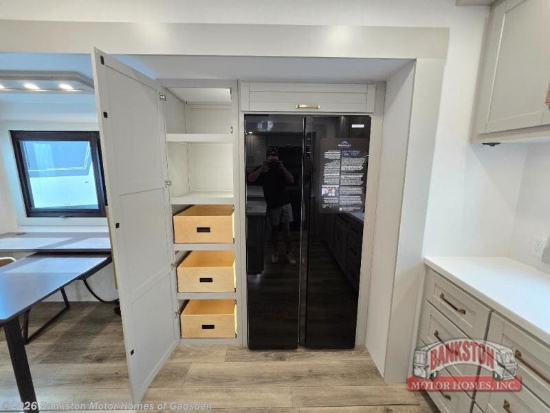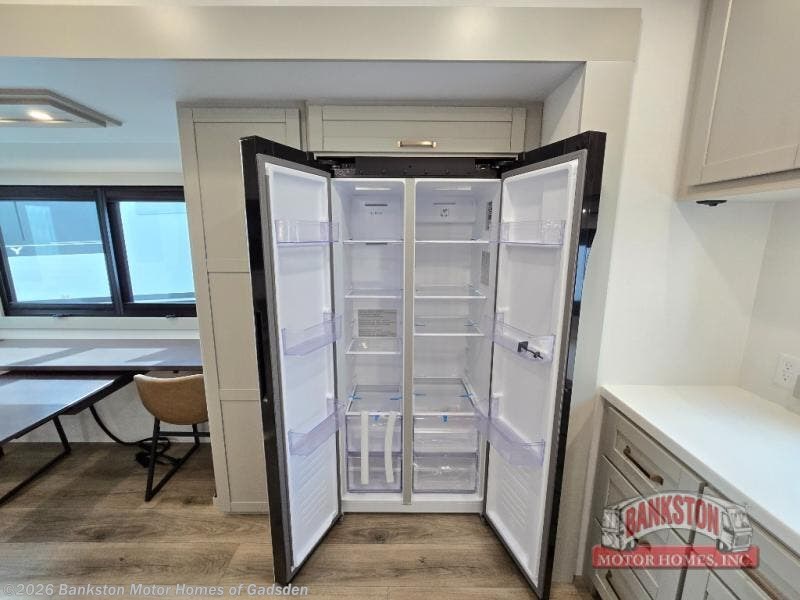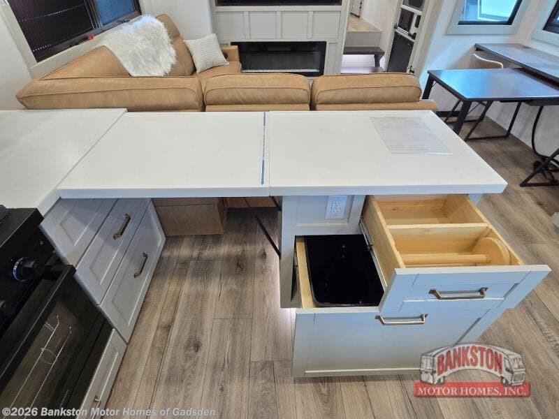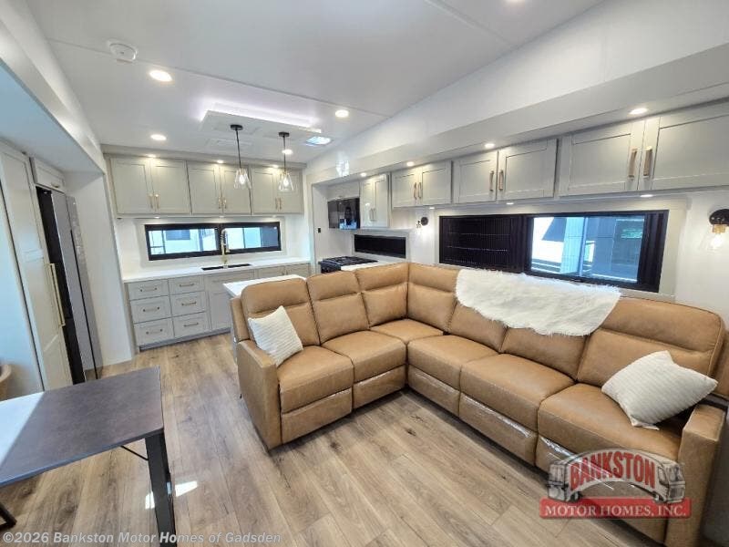 Escape to a world of comfort and luxury with this incredible fifth wheel! The living area features a plush L-sofa, five recliners, and a warm fireplace. The versatile dining table/L desk seats up to four people, making it perfect for meals, work, or play. Ample shoe storage and a convenient spot for pet bowls enhance comfort and practicality. The kitchen offers stunning solid surface countertops, dishwasher prep, a residential microwave, and a three-burner cooktop. The expansive pantry with pull-out drawers provides ample storage for your favorite ingredients and cooking essentials. The full bathroom is a serene oasis, featuring a linen closet for added storage and convenience. The front bedroom is a peaceful sanctuary, featuring a spacious king bed, shelves, and a sliding dresser top with hidden storage. The generous wardrobe and shoe rack provide ample storage for your clothes and shoes.
