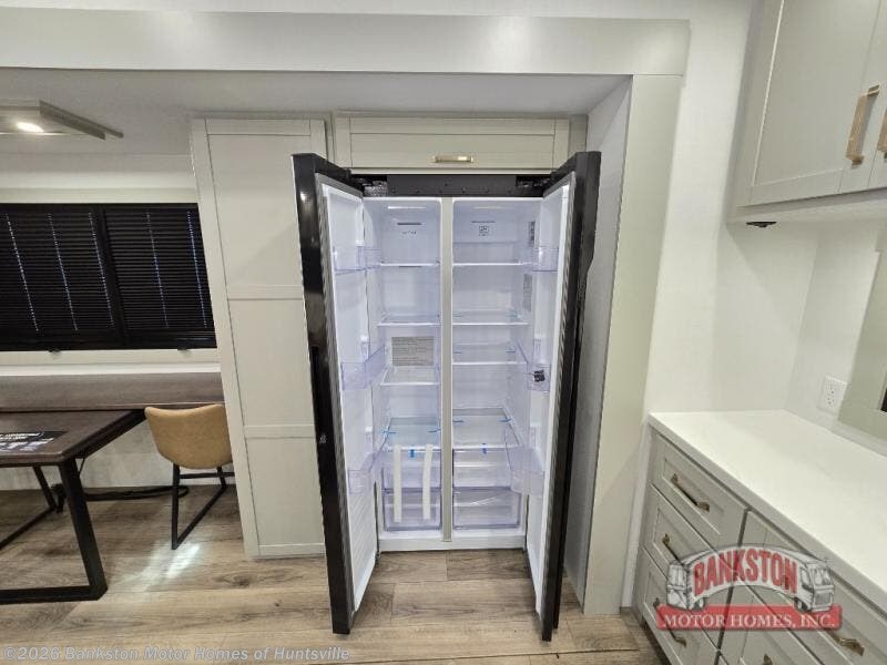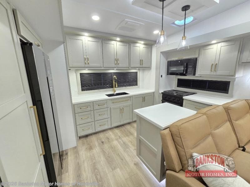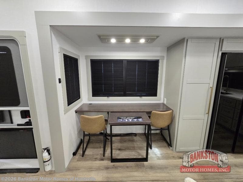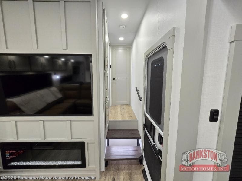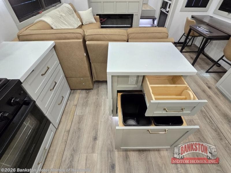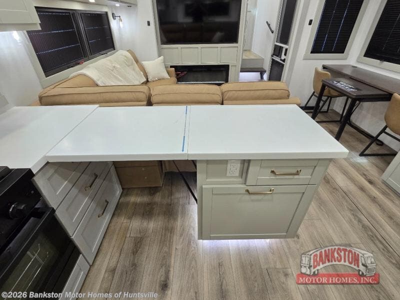 Escape to a world of comfort and luxury with this incredible fifth wheel! The living area features a plush L-sofa, five recliners, and a warm fireplace. The versatile dining table/L desk seats up to four people, making it perfect for meals, work, or play. Ample shoe storage and a convenient spot for pet bowls enhance comfort and practicality. The kitchen offers stunning solid surface countertops, dishwasher prep, a residential microwave, and a three-burner cooktop. The expansive pantry with pull-out drawers provides ample storage for your favorite ingredients and cooking essentials. The full bathroom is a serene oasis, featuring a linen closet for added storage and convenience. The front bedroom is a peaceful sanctuary, featuring a spacious king bed, shelves, and a sliding dresser top with hidden storage. The generous wardrobe and shoe rack provide ample storage for your clothes and shoes.