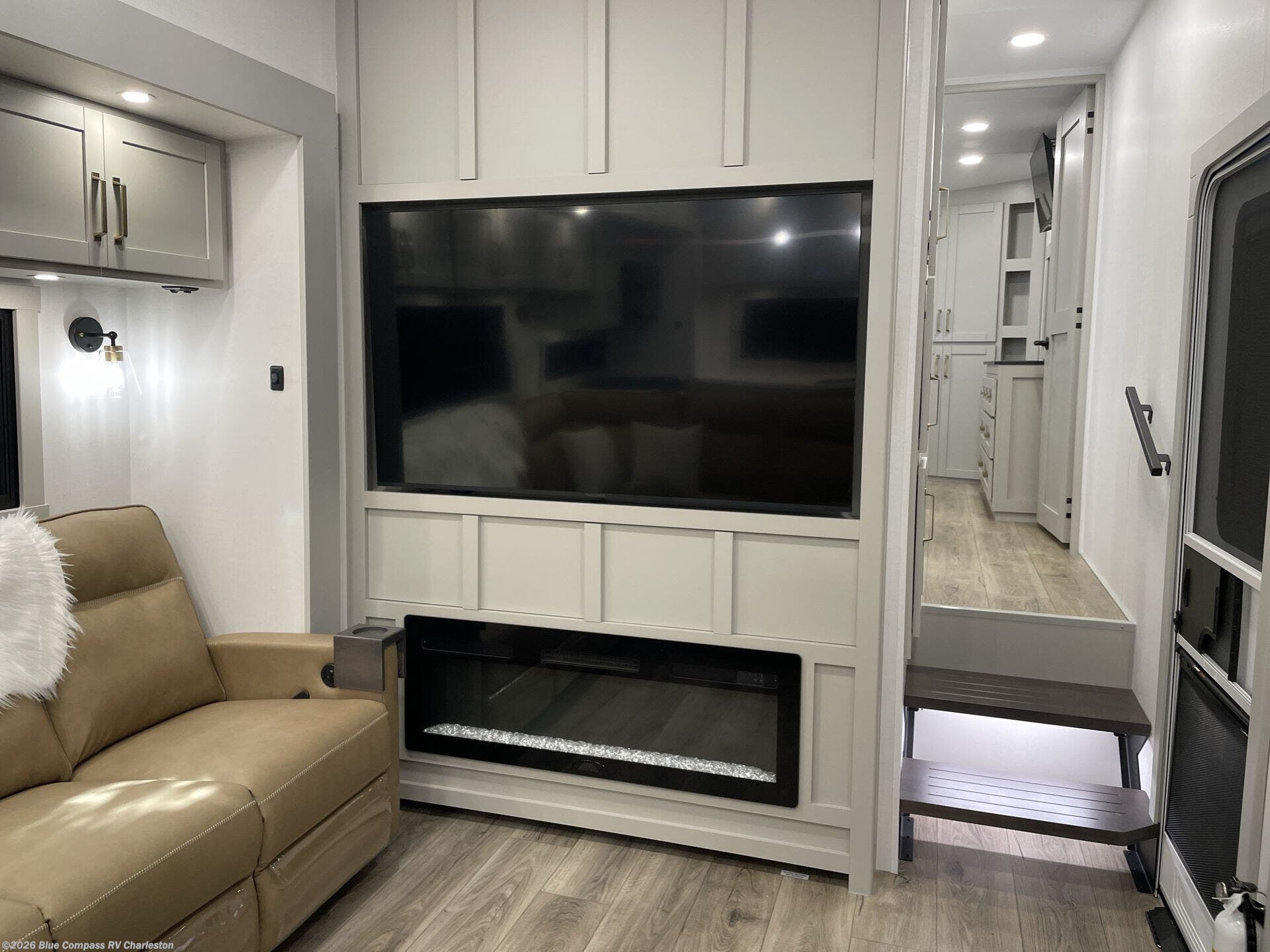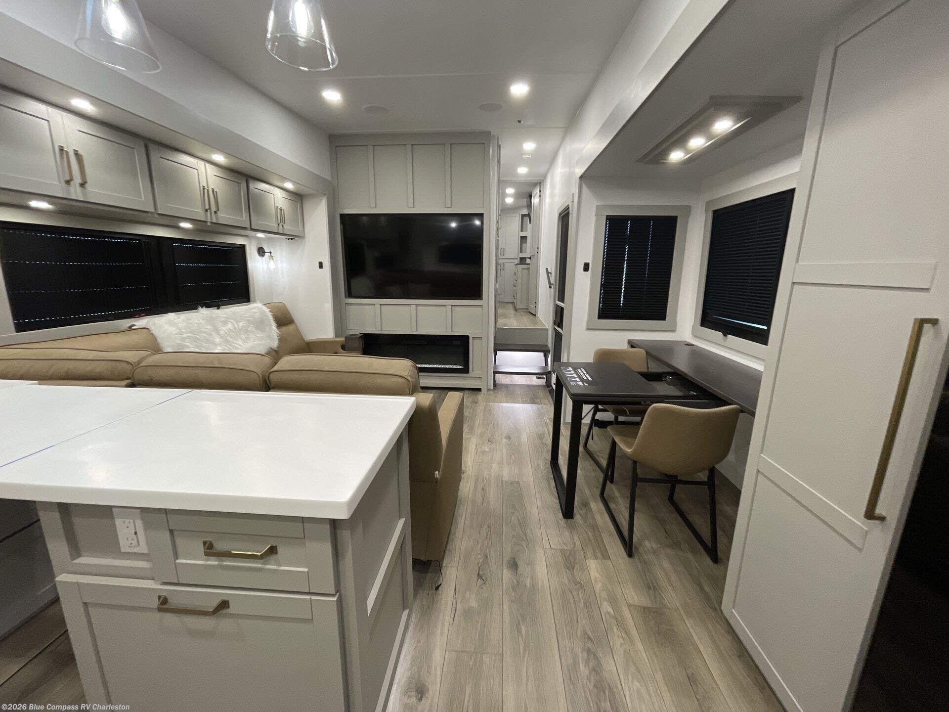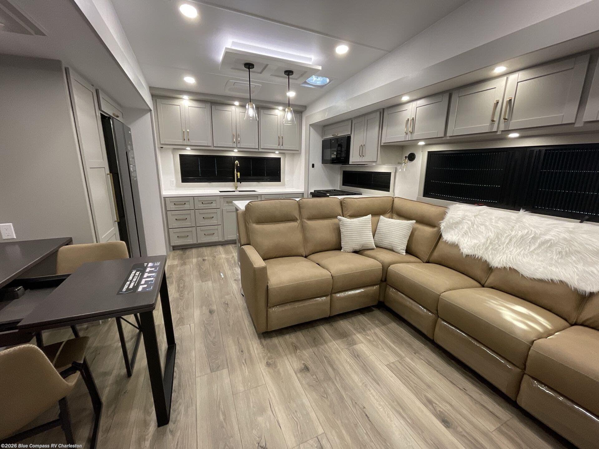 Escape to a world of comfort and luxury with this incredible fifth wheel! The living area features a plush L-sofa, five recliners, and a warm fireplace. The versatile dining table/L desk seats up to four people, making it perfect for meals, work, or play. Ample shoe storage and a convenient spot for pet bowls enhance comfort and practicality. The kitchen offers stunning solid surface countertops, dishwasher prep, a residential microwave, and a three-burner cooktop. The expansive pantry with pull-out drawers provides ample storage for your favorite ingredients and cooking essentials. The full bathroom is a serene oasis, featuring a linen closet for added storage and convenience. The front bedroom is a peaceful sanctuary, featuring a spacious king bed, shelves, and a sliding dresser top with hidden storage. The generous wardrobe and shoe rack provide ample storage for your clothes and shoes.
