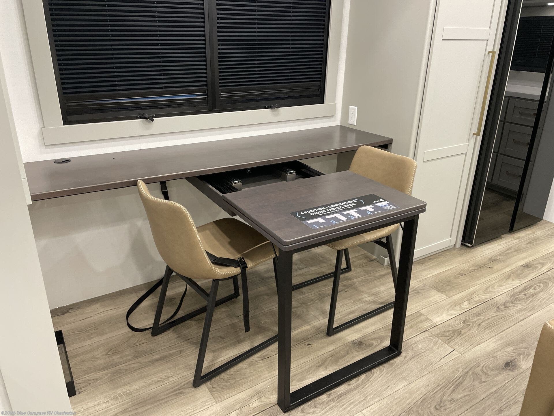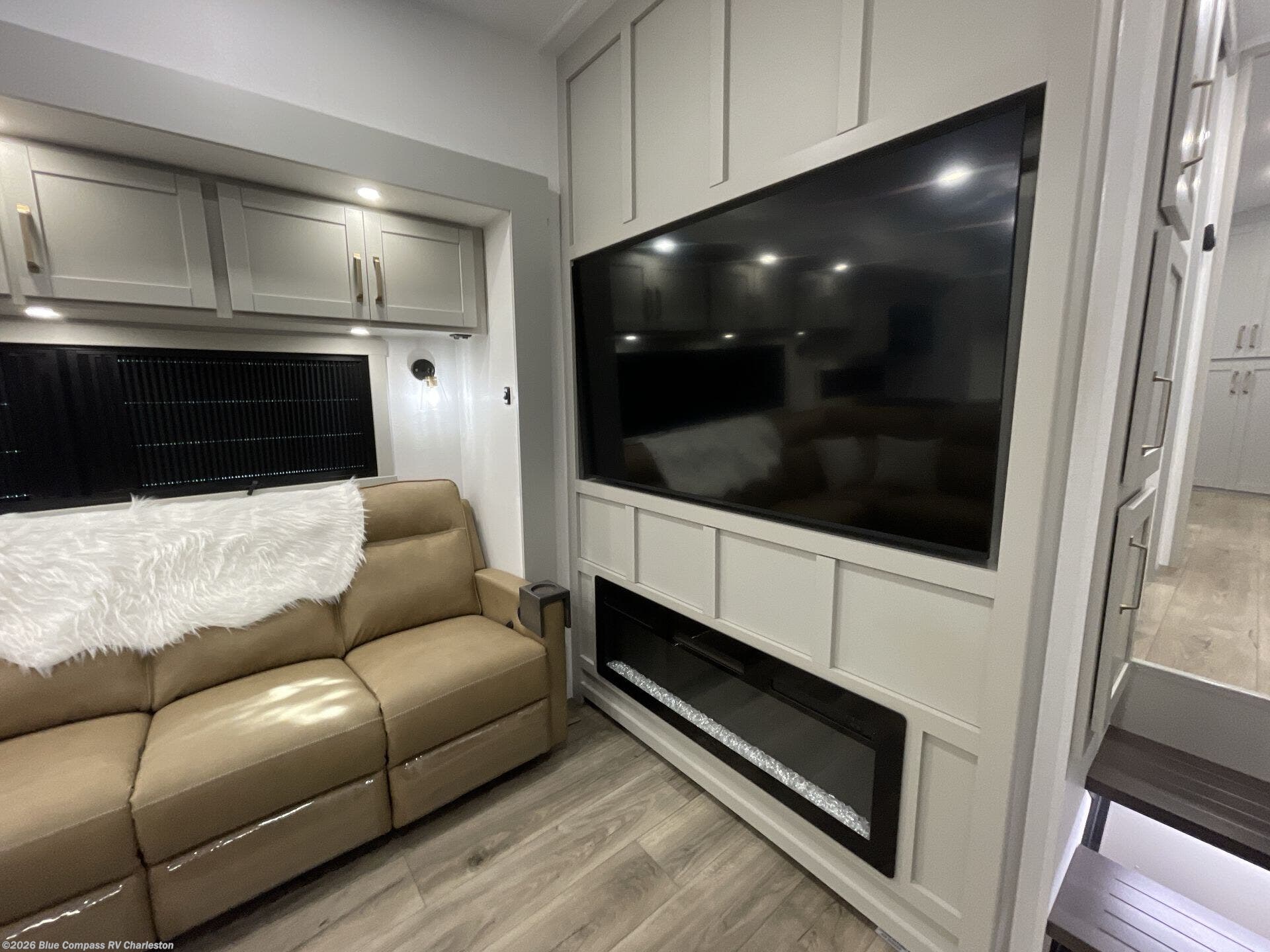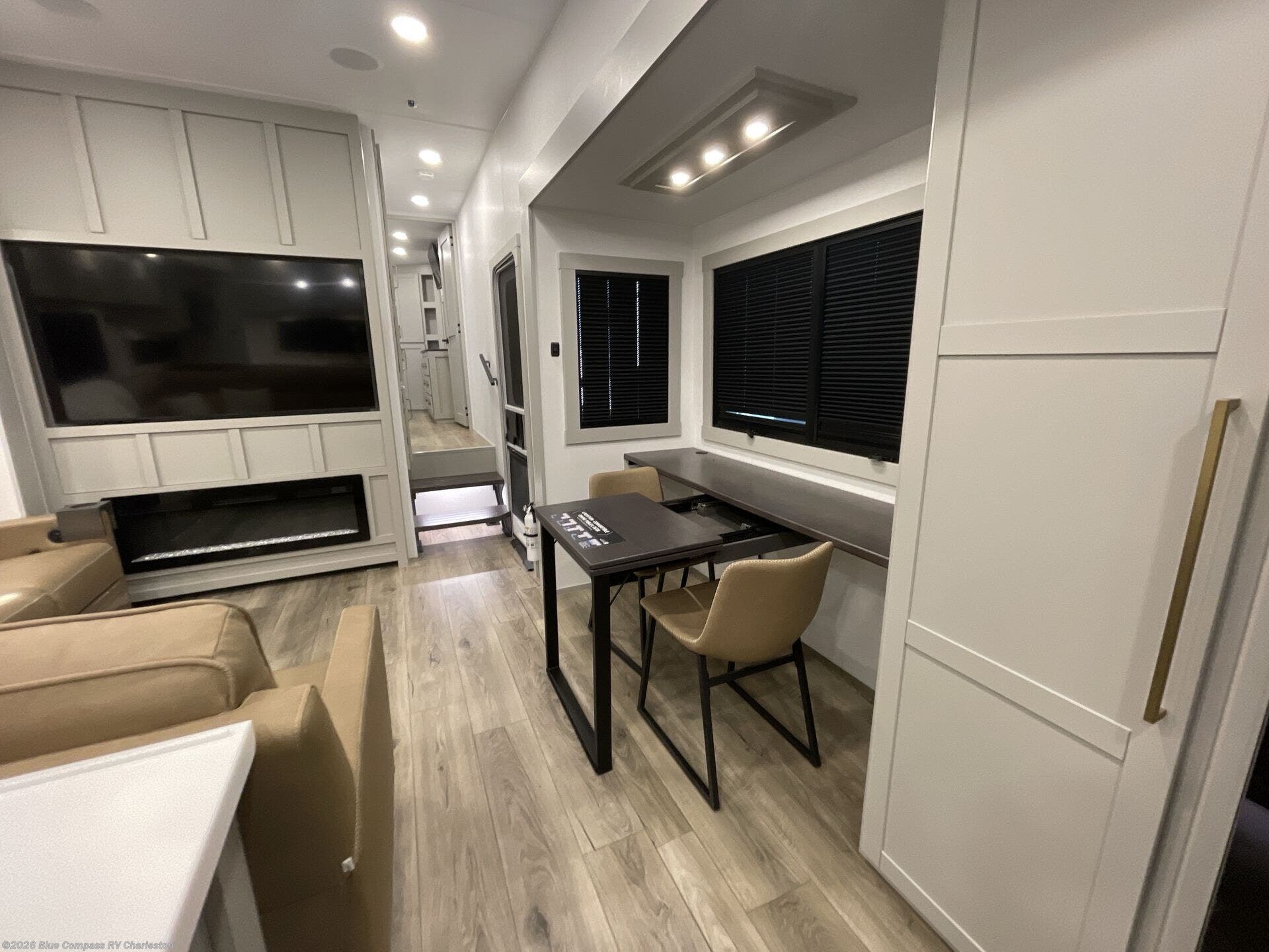 Escape to a world of comfort and luxury with this incredible fifth wheel! The living area features a plush L-sofa, five recliners, and a warm fireplace. The versatile dining table/L desk seats up to four people, making it perfect for meals, work, or play. Ample shoe storage and a convenient spot for pet bowls enhance comfort and practicality. The kitchen offers stunning solid surface countertops, dishwasher prep, a residential microwave, and a three-burner cooktop. The expansive pantry with pull-out drawers provides ample storage for your favorite ingredients and cooking essentials. The full bathroom is a serene oasis, featuring a linen closet for added storage and convenience. The front bedroom is a peaceful sanctuary, featuring a spacious king bed, shelves, and a sliding dresser top with hidden storage. The generous wardrobe and shoe rack provide ample storage for your clothes and shoes.