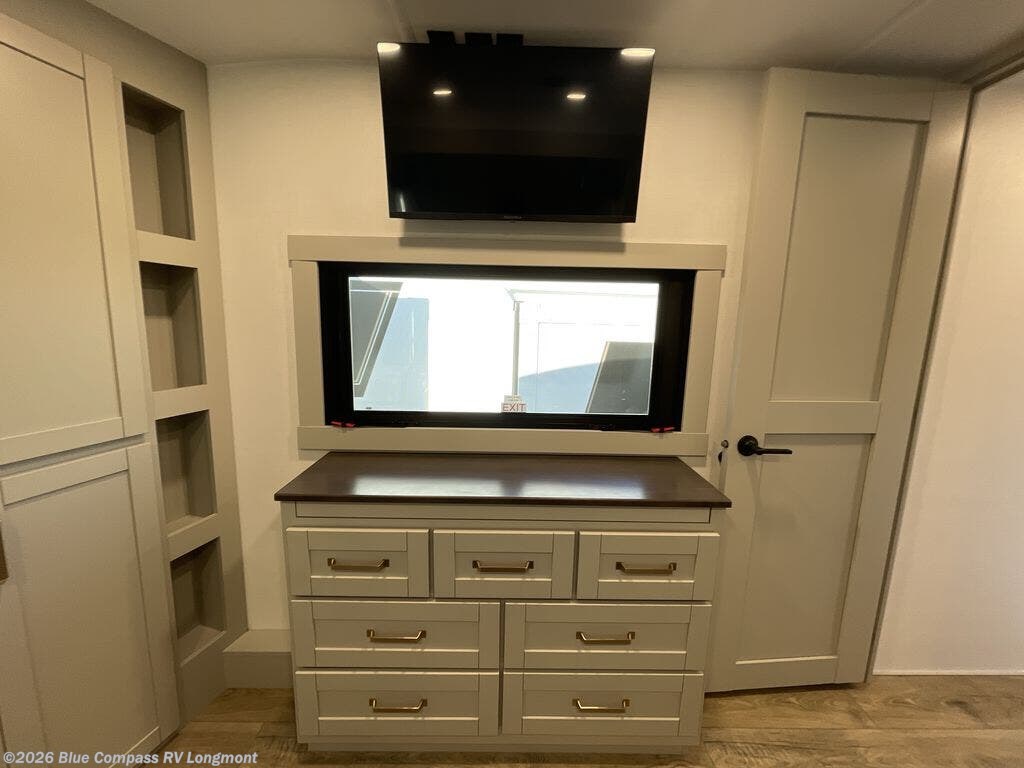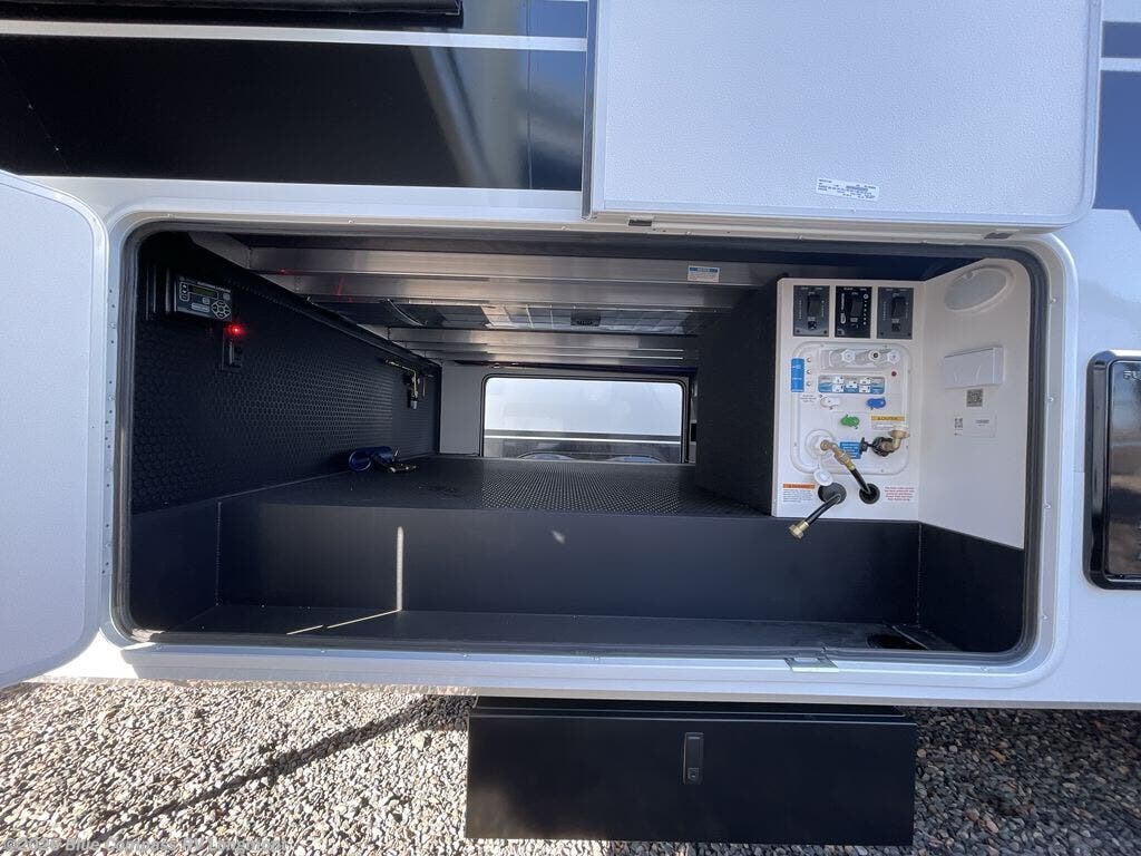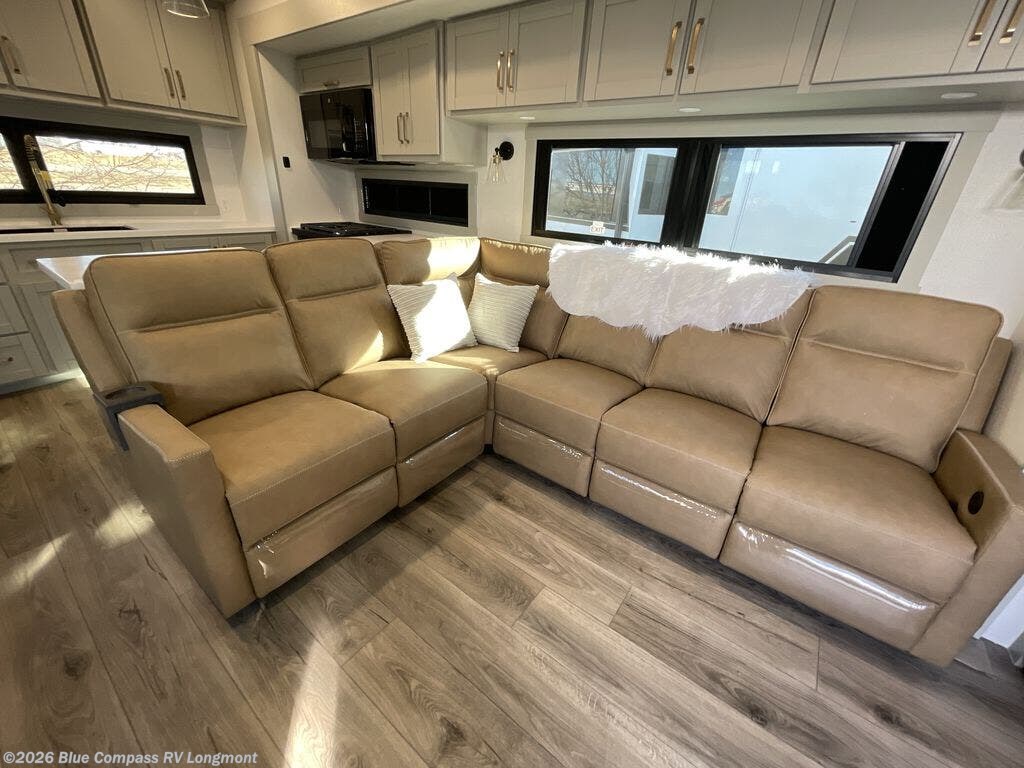Escape to a world of comfort and luxury with this incredible fifth wheel! The living area features a plush L-sofa, five recliners, and a warm fireplace. The versatile dining table/L desk seats up to four people, making it perfect for meals, work, or play. Ample shoe storage and a convenient spot for pet bowls enhance comfort and practicality. The kitchen offers stunning solid surface countertops, dishwasher prep, a residential microwave, and a three-burner cooktop. The expansive pantry with pull-out drawers provides ample storage for your favorite ingredients and cooking essentials. The full bathroom is a serene oasis, featuring a linen closet for added storage and convenience. The front bedroom is a peaceful sanctuary, featuring a spacious king bed, shelves, and a sliding dresser top with hidden storage. The generous wardrobe and shoe rack provide ample storage for your clothes and shoes.