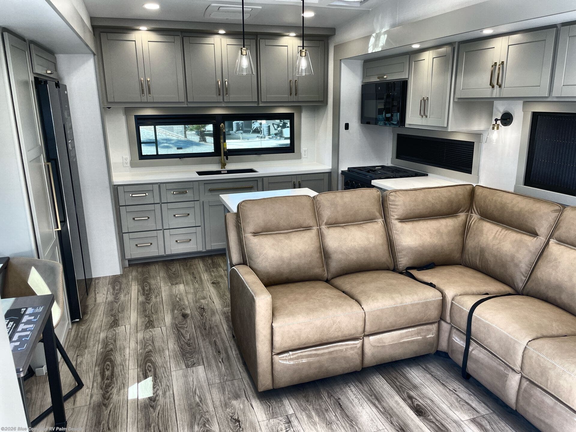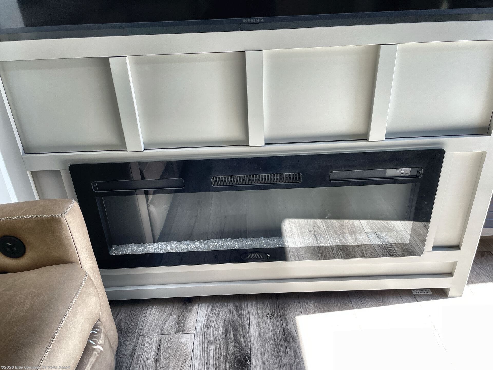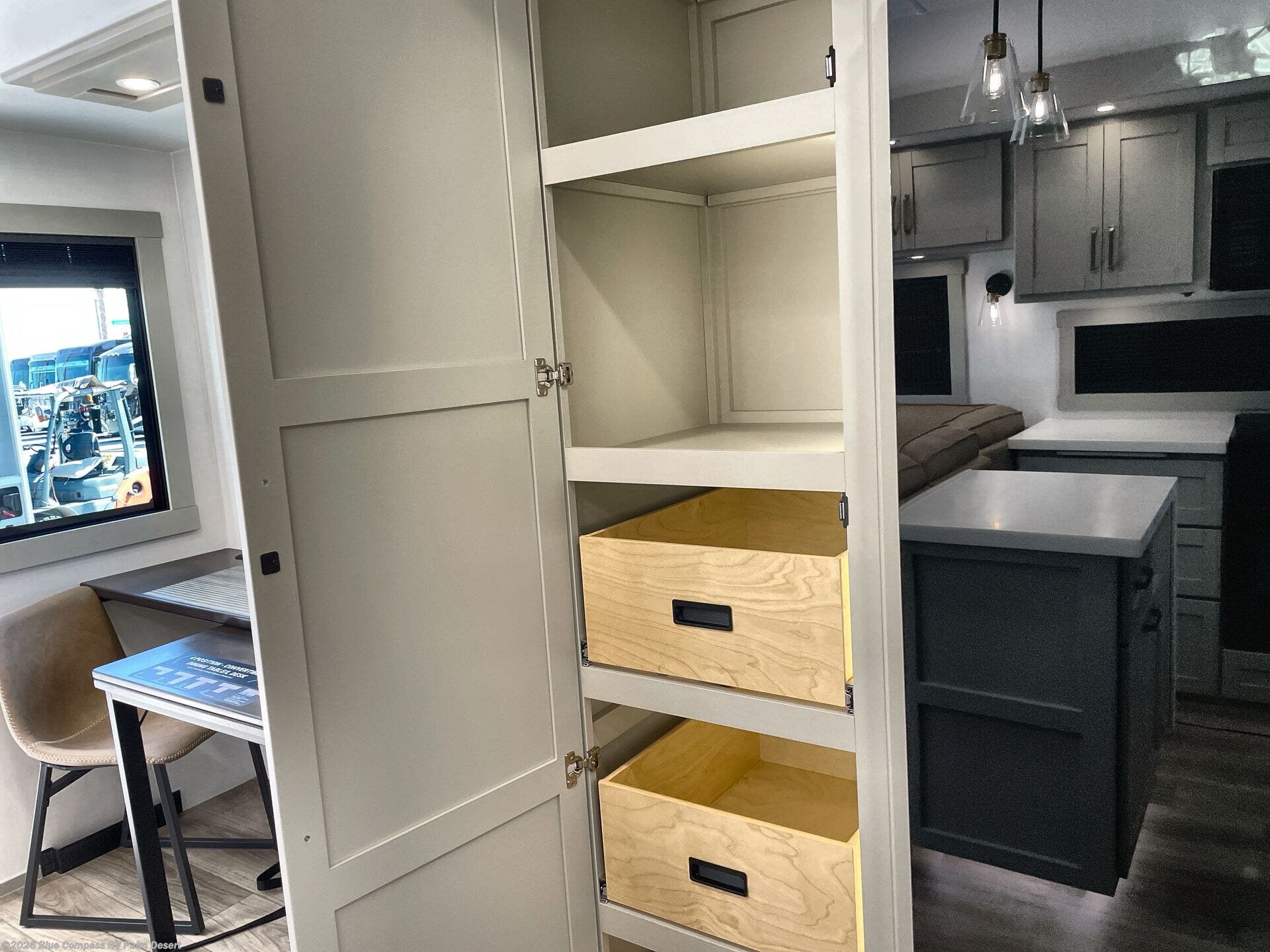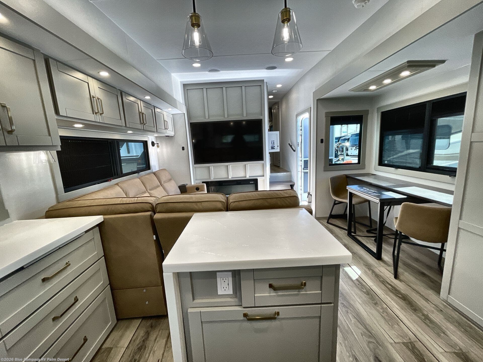 Escape to a world of comfort and luxury with this incredible fifth wheel! The living area features a plush L-sofa, five recliners, and a warm fireplace. The versatile dining table/L desk seats up to four people, making it perfect for meals, work, or play. Ample shoe storage and a convenient spot for pet bowls enhance comfort and practicality. The kitchen offers stunning solid surface countertops, dishwasher prep, a residential microwave, and a three-burner cooktop. The expansive pantry with pull-out drawers provides ample storage for your favorite ingredients and cooking essentials. The full bathroom is a serene oasis, featuring a linen closet for added storage and convenience. The front bedroom is a peaceful sanctuary, featuring a spacious king bed, shelves, and a sliding dresser top with hidden storage. The generous wardrobe and shoe rack provide ample storage for your clothes and shoes.